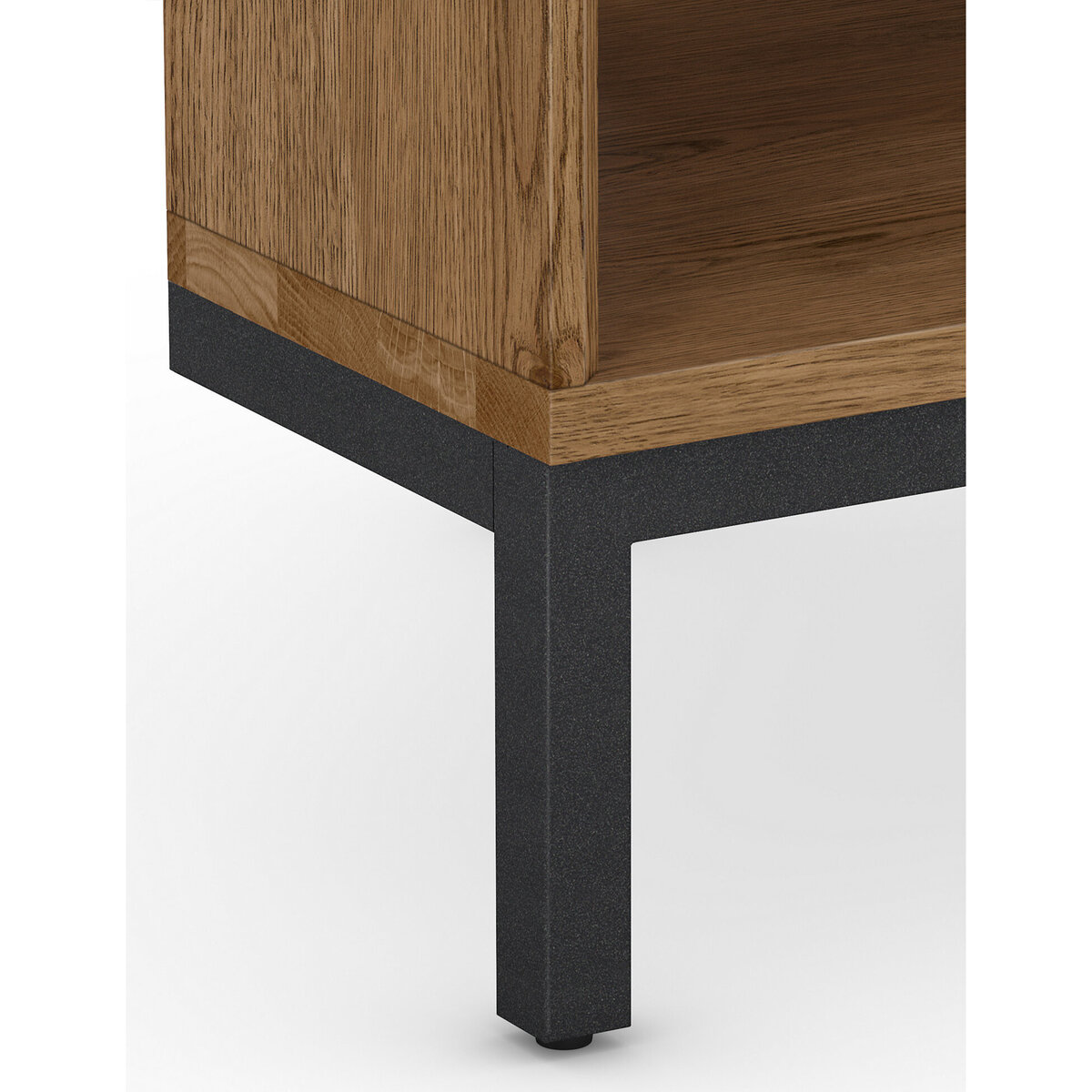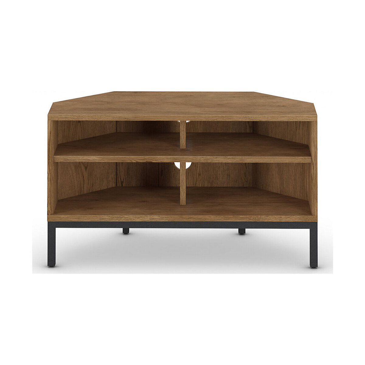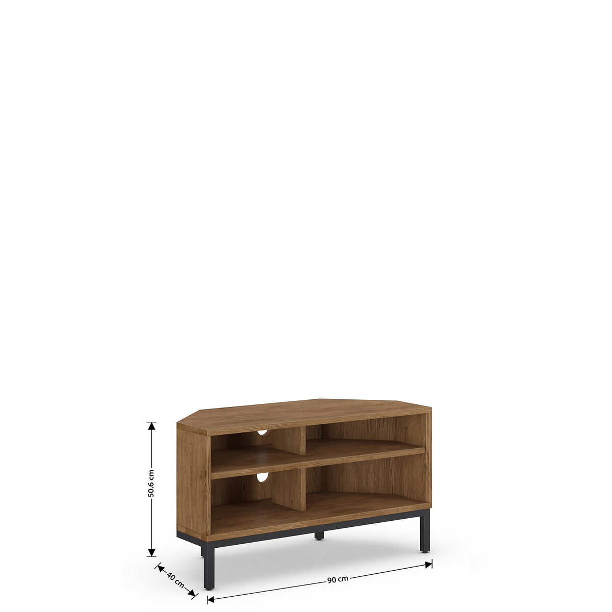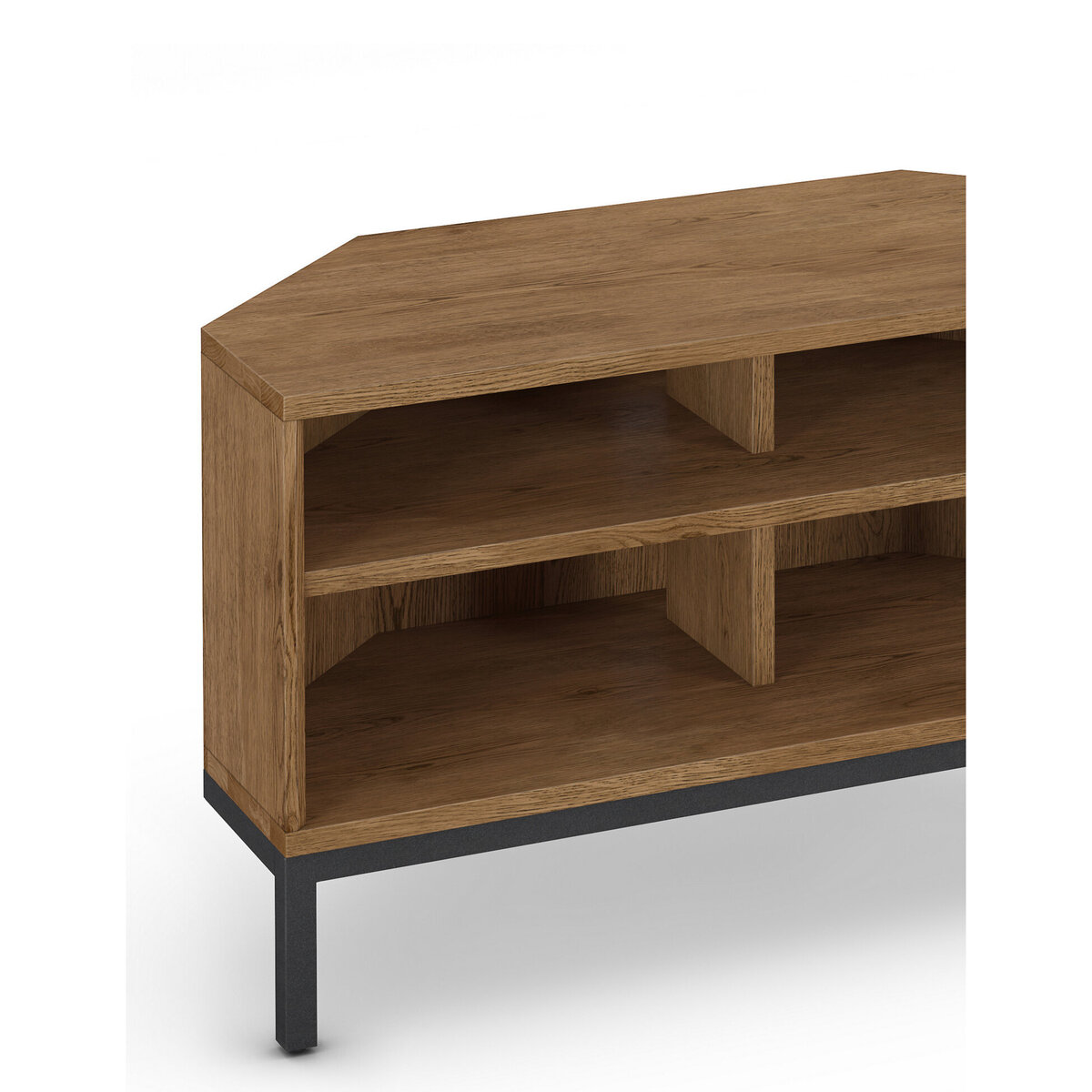 This modern TV unit from our Brookland range is specially designed for corner spaces. It's crafted from hardwearing chipboard with a real oak-veneer finish and has dark metal detailing. The sleek industrial aesthetic will work well in many spaces, and there's two handy shelves for extra storage. Openings at the back help to keep cables and wires out of the way. Matching Brookland items are available.
