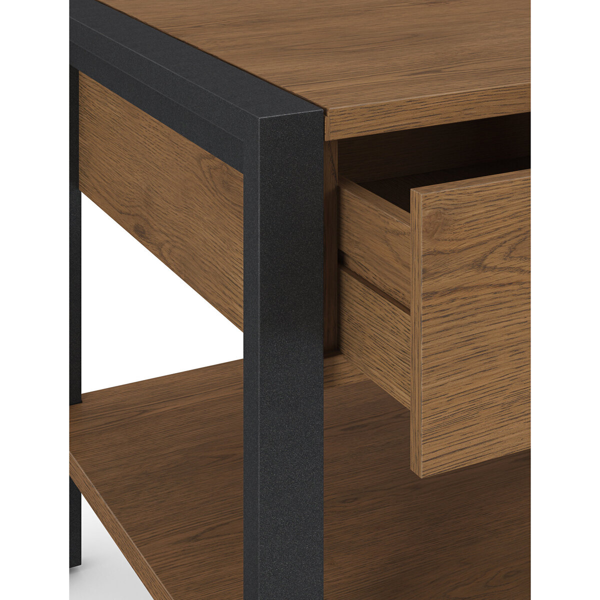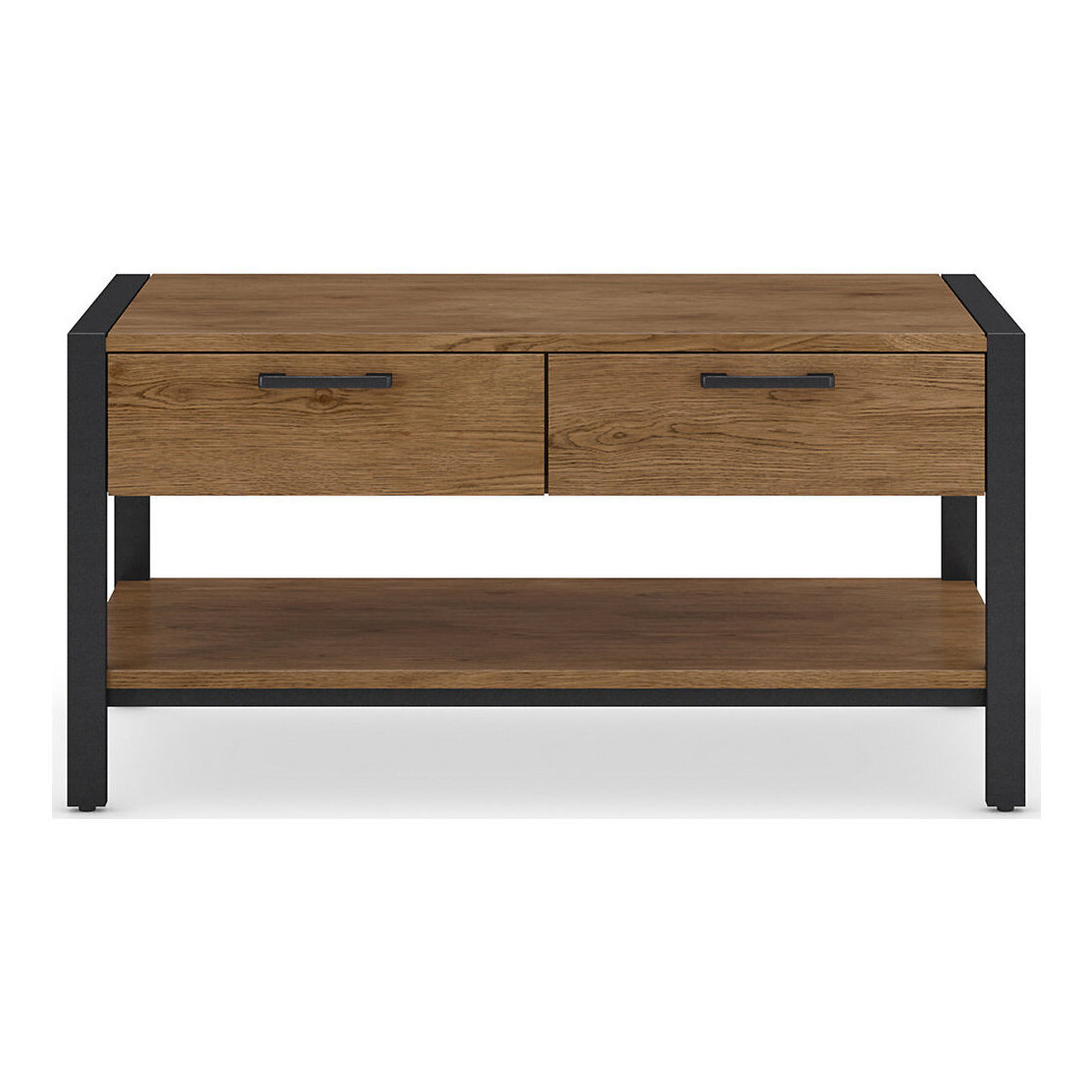 This sleek and stylish coffee table from our Brookland range will be the star of your living room. Its real oak veneer top creates a natural feel that will add warmth to your space, with the contrast metal frame and legs bringing an on-trend industrial element. This piece has two drawers for extra storage, finished with modern thin handles. Matching Brookland pieces are available.