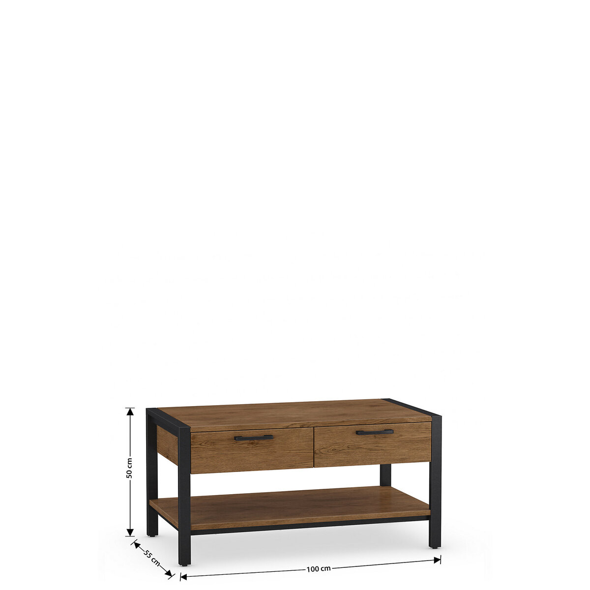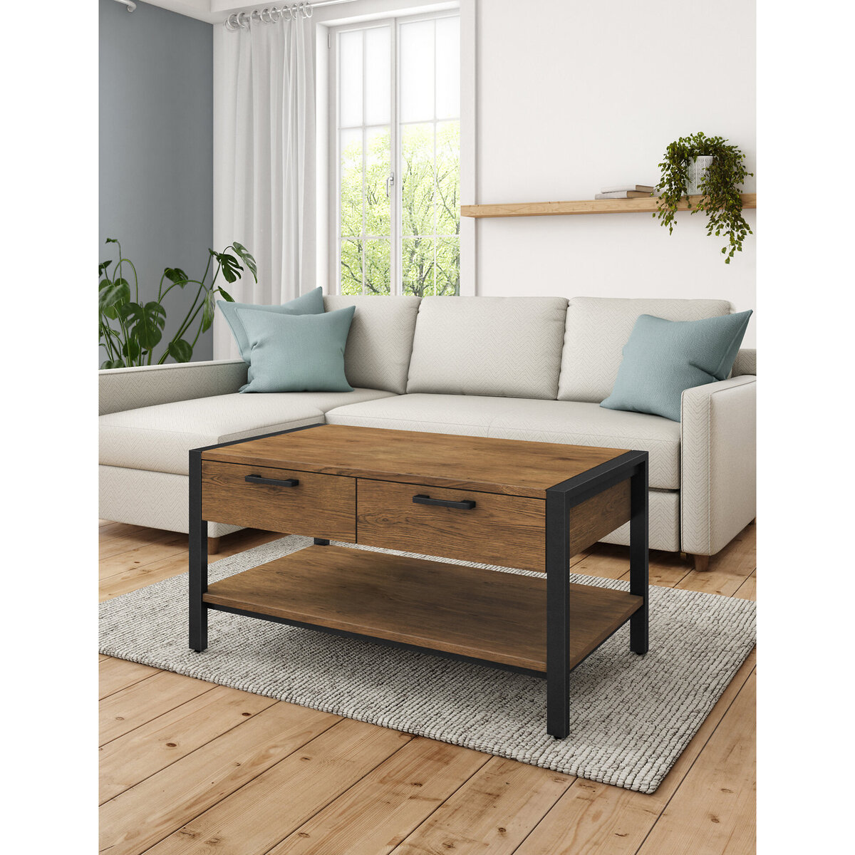 I really like this coffee table because of its balanced mix of natural wood and matte black details, which creates a versatile appeal. It works particularly well in industrial, modern, or Scandinavian interiors, adding warmth without sacrificing sleekness. The compact size makes it practical for smaller living rooms or open-plan spaces, and the drawers offer handy storage for remote controls or Coasters. Style it with a cosy throw and some decorative trays or vases on top for an inviting yet functional look. Its straightforward design makes it easy to pair with a range of colour schemes and furniture styles, making it a flexible addition to most living rooms.