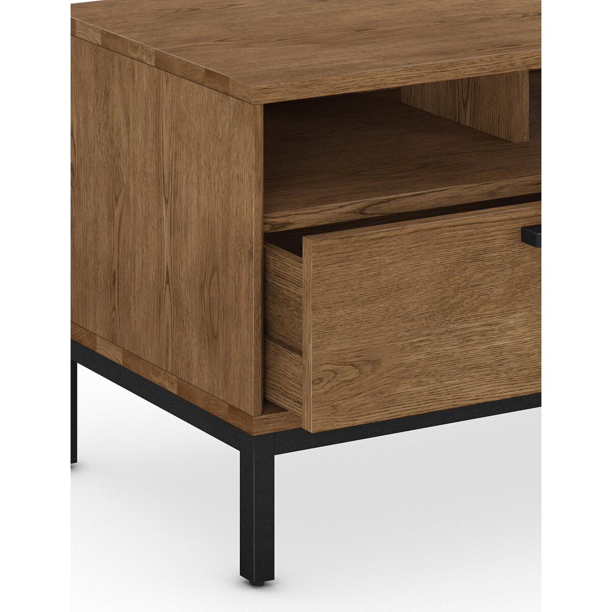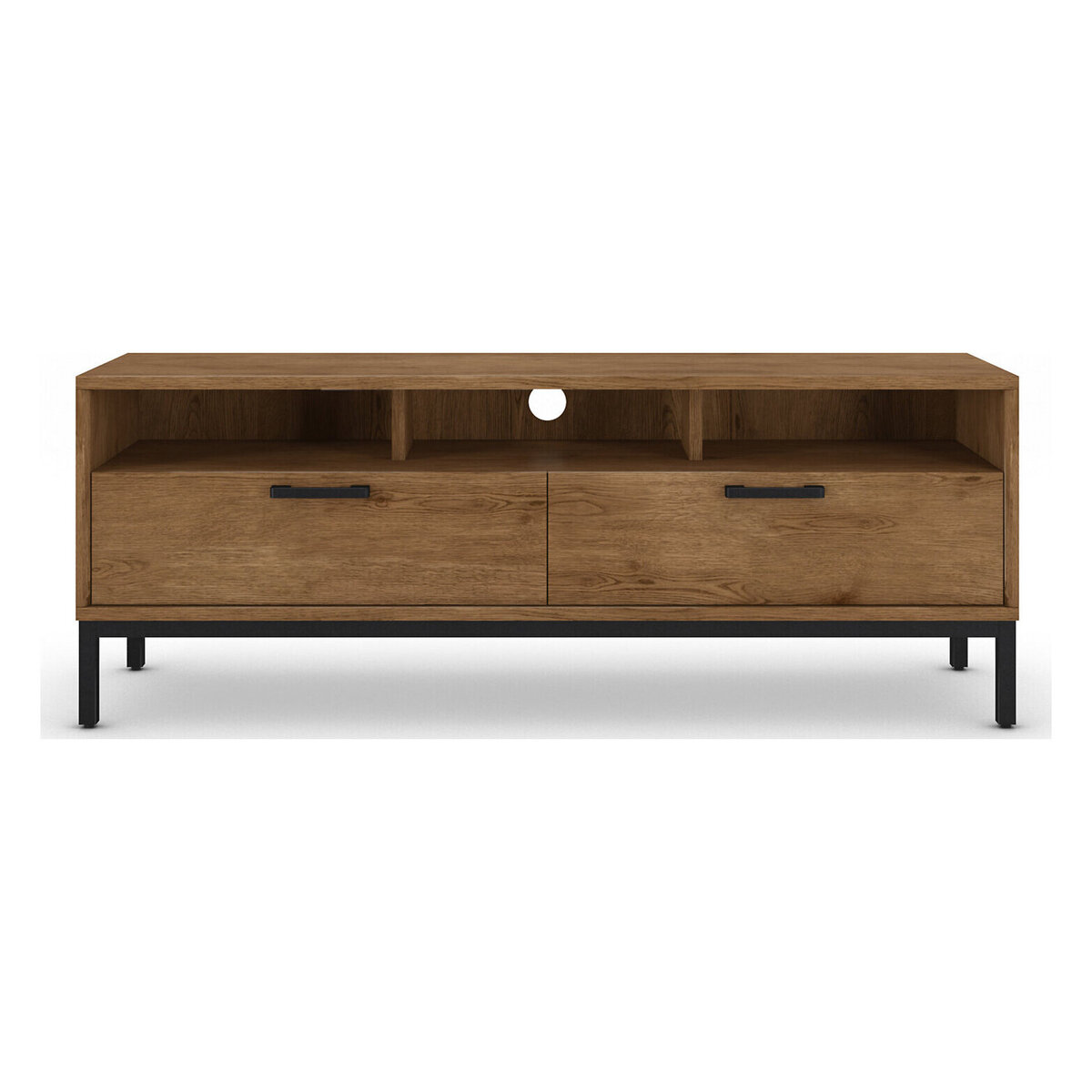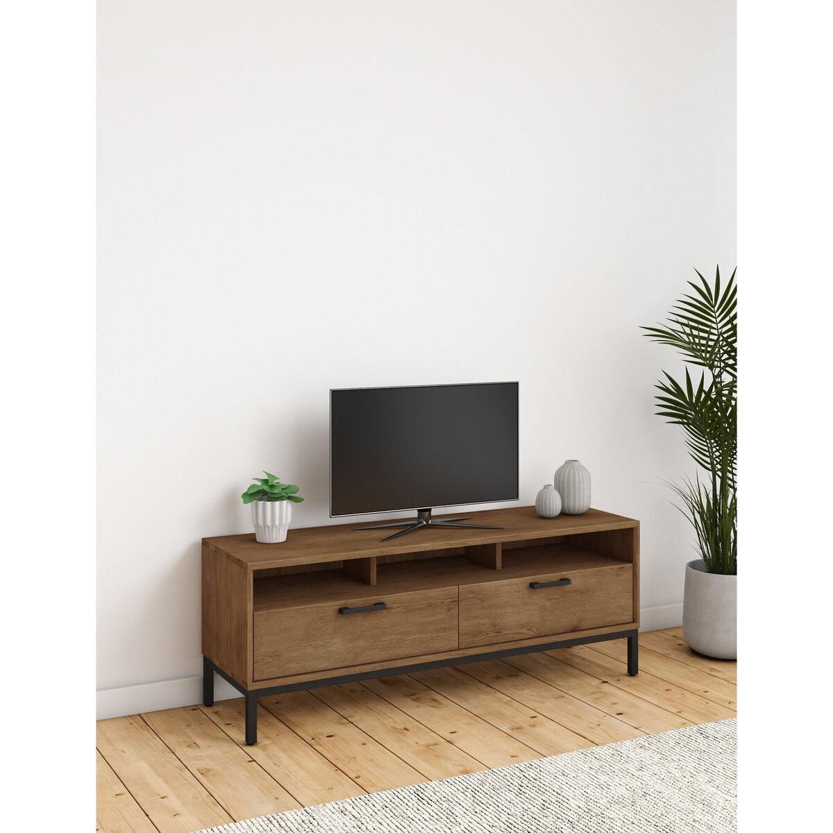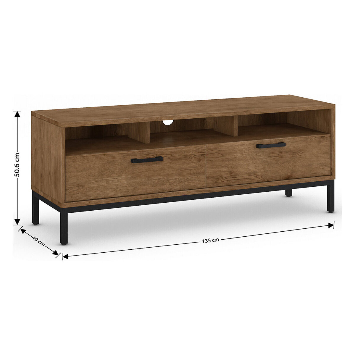 Our Brookland TV unit is a smart entertainment and storage solution for modern homes. It boasts plenty of room, including three open compartments perfect for consoles and boxes, plus a space at the back to keep cables organised. There are also two large drawers for anything you prefer tidied away. A wooden real oak veneer top brings a warm finish to this piece, alongside sturdy industrial-style metal legs and handles. Matching Brookland pieces are available.