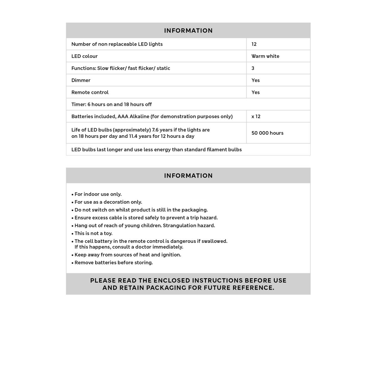 Realistic wax-drip detailing and a flame-shaped bulb make these candles a dazzling addition to your Christmas decorations. Designed for indoor use, each light in this 12-pack has a handy crocodile clip for quick and easy fastening. Create the perfect atmosphere and mood for your home with the remote control timer.