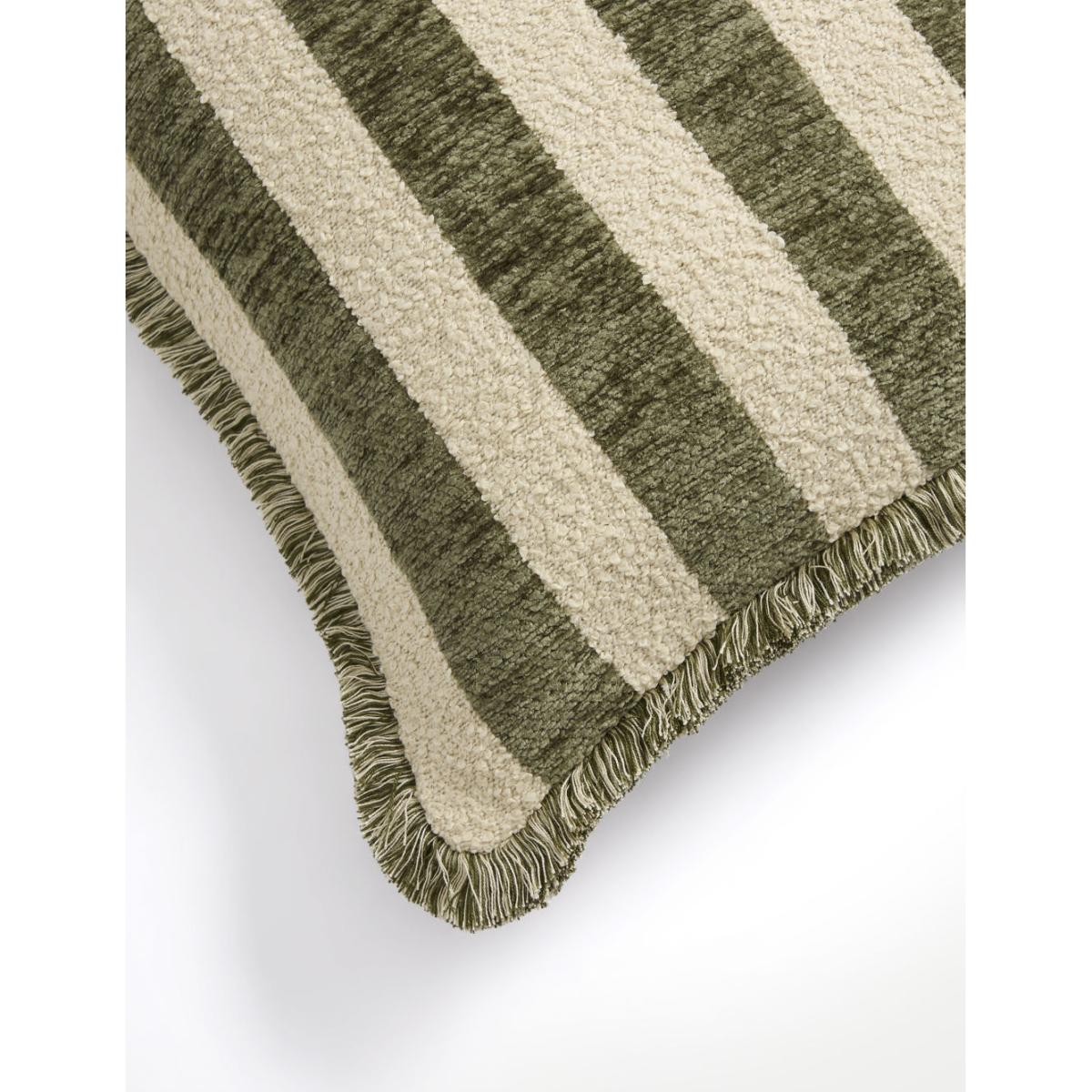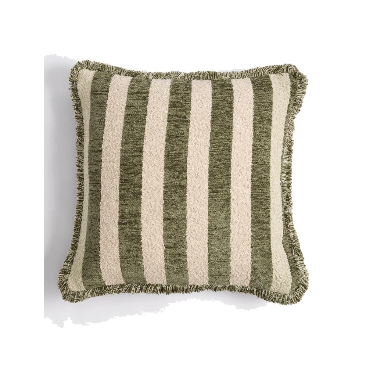 I really like this cushion - it's a great way to introduce texture and colour into a space without overwhelming it. The striped chenille fabric adds a luxurious softness and visual interest, making it versatile for both modern and more traditional interiors. I’d suggest pairing it with neutral-toned sofas or armchairs to let the green and cream stripes really stand out, but it also works well mixed with other patterns for a more eclectic look. Practical styling tips include using the fringed edge to add a relaxed, cosy vibe, and placing it alongside other cushions with different textures or subtle patterns to create layered styling on a sofa or bed. It’s a tidy, adaptable piece that can elevate any seating area.