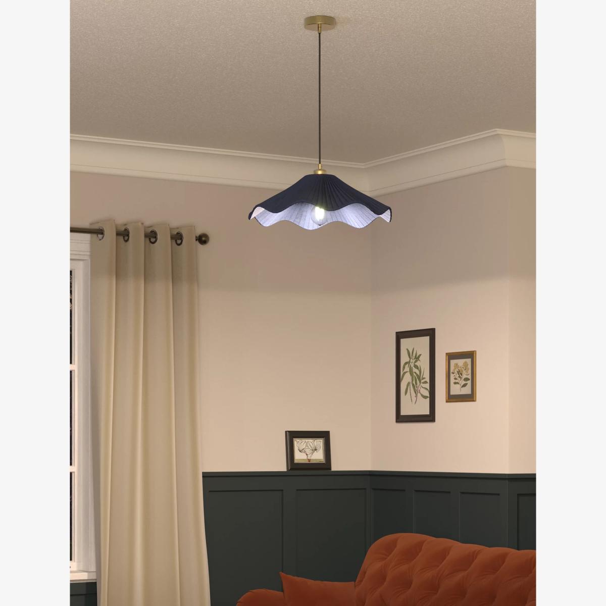 The Chloe pendant ceiling light brings a contemporary take to a classic design. The pleated fabric shade has an undulating form for a stylish look. It hangs on a fabric-braided cord from a smart metal fitting.