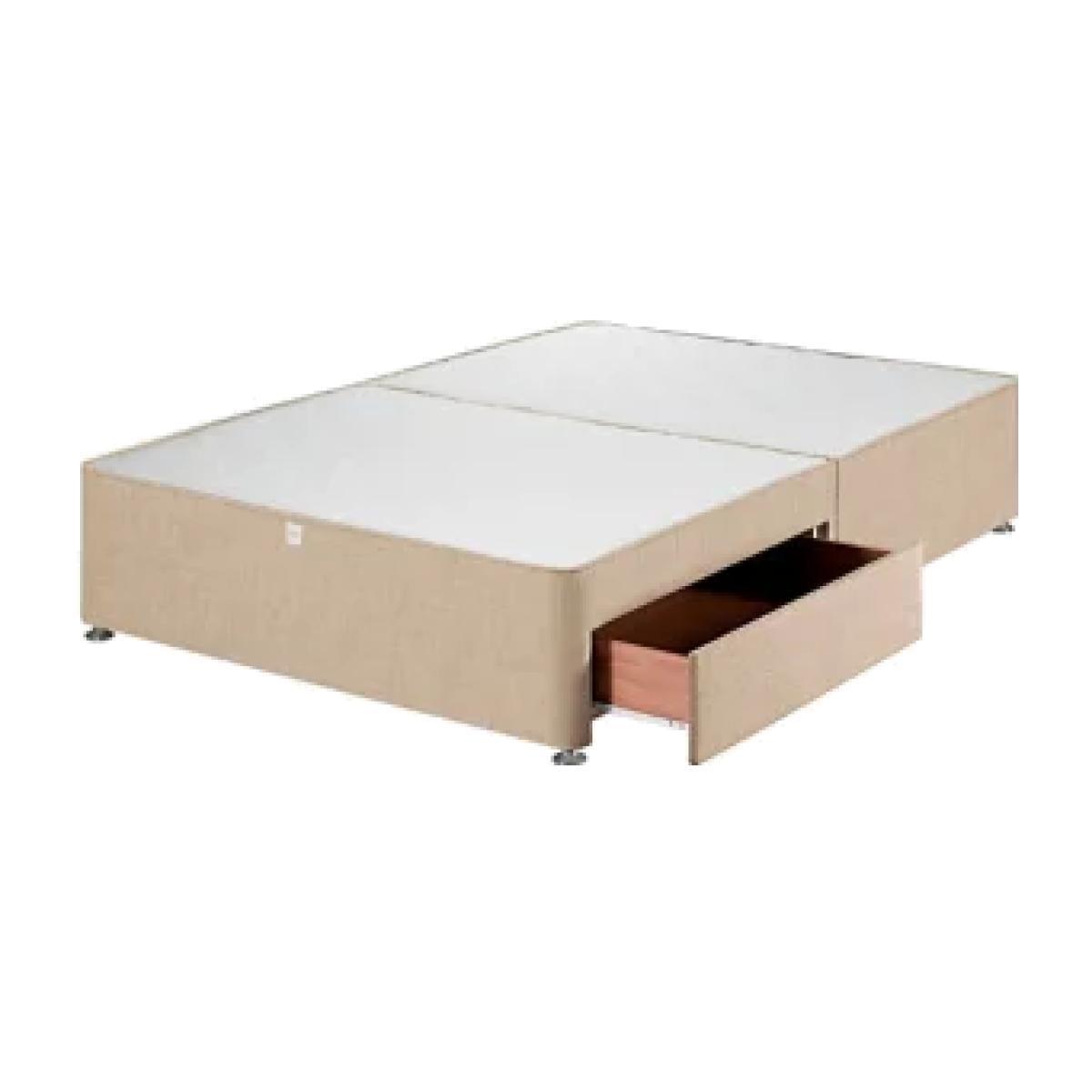 Your bedroom should be a sanctuary and divan beds with storage are the perfect way to keep the space clean and clutter-free. Our divan bed has two drawers for the perfect storage solution. Robustly constructed using high quality, sustainable wood, you can be sure of this base’s endurance, while chrome-look feet add a degree of sleekness to this practical design. Offering a sturdy surface, this firm top divan bed translates into a more solid feel to your mattress.