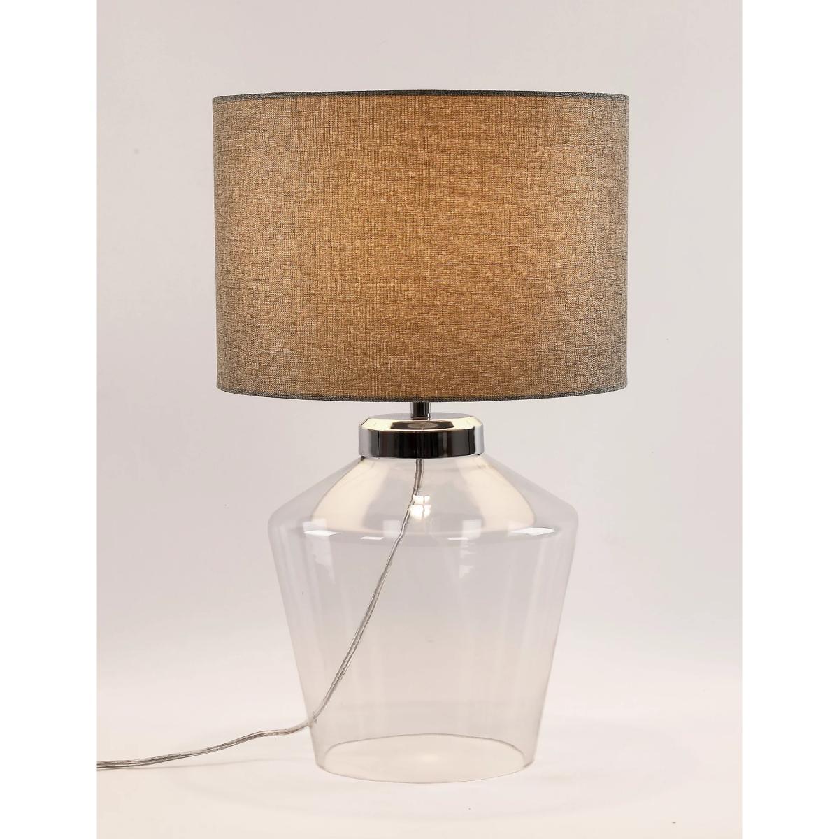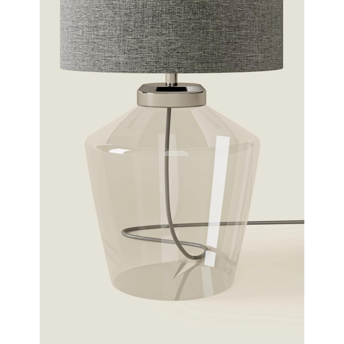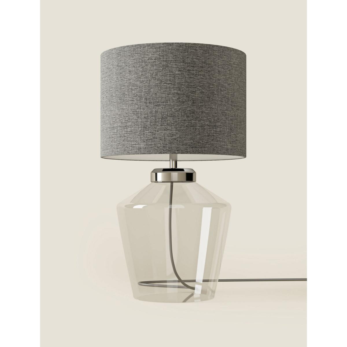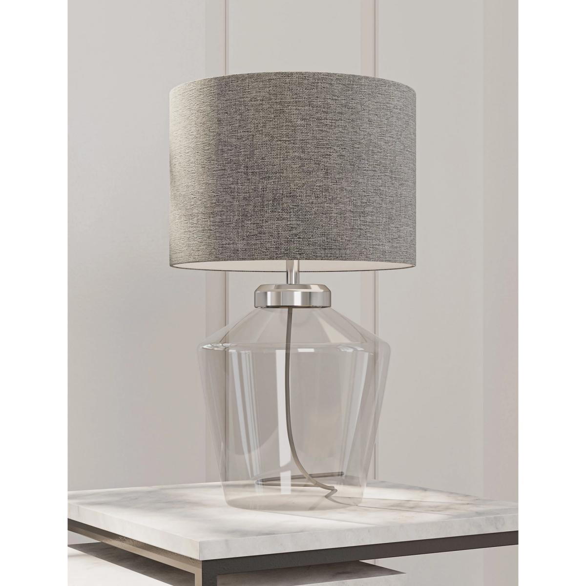 I love this lamp for its simple yet sophisticated design. The clear glass base combined with the silver accents makes it versatile, suited to both contemporary and classic interiors. It works particularly well in living rooms or bedside tables, adding a touch of understated elegance without overwhelming the space. For styling, consider pairing it with neutral-toned furnishings for a modern vibe, or mix with textured fabrics and metallic accessories to create a layered look. Its size and neutral palette make it a flexible choice, and the grey fabric shade helps diffuse light softly, making it perfect for creating a calm atmosphere.