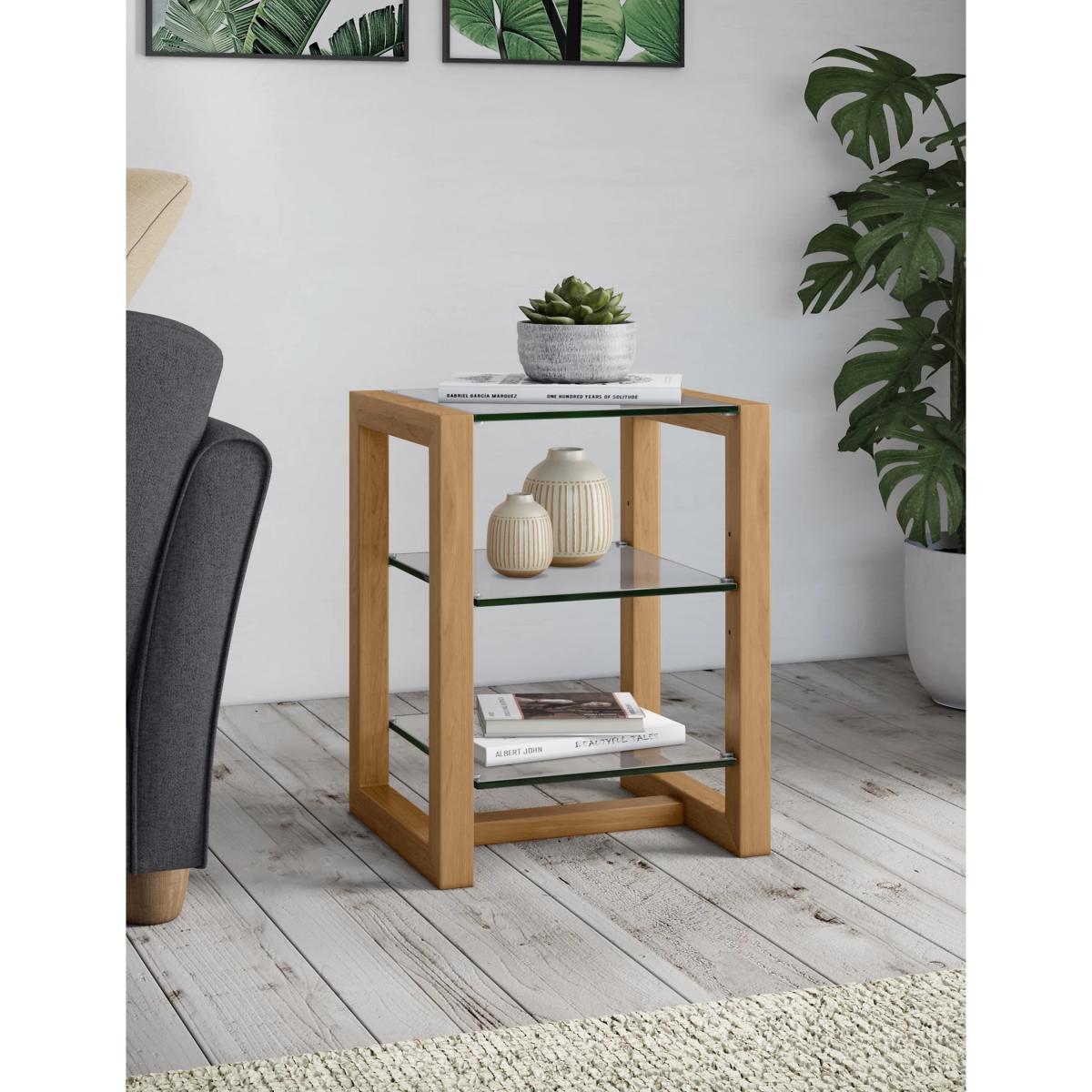 Transform your living space with our sleek Colby side table where sharp lines and contemporary features are key. Take some time to appreciate the beauty of simple geometry by adding this stylish table to your home. A glass surface and glass shelves make for an open design that brings lightness and a modern feel to any living room. A perfect place to rest your coffee or to showcase your favourite trinkets, this glass side table is a stunning addition to any modern home.
