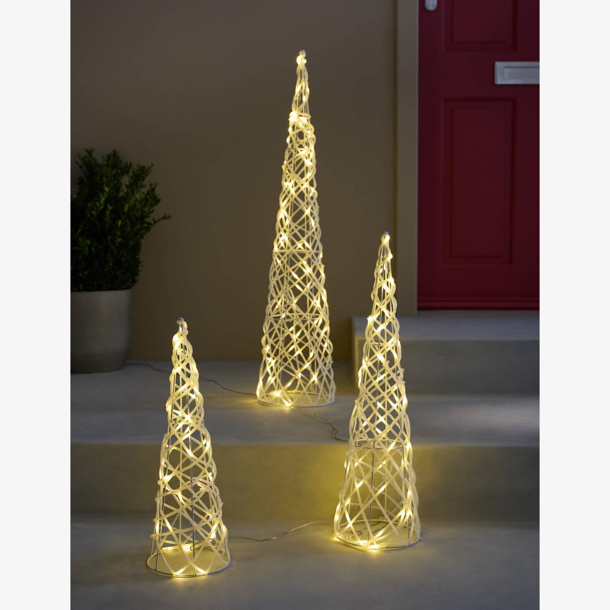 Lend a modern touch to your Christmas decorations with this set of outdoor lights. It includes three cone-shaped trees in different sizes, crafted from wire LED lights wrapped around for a warm, welcoming glow. Mains operated.