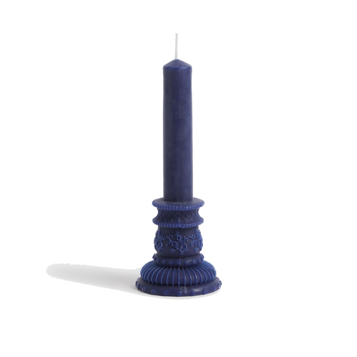 Add an elegant touch to your dinner table with this elaborate candle. It's crafted from wax, featuring a pillar-shaped piece on top of a decorative base, designed to look like a carved candlestick.