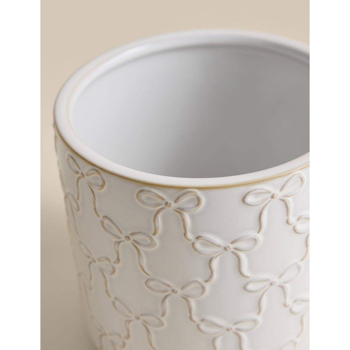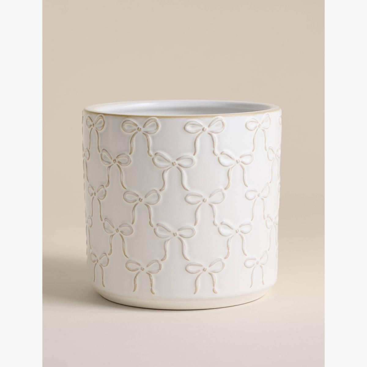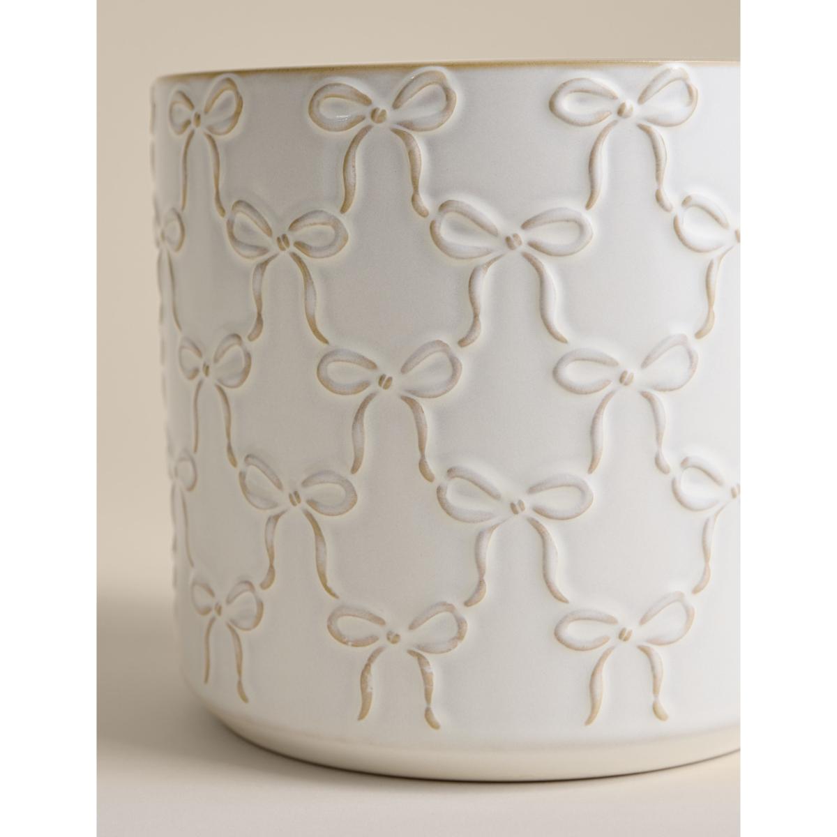 Choose this timeless planter to add a fun feel to your favourite house plant. The rounded design is crafted from durable ceramic and is complete with an embossed bow pattern that adds a touch of playful texture.