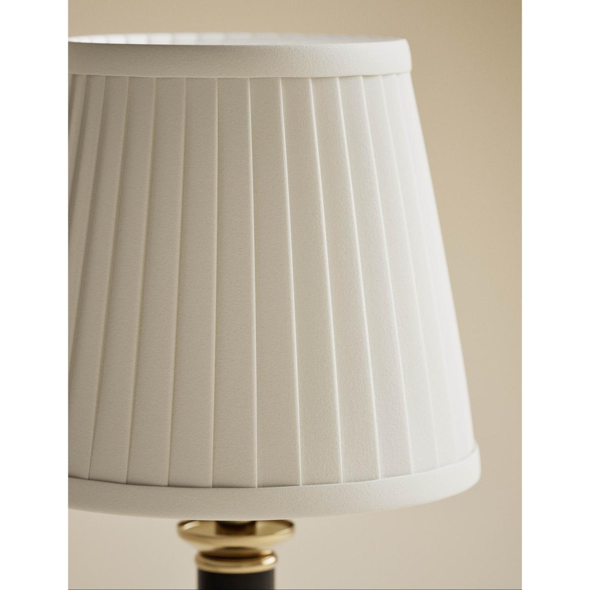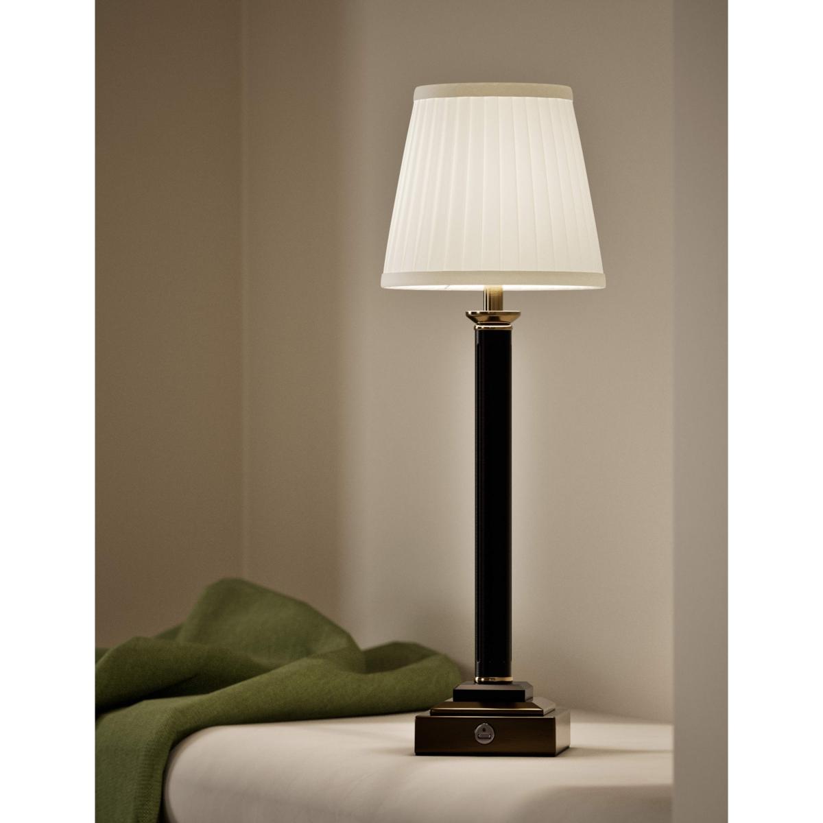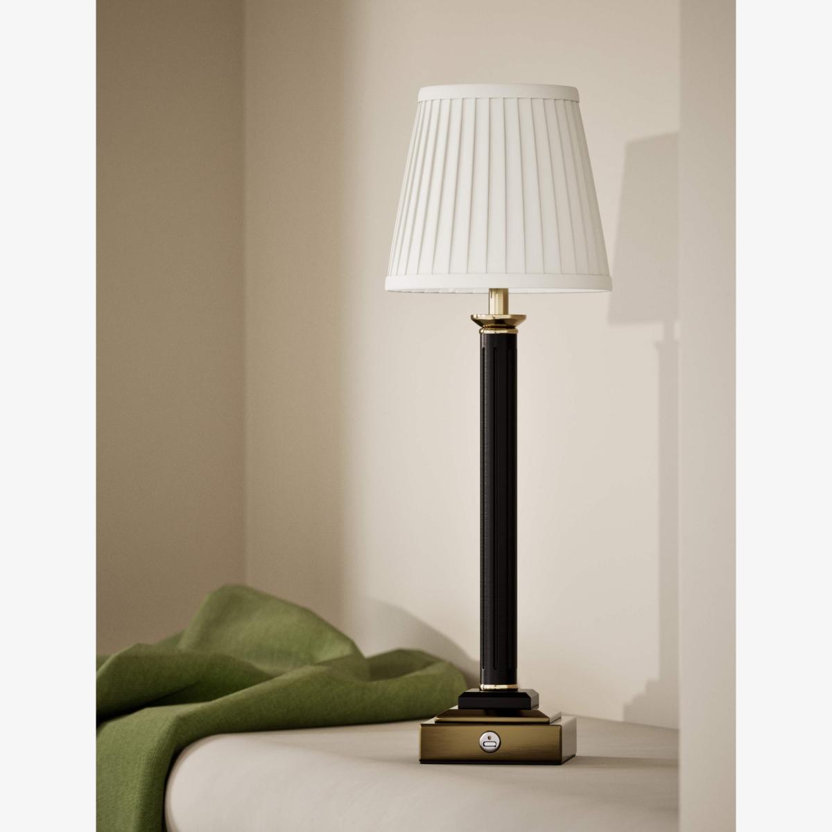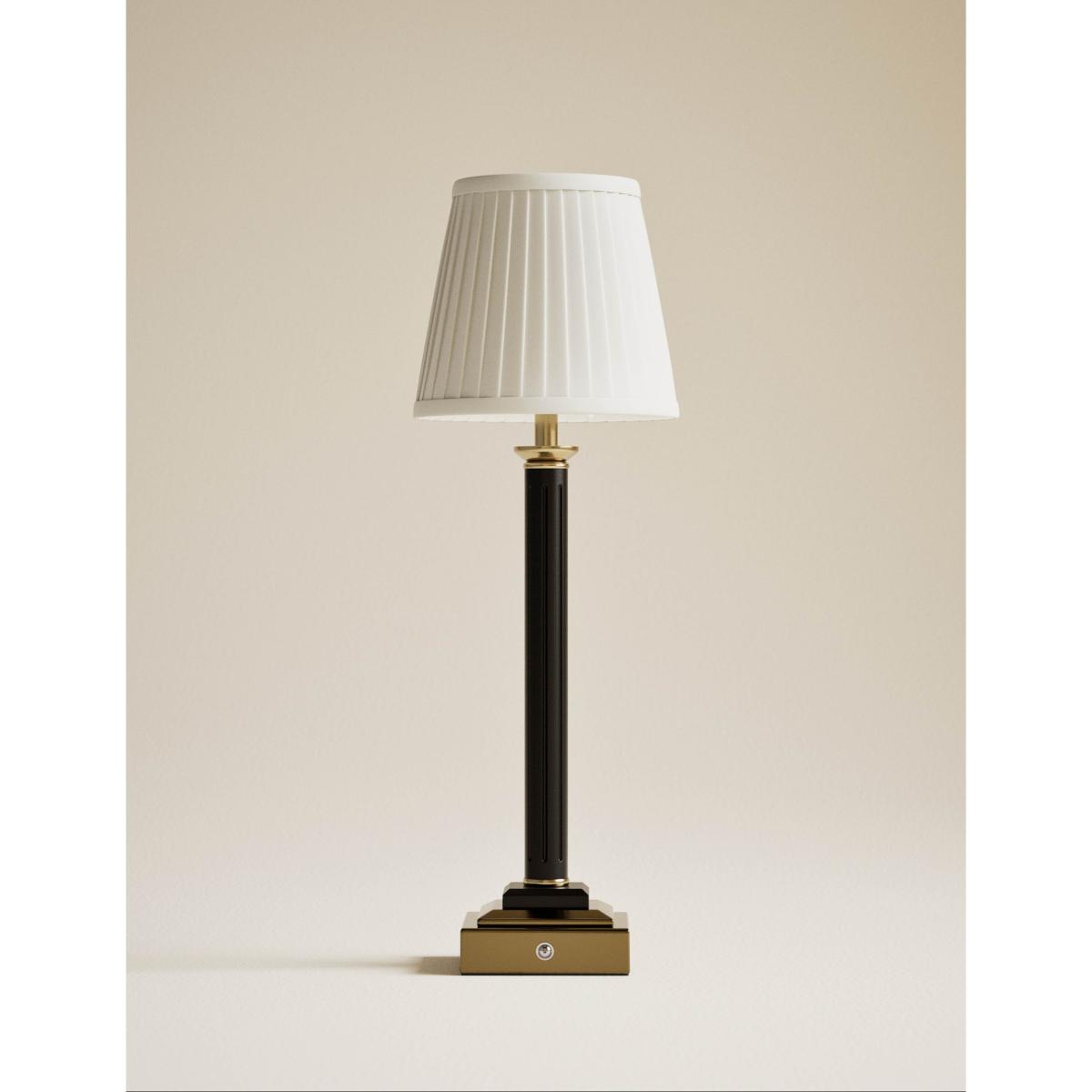 This rechargeable table lamp is a graceful addition to your bedside or mantlepiece. The design features a resin base and pillar column, which offers a traditional look. This piece is topped off by a tapered shade with a pleated effect for a textured feel.