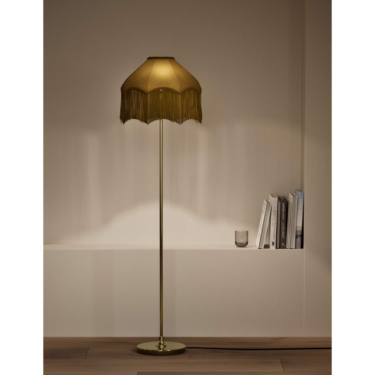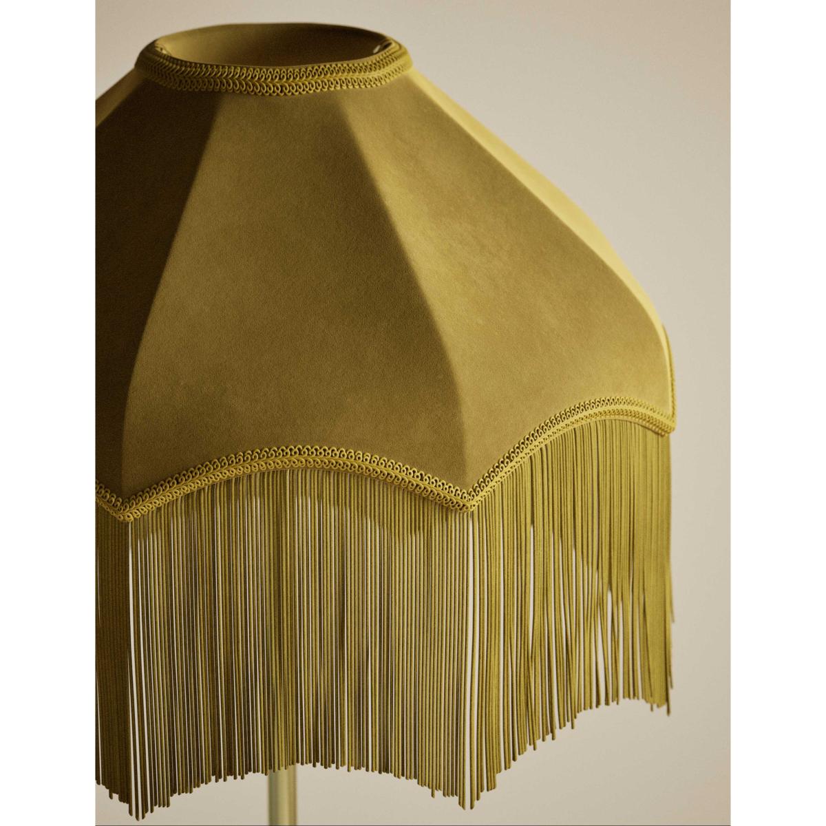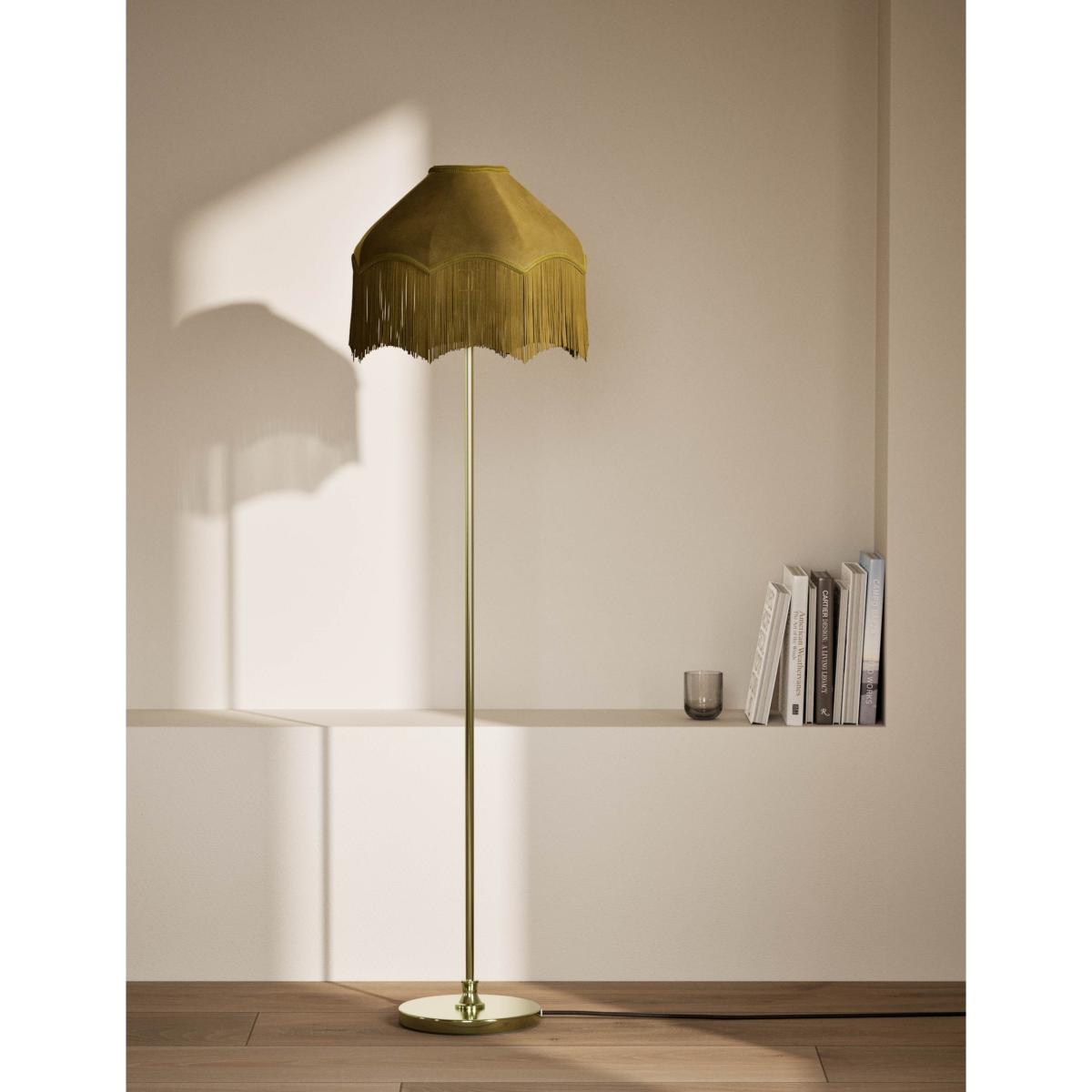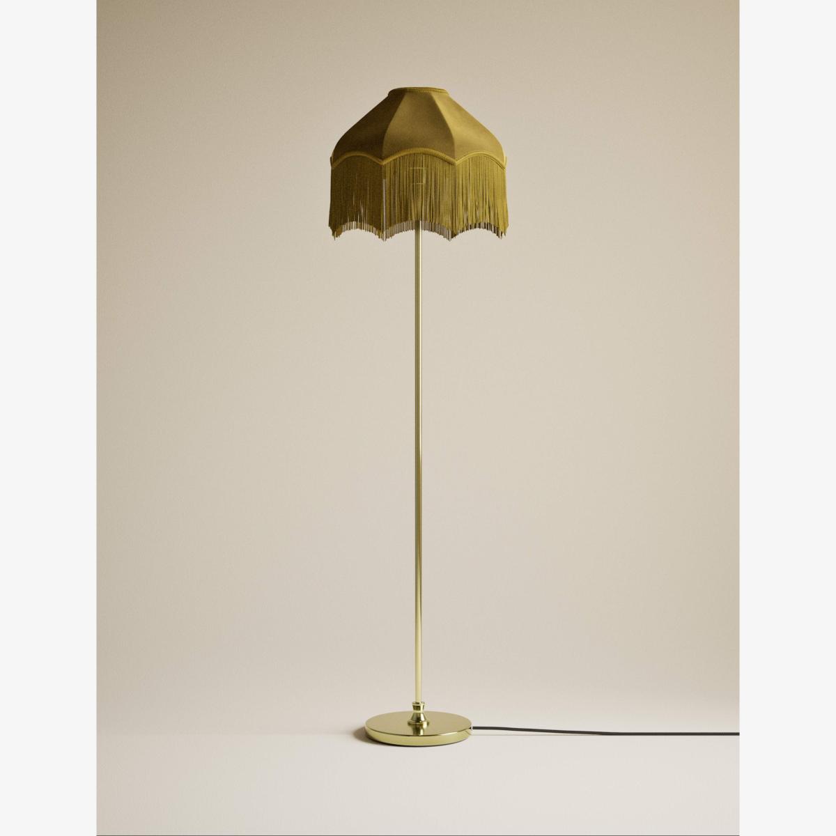 This floor lamp makes a glamorous style statement. The base and stem are crafted from satin brass metal, while the plush velvet shade comes in a co-ordinating tone for a sophisticated look. The intricately textured trim and fringing add dramatic, vintage-inspired appeal.
