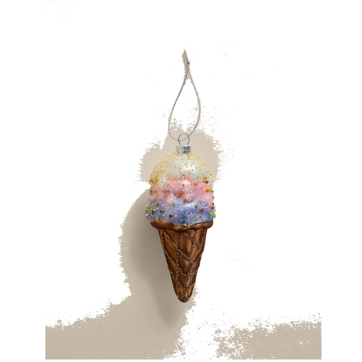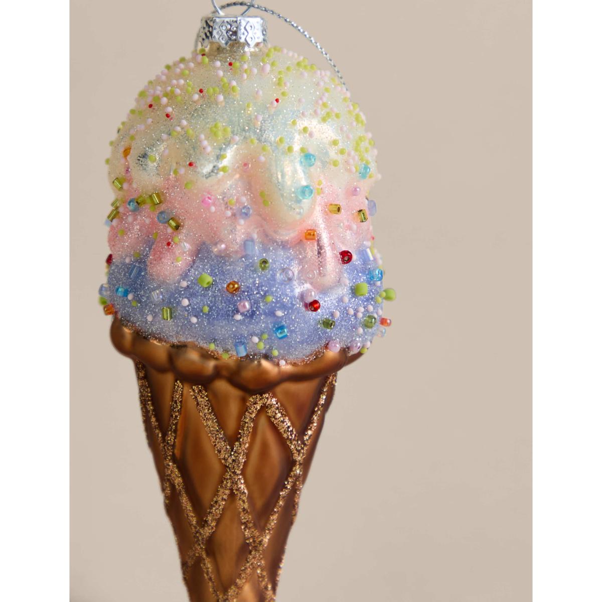 This playful glass decoration adds a fun touch to your Christmas tree. On a glittery metallic cone, three scoops of ice cream are topped with sparkling sprinkles. A hanging loop ensures this piece is ready to display.