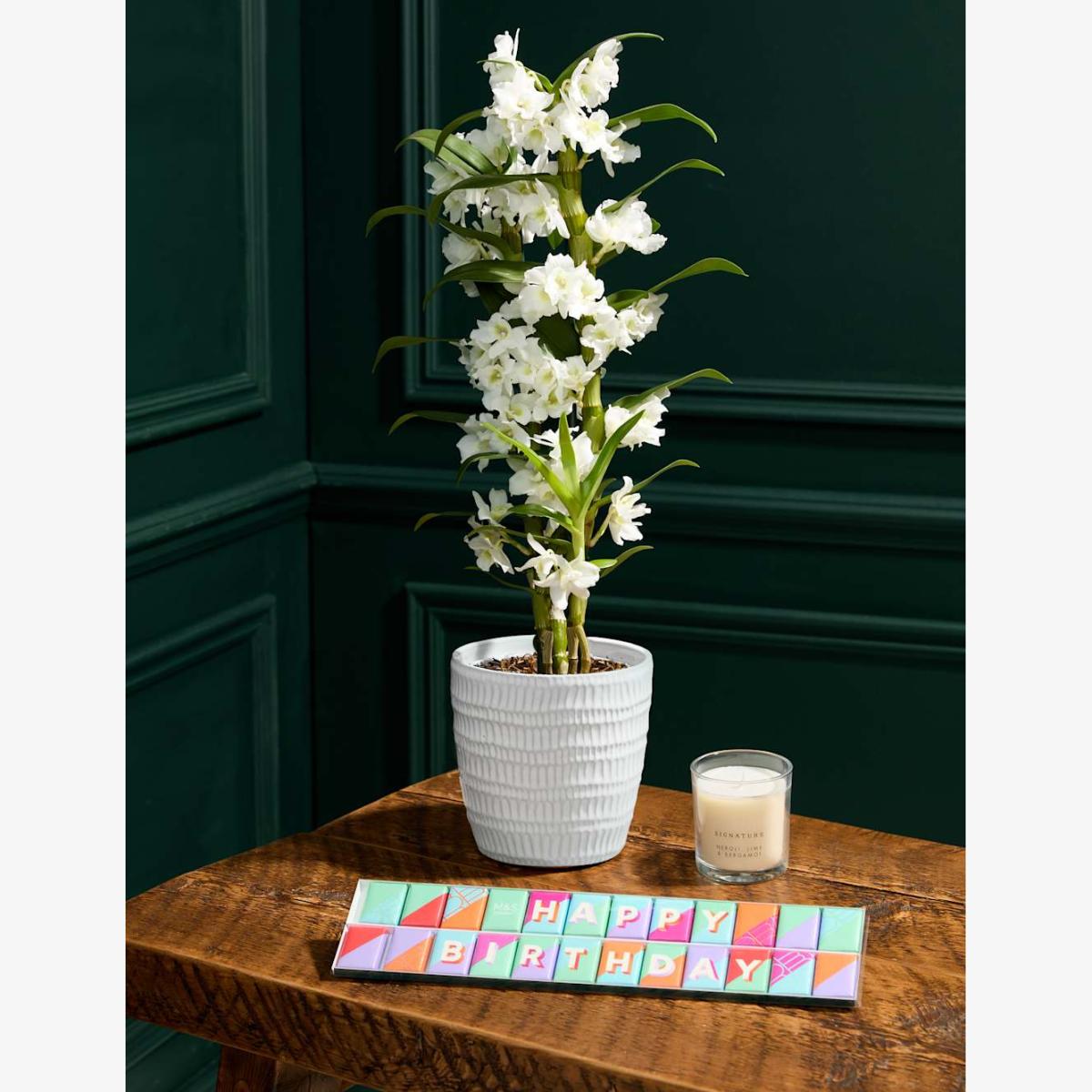 Celebrate a special birthday with our delightful Happy Birthday Gift, featuring a gorgeous white Dendrobium Orchid in a handmade Portuguese crackle glaze pot, a soothing Signature candle, and a box of indulgent Happy Birthday chocolates. This thoughtful combination offers a beautiful bloom, calming ambiance, and a sweet treat—everything needed to make the day unforgettable. Colours may vary slightly throughout the season.