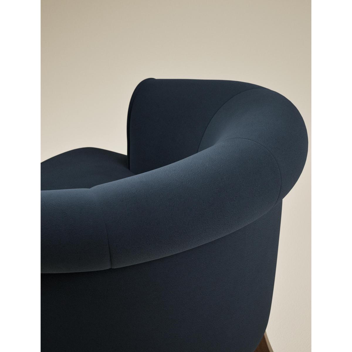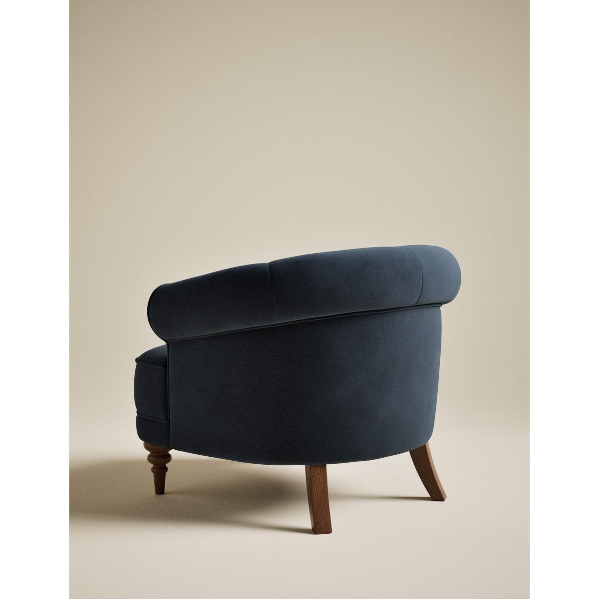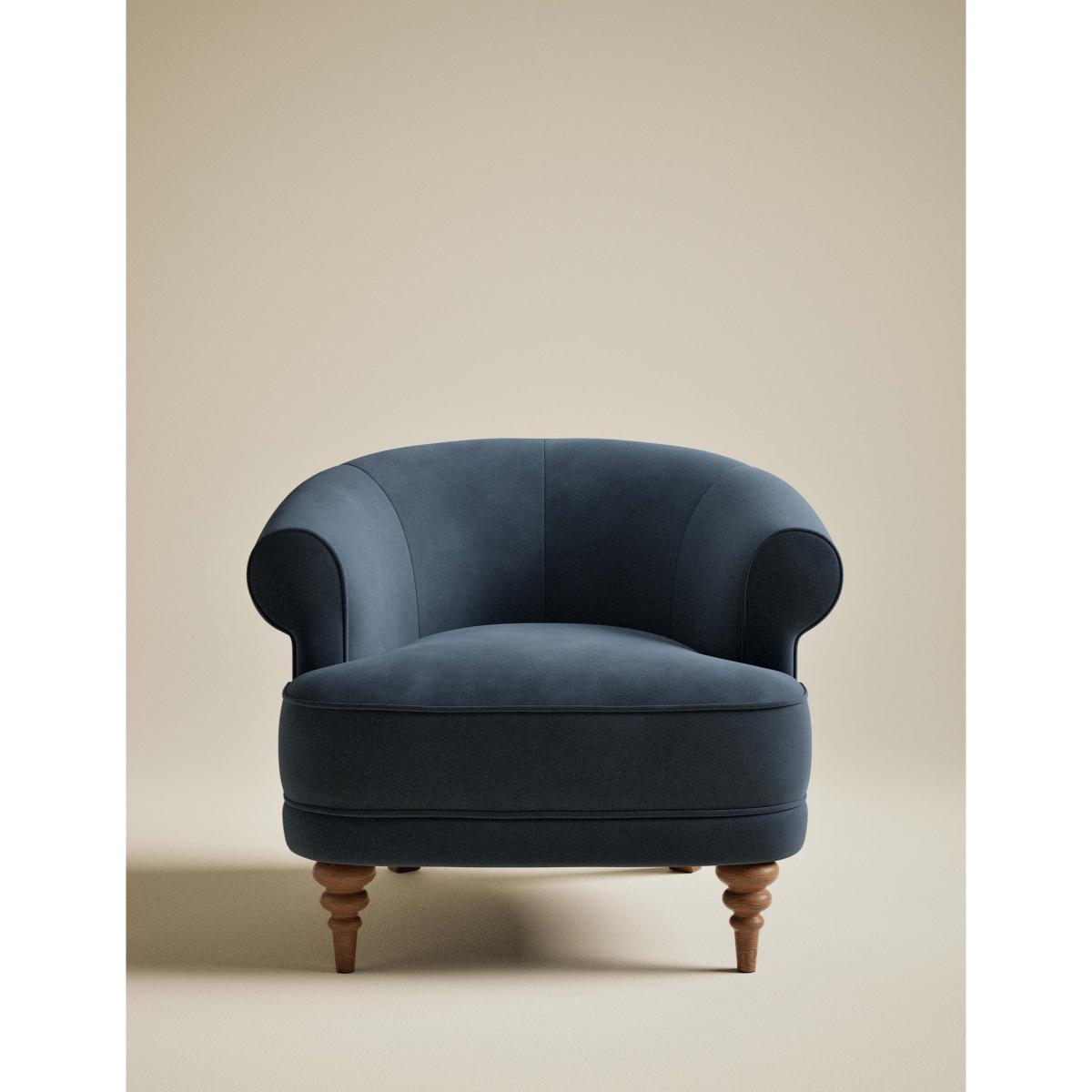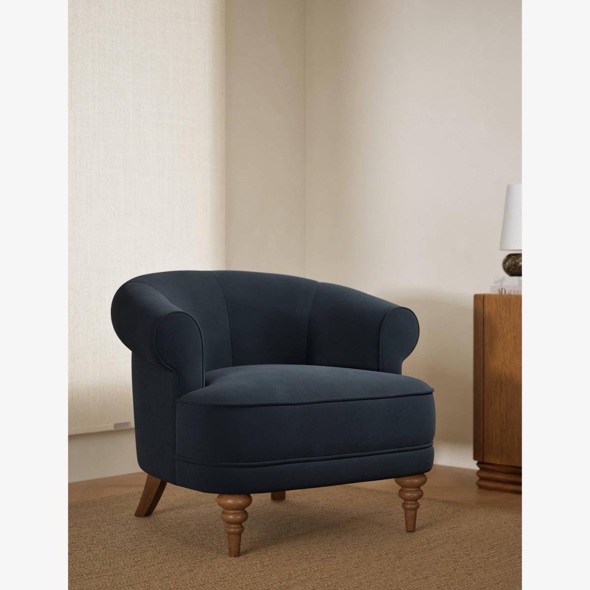 I love this armchair for its rich midnight navy velvet, which adds a touch of sophistication and depth to any room. Its classic shape works well in both traditional and modern interiors, making it a versatile piece. It’s perfect placed in a cosy corner with a throw and a small side table, or as an accent in a living room with mix-and-match furniture styles. Practical styling tips include pairing it with neutral tones to let the colour really pop, or with metallic accessories for a luxe feel. Its plush upholstery and sturdy wooden legs also make it comfortable and durable - great for everyday use or as a statement piece in a guest room.