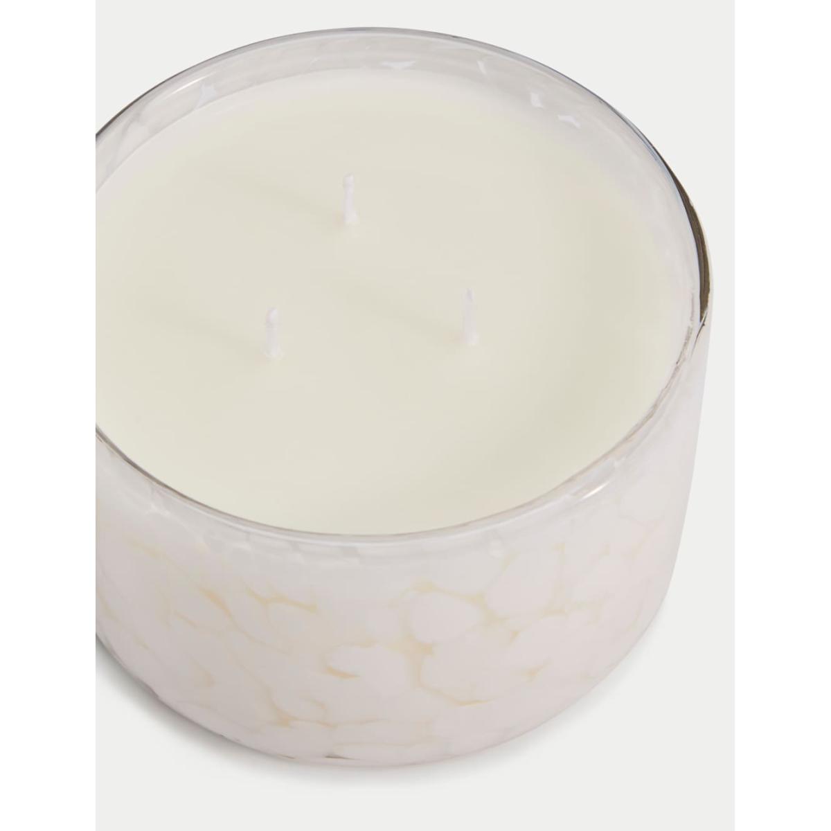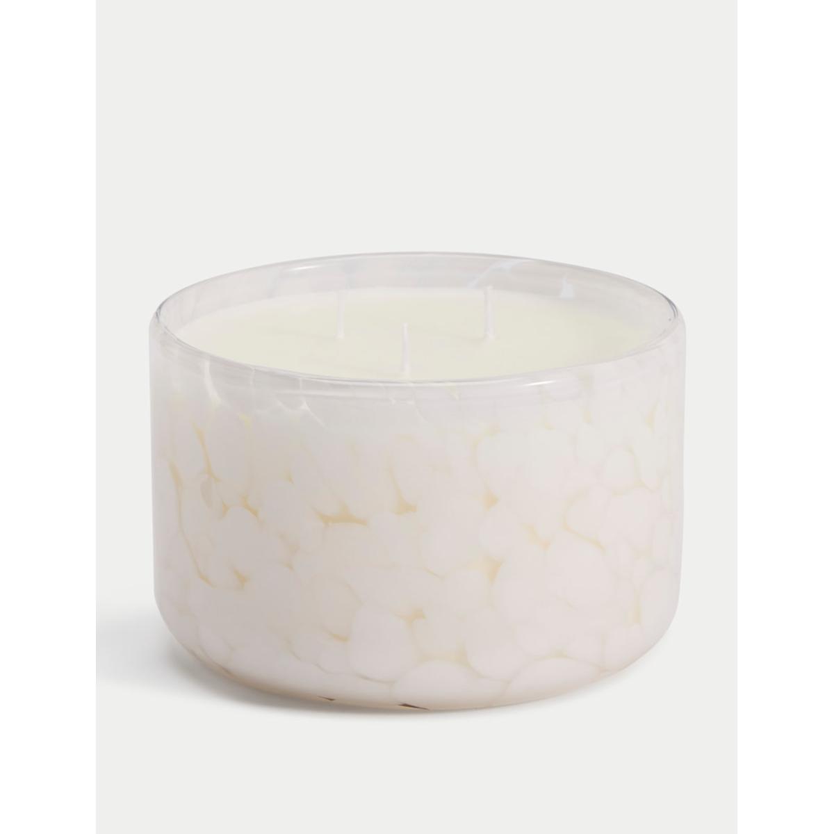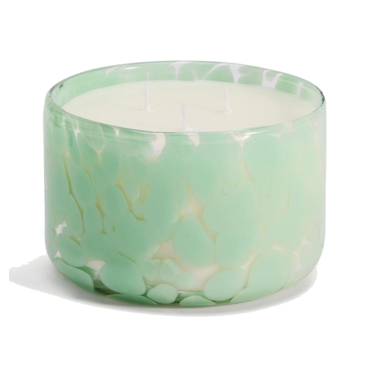 This large three-wick candle is the perfect blend of style and scent. Crafted from pastel-coloured confetti glass, the striking vessel holds a lychee and dragonfruit-scented candle for a fruity aroma. This fragrance is part of the Fruity family of fragrances. Fruity scents are refreshing and tropical and will often have notes of berries and non-citrus fruits such as pomegranate, apple and sweet pears.