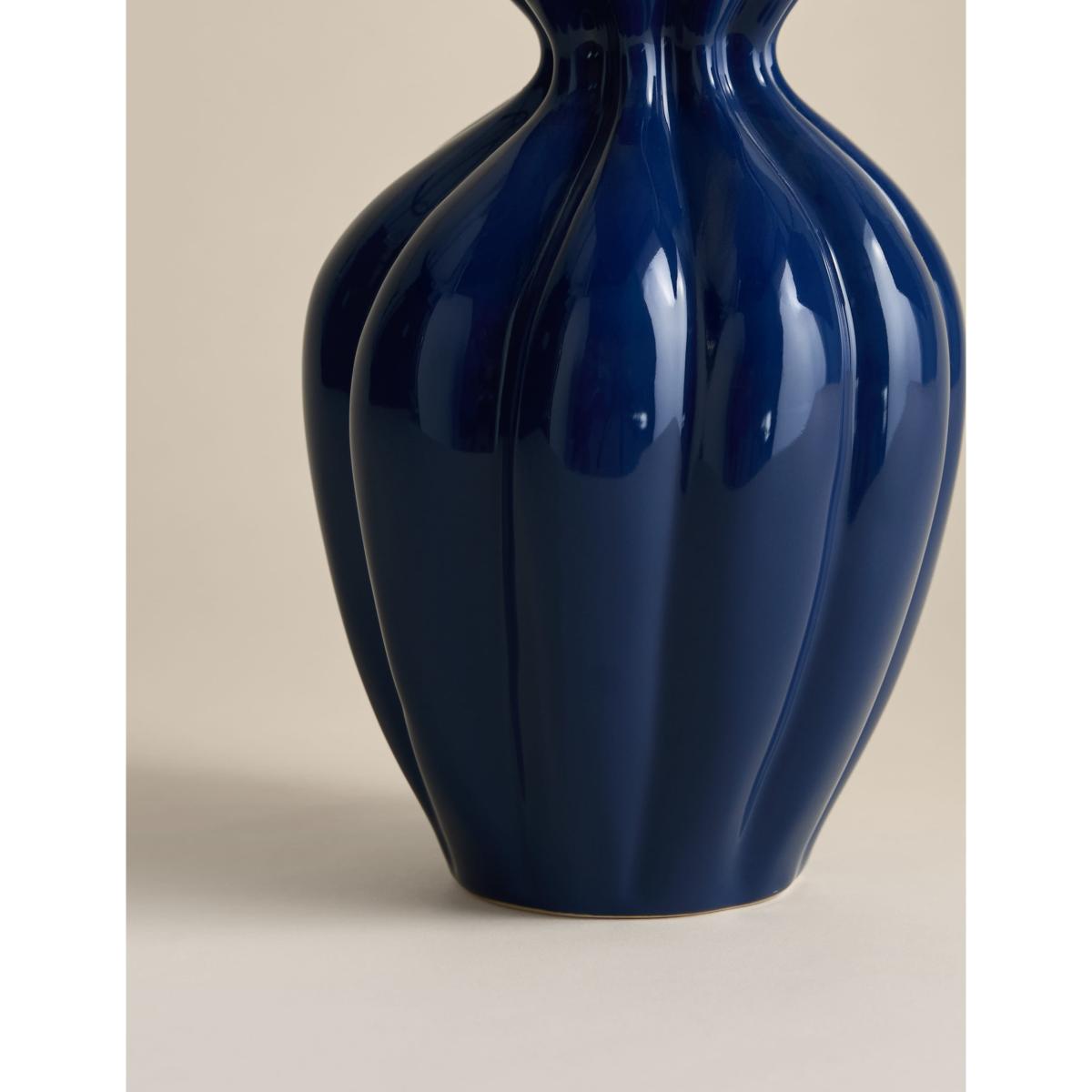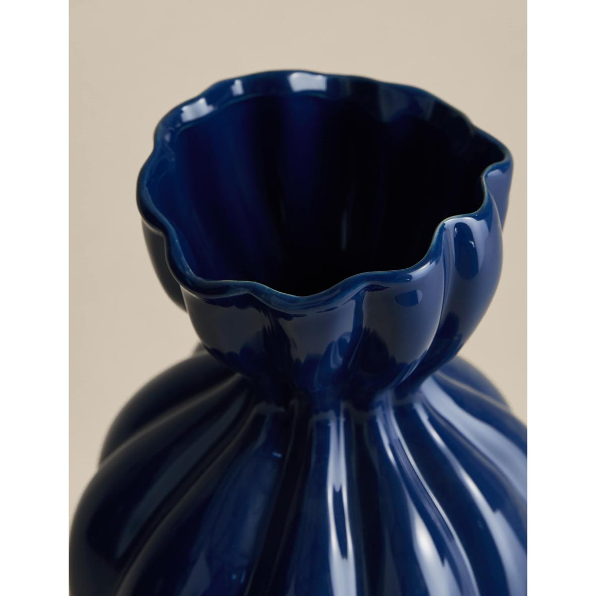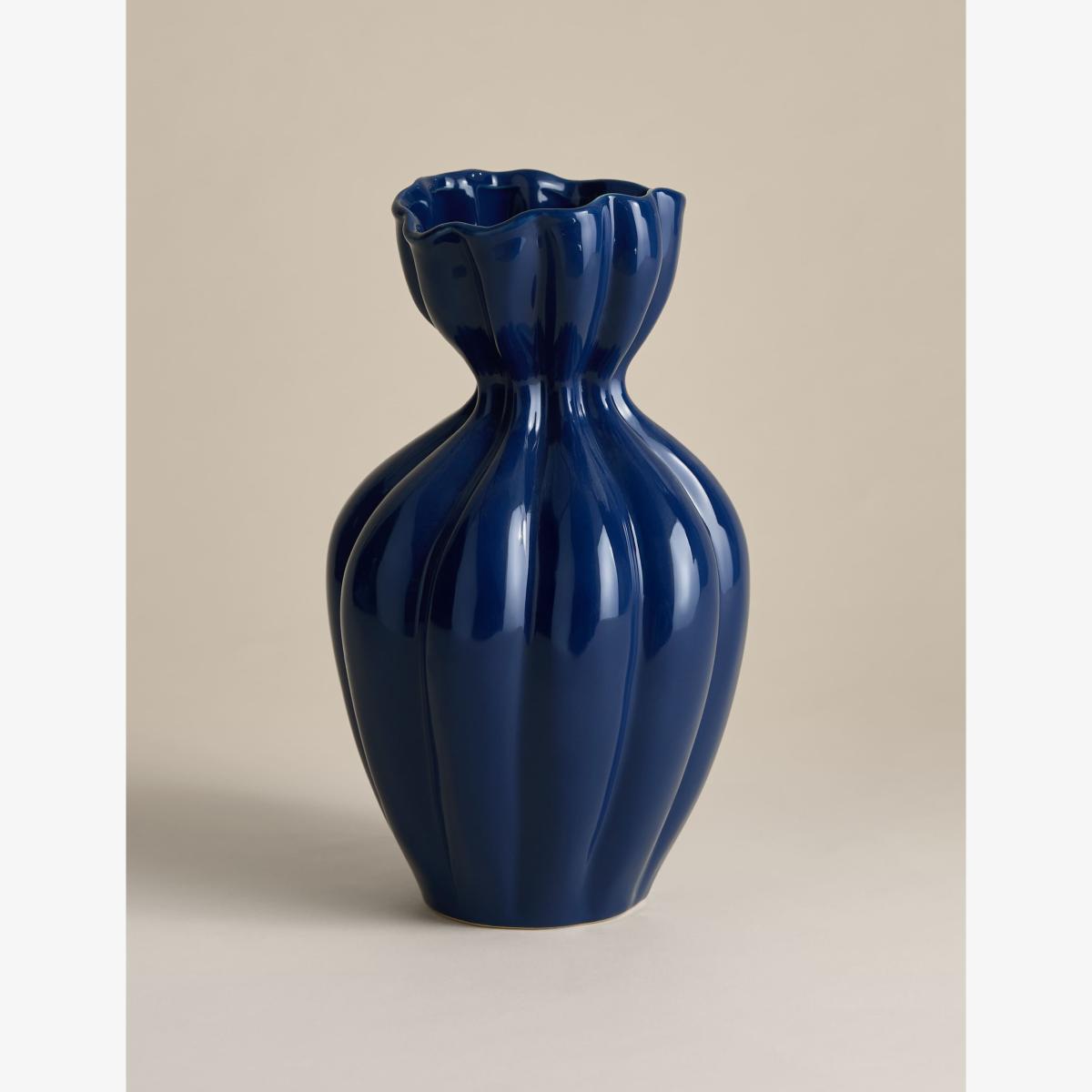 I love this blue vase for its classic fluted design and rich colour, which effortlessly adds a pop of colour to both modern and traditional interiors. It works particularly well in minimalist spaces where it can serve as a statement piece, or in cosy, eclectic settings to complement different textures and patterns. Practical styling tips include pairing it with a simple bouquet of seasonal flowers or greenery for everyday decor, or leaving it empty on a sideboard or mantel for a bold sculptural accent. Its medium size makes it versatile for various surfaces, and its robust ceramic build ensures it’s both stylish and durable.