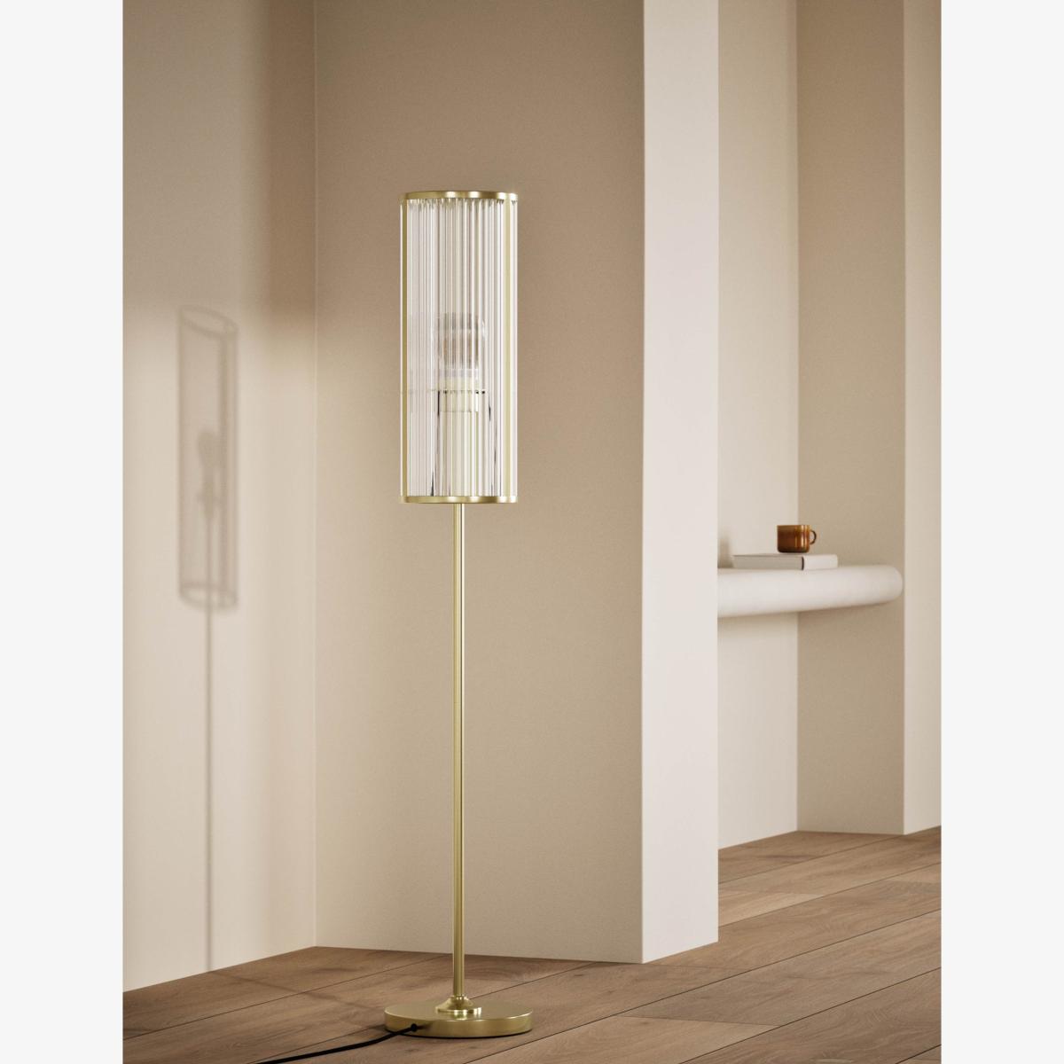 I love this floor lamp for its sleek, contemporary take on a classic design, especially with the ribbed glass detail which adds depth without overwhelming the space. It works particularly well in minimalist or modern interiors, but also pairs nicely with vintage or industrial styles thanks to its antique brass finish. For styling tips, consider placing it in a corner of a living room to create a cosy reading nook, or next to a statement piece of furniture to add height and visual interest. Its understated elegance makes it versatile, so don’t be afraid to combine it with coloured or textured accessories to make it feel more curated and intentional.
