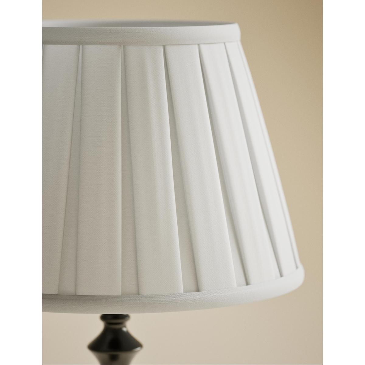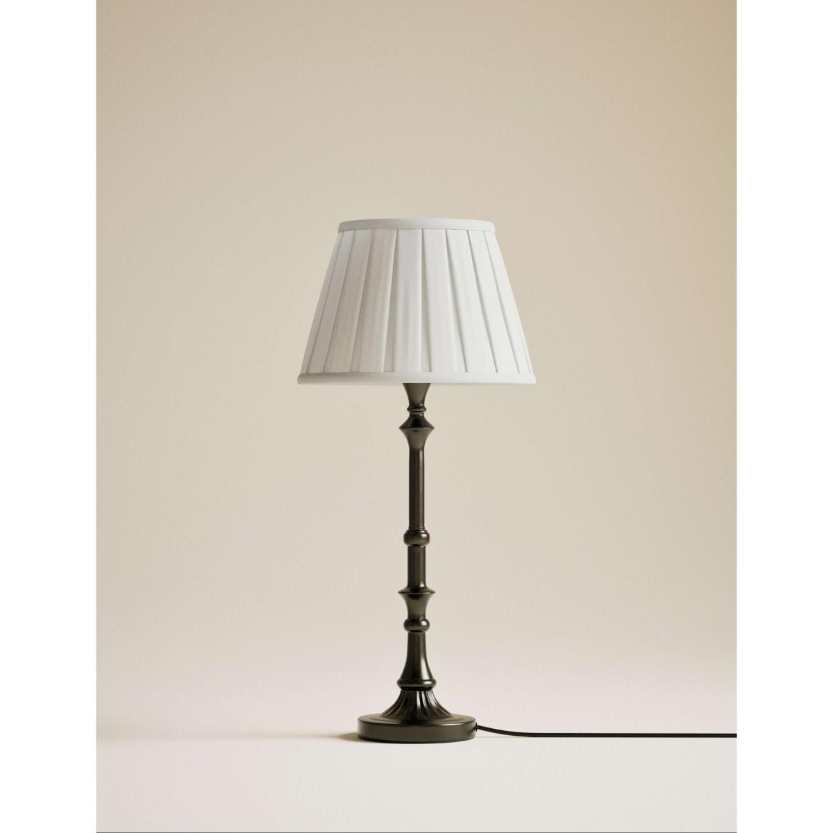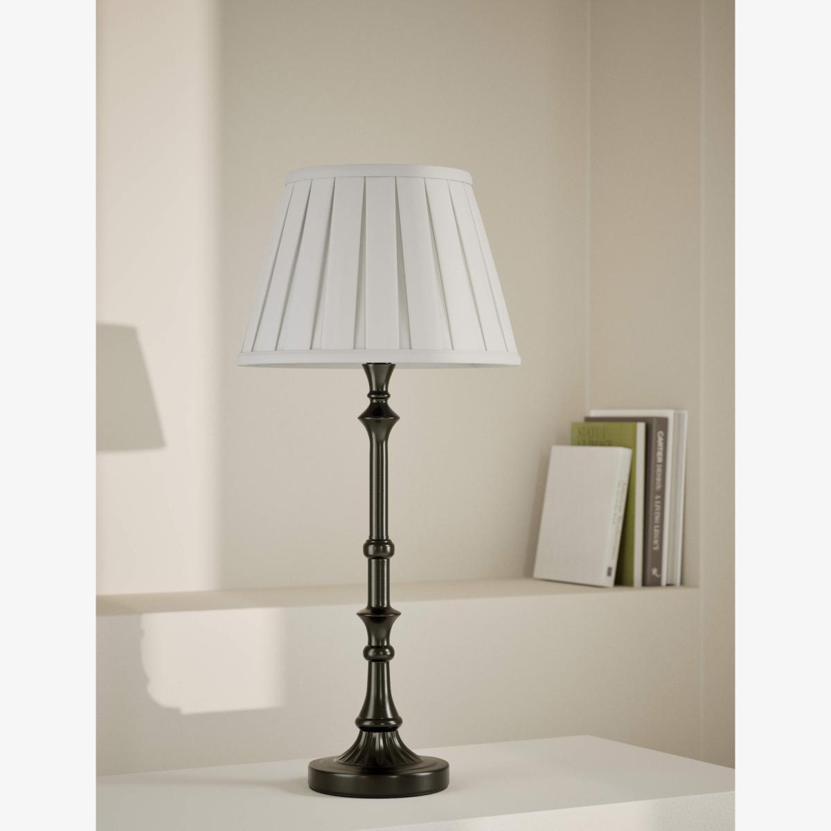The form of this table lamp is inspired by traditional pewter candlesticks. A pleated shade softens and diffuses the light for a welcoming glow.