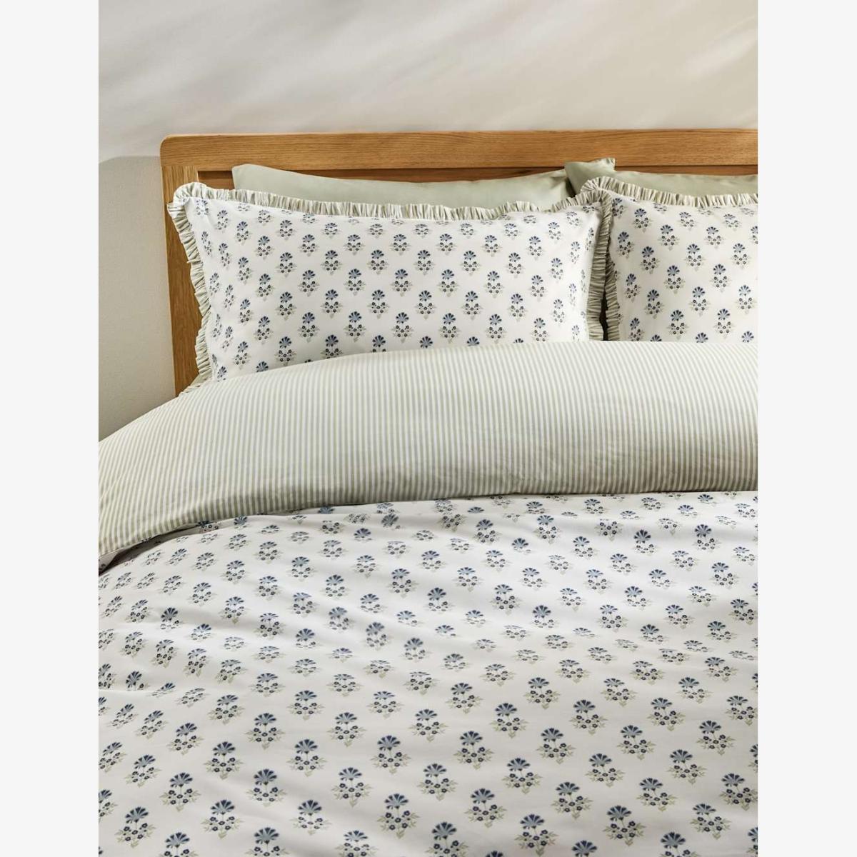 A charming interplay of patterns defines this pure cotton bedding set, showcasing a pretty floral print on one side and a classic stripe on the reverse. The pillowcases feature striped ruffles, adding a delicate, decorative edge. This set is non-iron and fastens with secure buttons. StayNew™ technology maintains the colour and finish after washing.