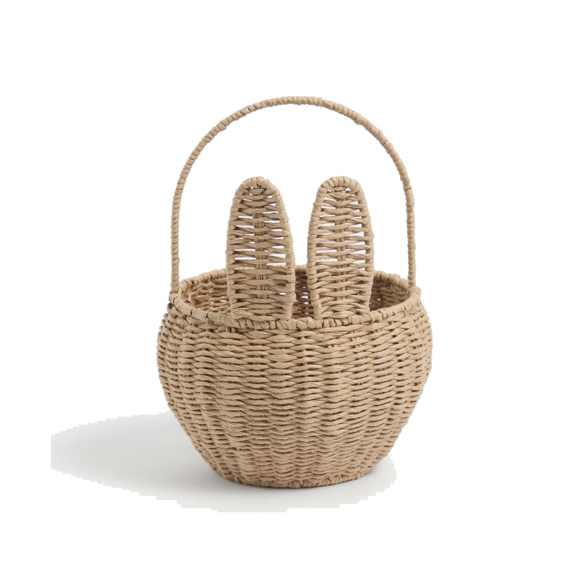 This raffia bunny basket is perfect for egg hunts or decorating your home. It has 3D ears and a tall handle for easy carrying.