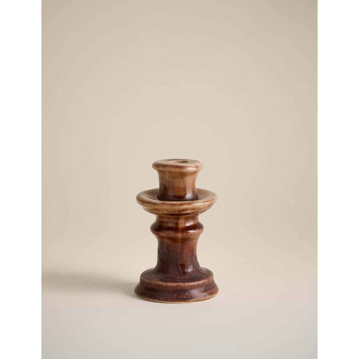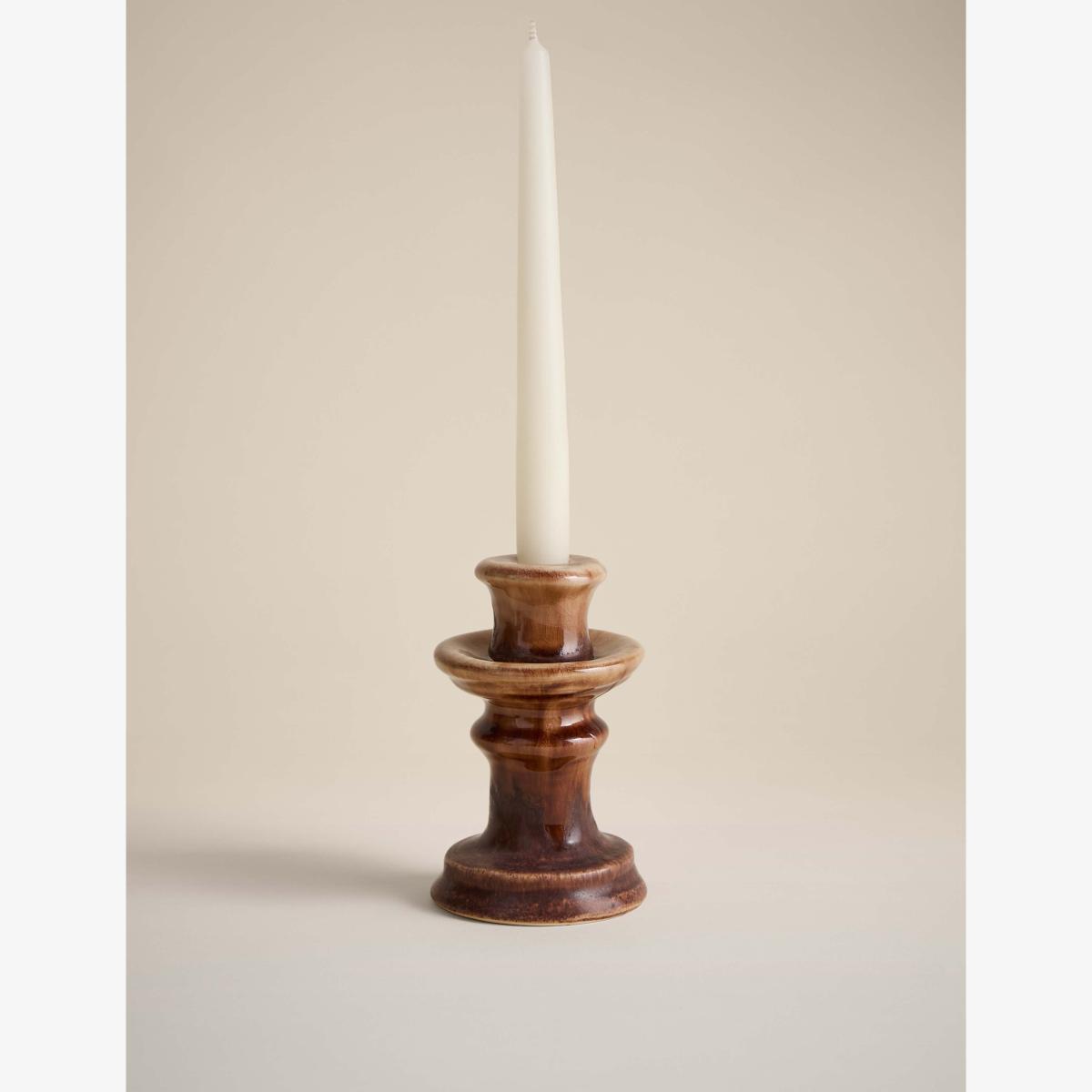 Add an elegant touch to your mantlepiece or dinner table with this timeless candle holder. It's made from durable ceramic with a distinctive reactive glaze that gives a wood-look finish. This small piece is ideal for use with tapered dinner candles.