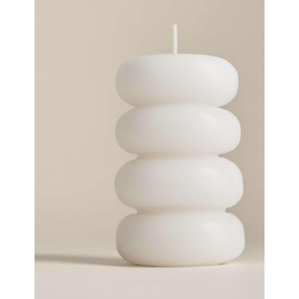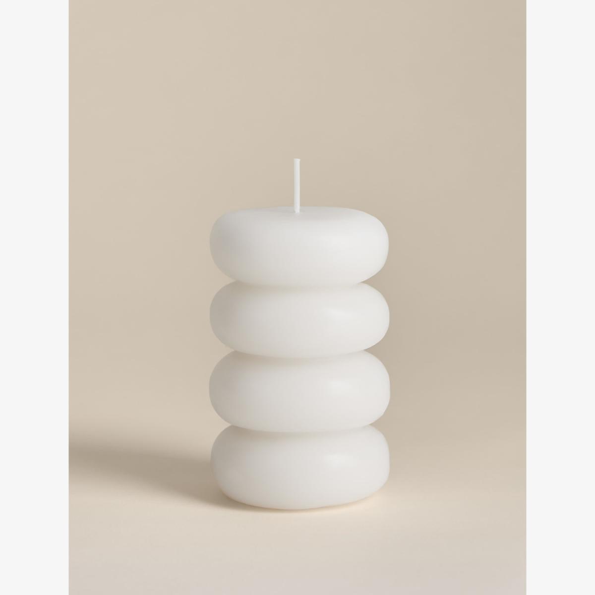 I love this candle for its playful yet sophisticated design - the retro button bobble style adds a touch of nostalgic charm that's versatile across many interiors. It works particularly well in contemporary or minimalist settings, where its clean white finish can be a subtle statement piece, but could also complement a cosy, eclectic space when paired with textured textiles or brass accents. Practically, it's great for layering on a coffee table, mantel, or sideboard, especially when grouped with other candles of varying heights for a balanced display. To create a warm ambience, opt for a couple of these in different sizes and keep the surrounding decor simple to make its distinctive shape stand out.