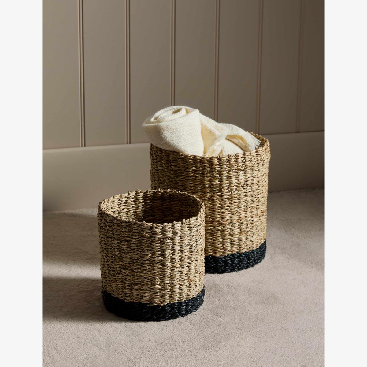 I love these baskets for adding both texture and practicality to a range of interiors. Their natural Raffia and Seagrass composition makes them versatile, working particularly well in coastal, boho, or rustic schemes. They’re perfect for organising blankets, magazines, or even laundry, helping to keep spaces tidy without sacrificing style. For styling tips, try pairing them with soft textiles or plants to create a relaxed, inviting look. Using the larger basket as a statement piece for throws or cushions and the smaller for everyday essentials can help balance function with aesthetic appeal. Their neutral tones make them adaptable to various colour palettes, making them a smart and stylish addition to any room.