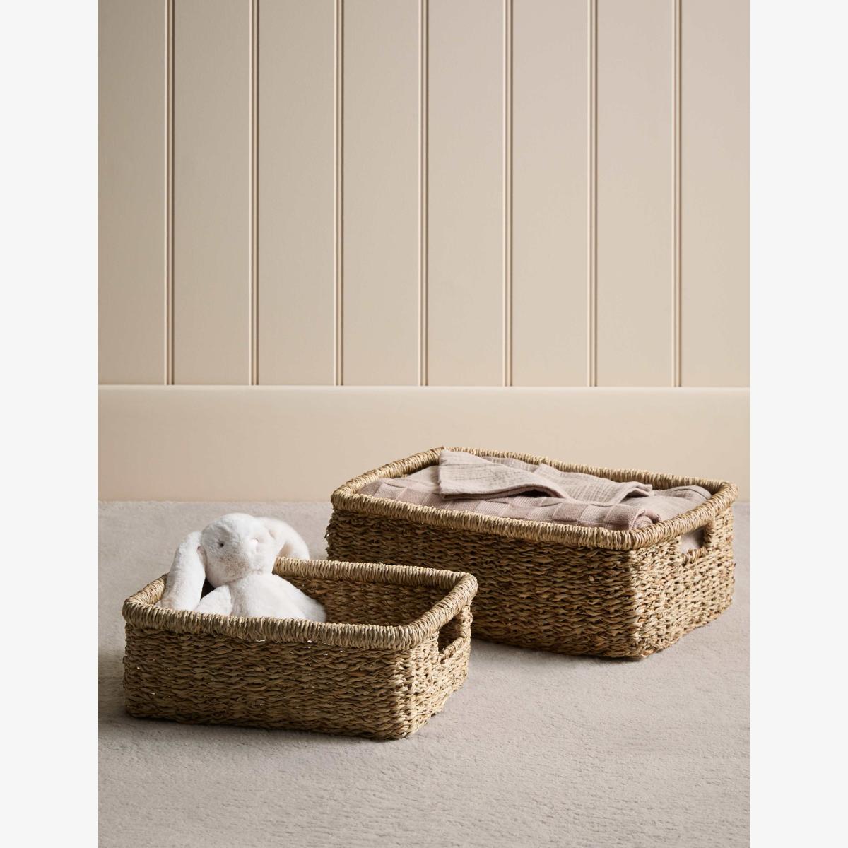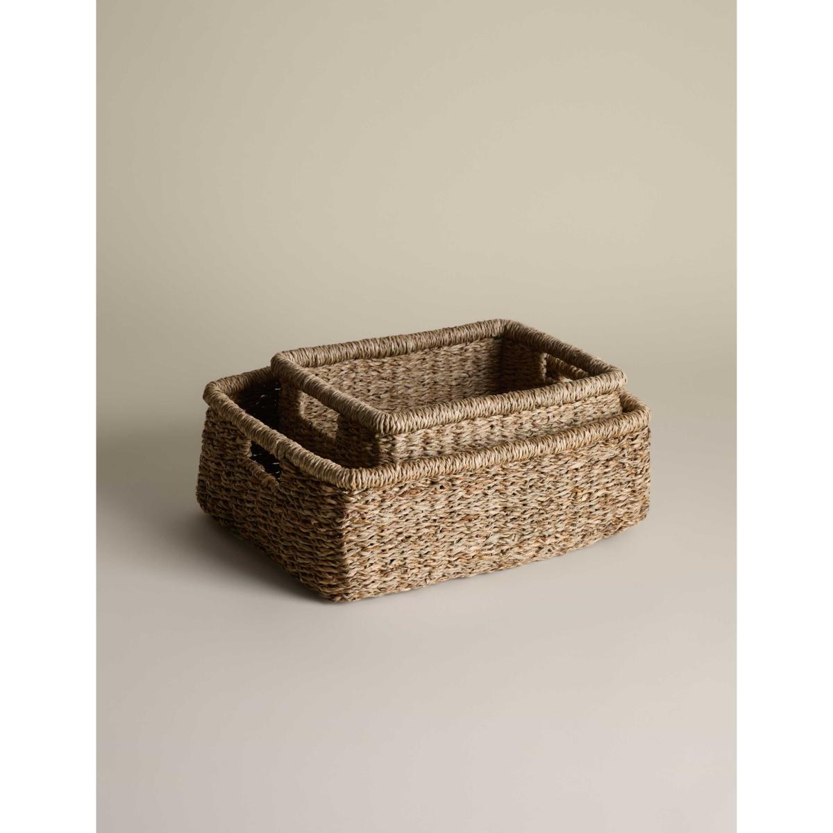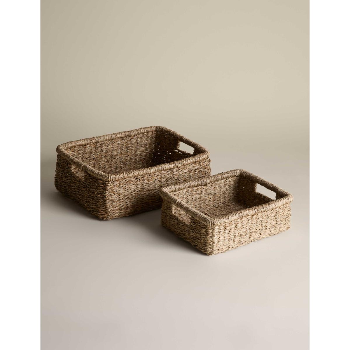 This set of two rectangular baskets is woven from seagrass, bringing natural texture to your home. The sturdy design makes them perfect for storing anything from toys and trinkets to towels and magazines, with two different sizes giving you options for larger and smaller essentials. Cut-out handles ensure easy carrying.
