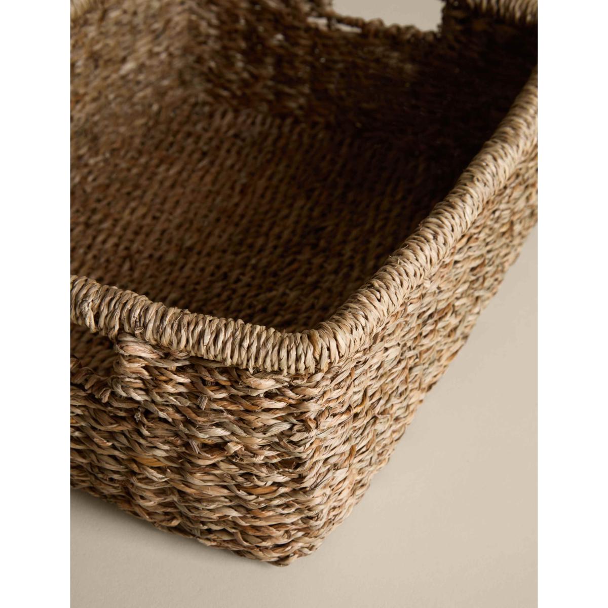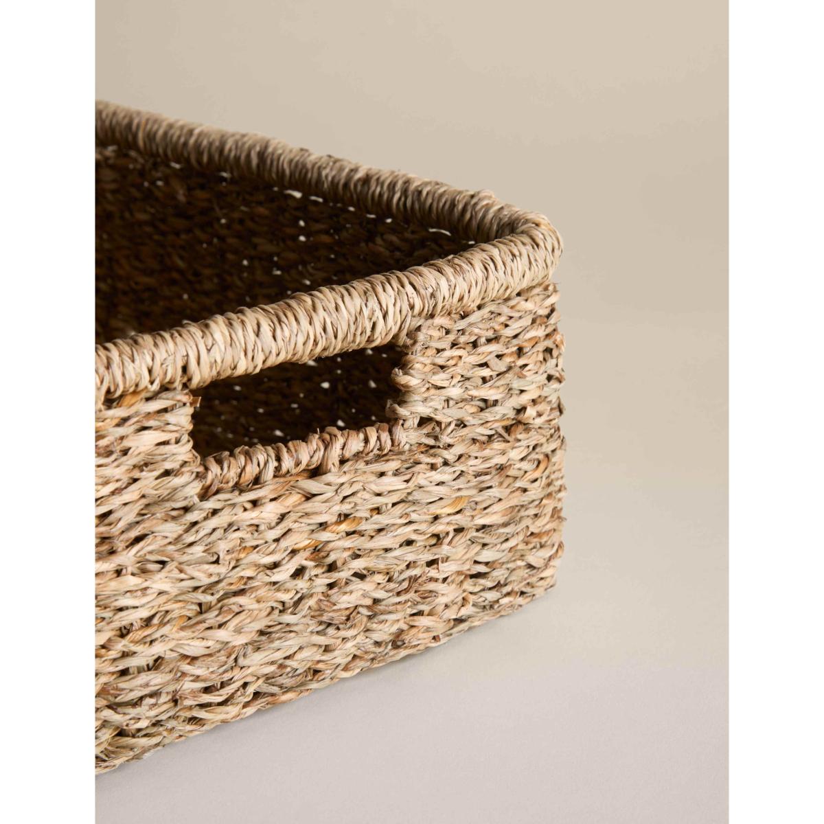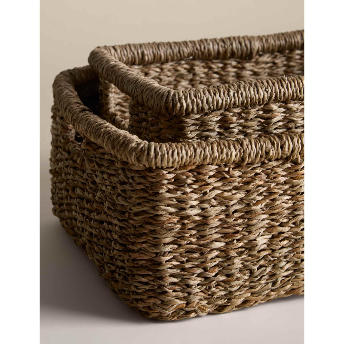 This set of two rectangular baskets is woven from seagrass, bringing natural texture to your home. The sturdy design makes them perfect for storing anything from toys and trinkets to towels and magazines, with two different sizes giving you options for larger and smaller essentials. Cut-out handles ensure easy carrying.