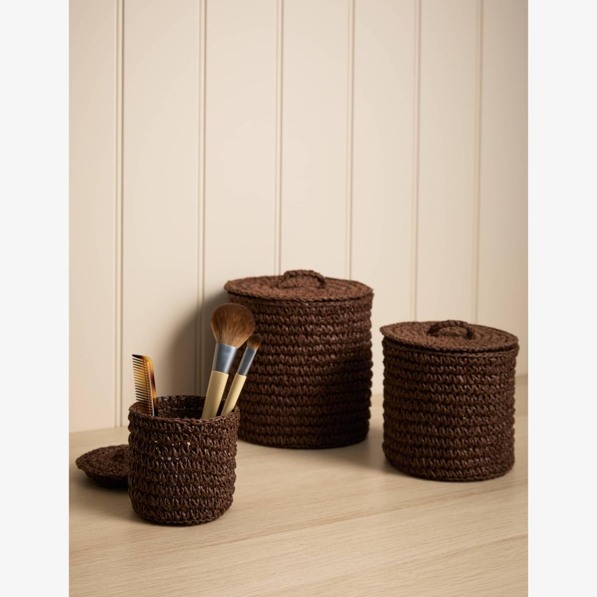 This set of three pots is crafted from raffia for a natural, textured look. Each piece comes with a fitted lid and is sized differently, making them perfect for organising everything from trinkets to everyday essentials.