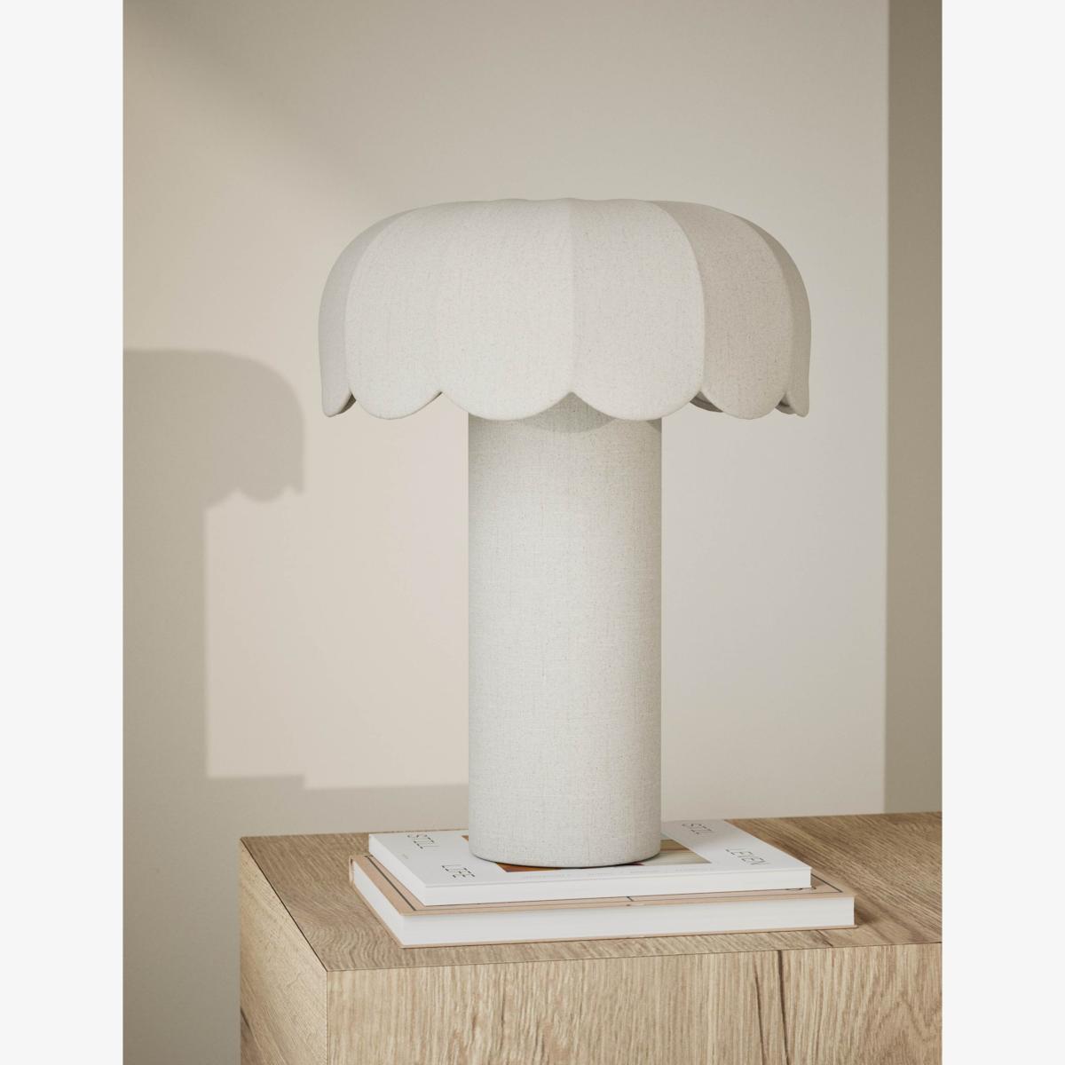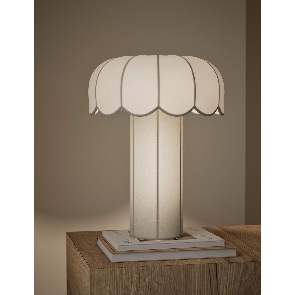 This dual-lit table lamp emits both high and low-beam light, to illuminate your space with style. It's made with natural linen throughout, creating a soft glow that contrasts with the brass metal accents. The rounded scalloped shade is designed to look like skeletal petals for an elegant finish.
