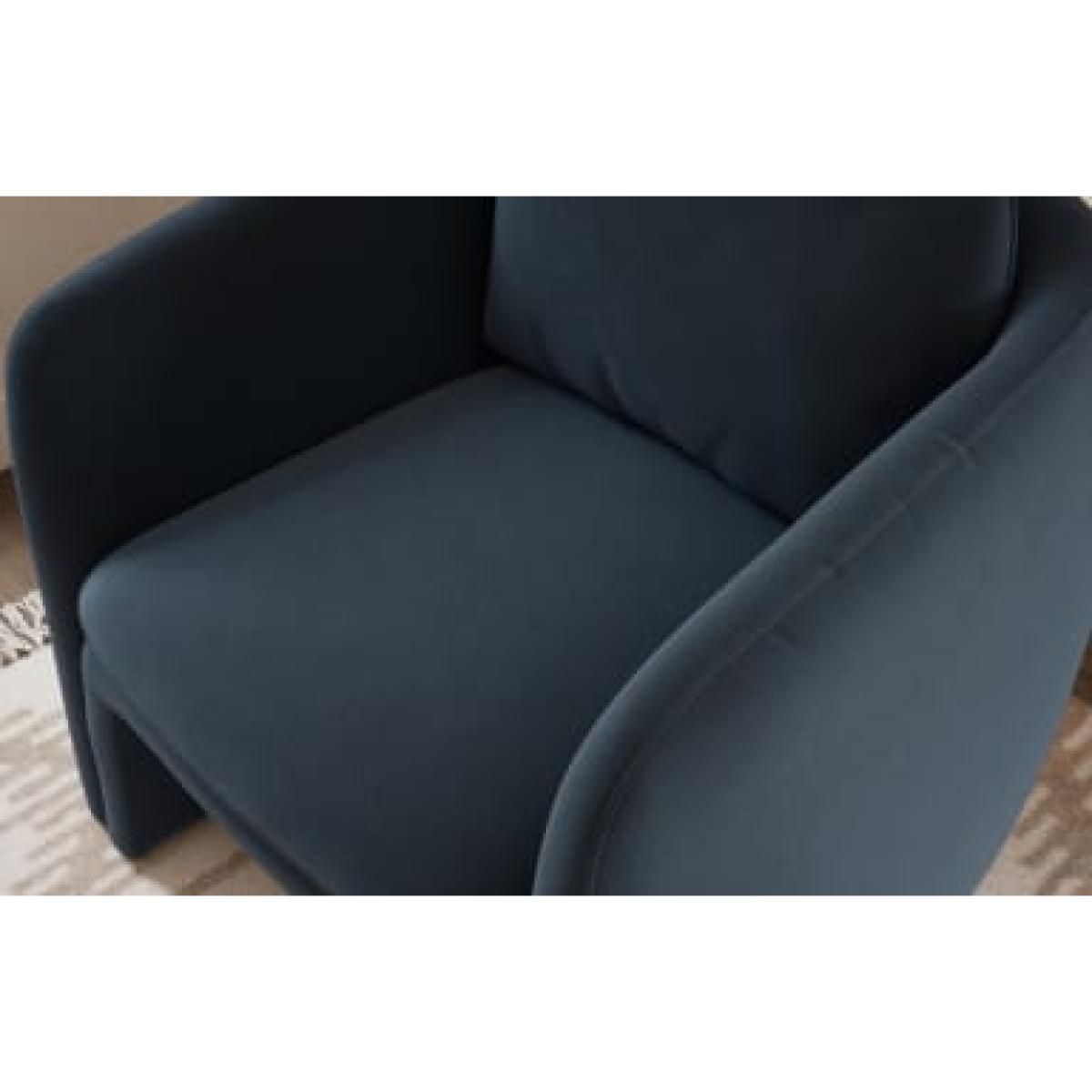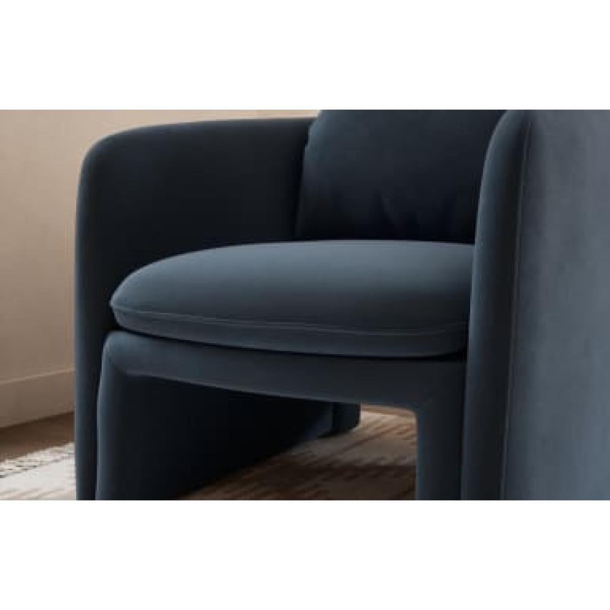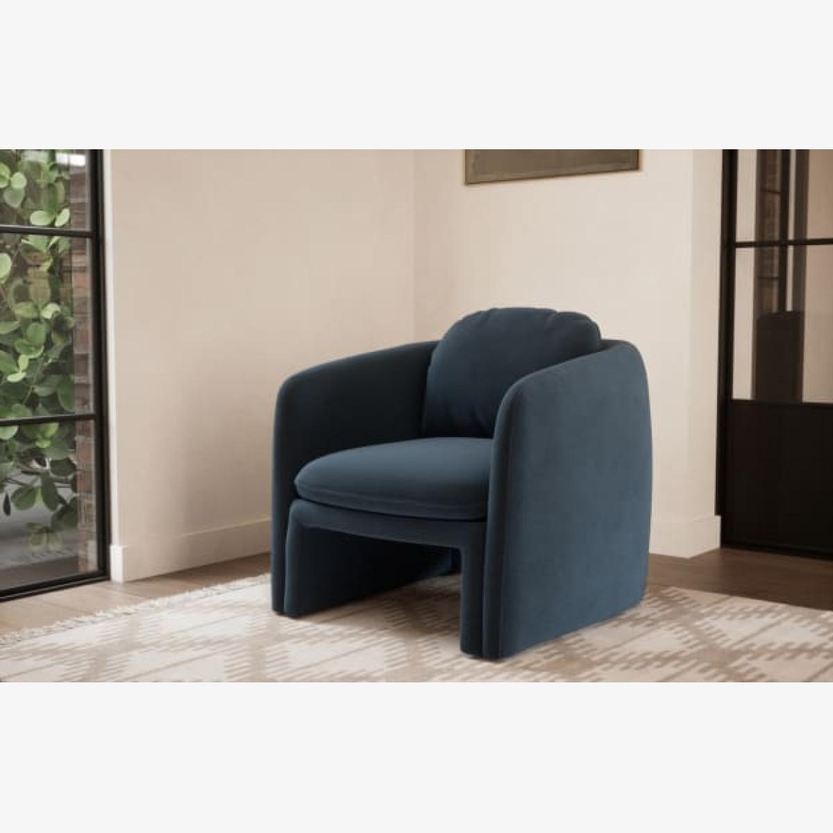 I’m a fan of this sling-style accent chair in midnight navy for its clean lines and generous cushions - it strikes a good balance between sculptural form and everyday comfort. The curved back and low profile work particularly well in contemporary, Scandi or mid-century inspired rooms, where it can either blend into a neutral palette or act as a dark contrast against lighter walls. For styling, try placing it beside a slim, metallic side table to pick up any brass or chrome on your lighting. A simple wool throw in a complementary tone softens the look, while a tall floor plant or textured rug adds warmth and prevents the chair from feeling too standalone.