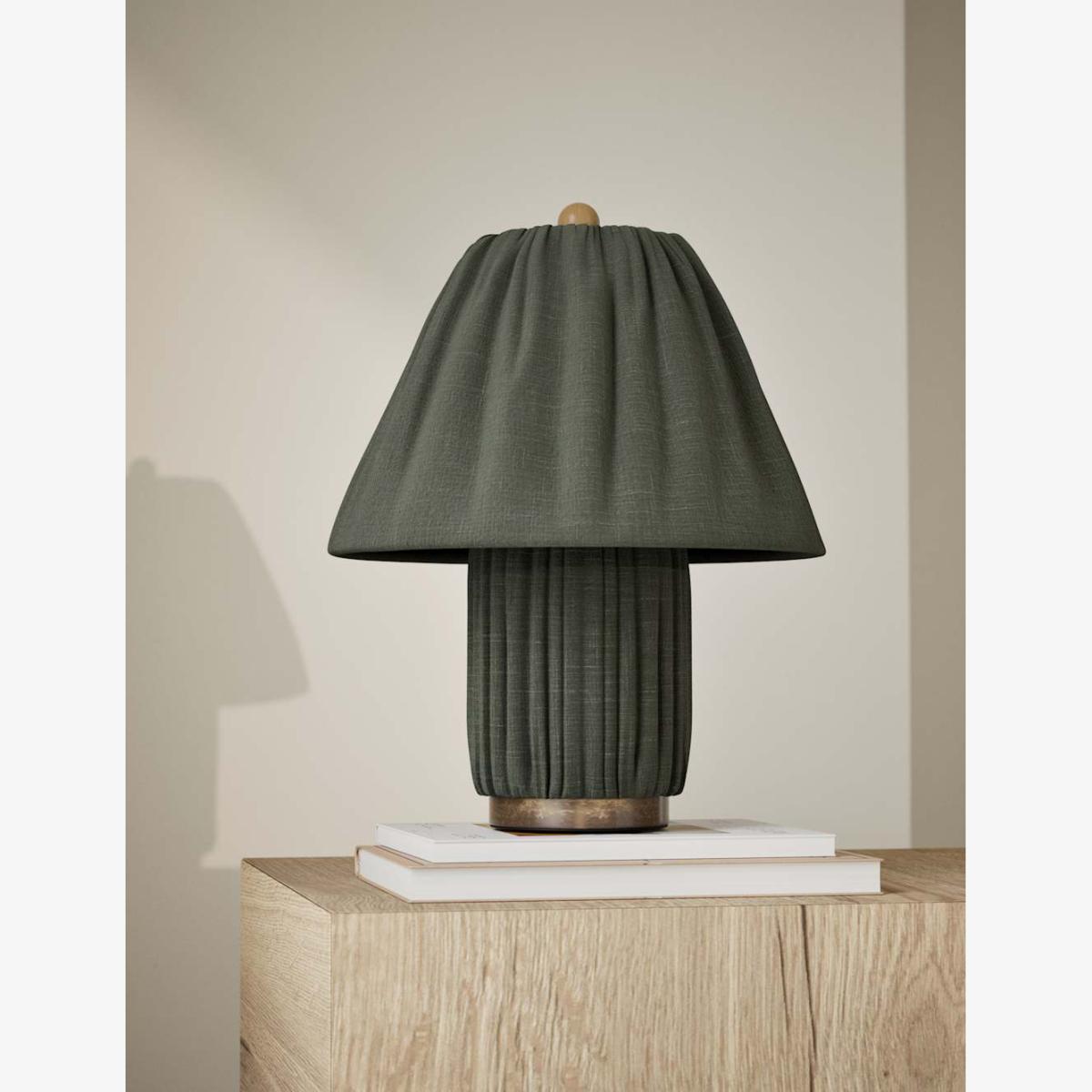 I really like this table lamp for its soft pleated fabric shade and calming green tones, which add subtle colour without overwhelming a space. It works particularly well in interiors with muted, neutral palettes or earthy accents, making it a versatile addition to both contemporary and Scandinavian-inspired rooms. For styling, consider pairing it with natural wood or matte ceramics to create a layered, cosy look. It’s perfect as a bedside lamp or on a side table in a living room, providing a warm, diffuse light that enhances the ambiance. To keep the look balanced, avoid overcrowding the surface and let the lamp stand out as a design detail.