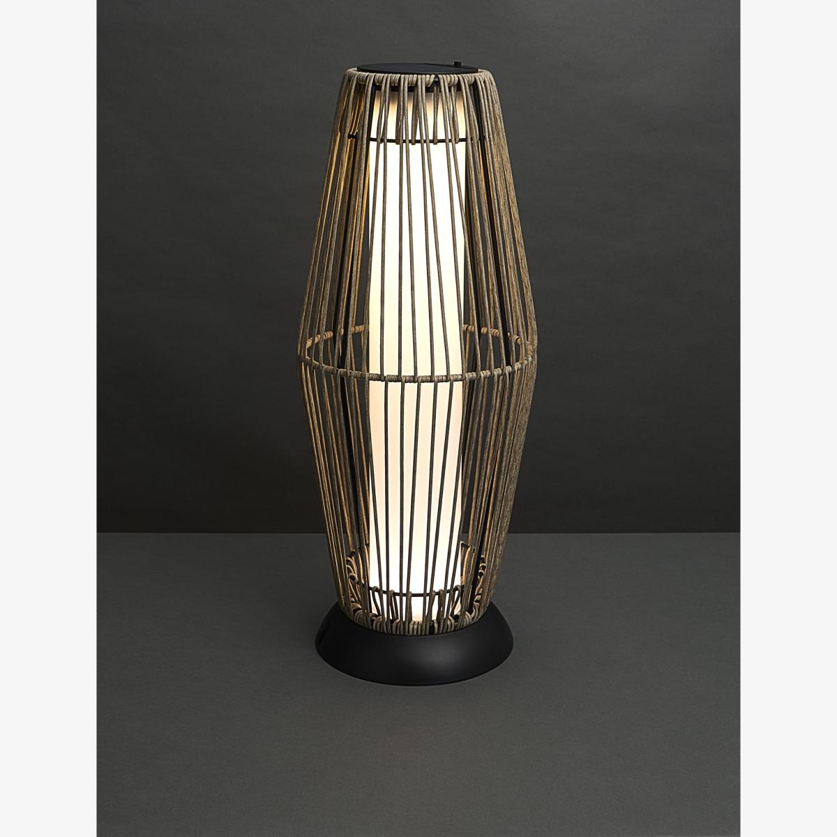 This stylish solar-powered outdoor lamp is perfect for creating ambience. It features a woven exterior and a sturdy base that's designed to help it sit safely on the ground. The LED bulb casts a soft warm-white glow to help enhance the mood.