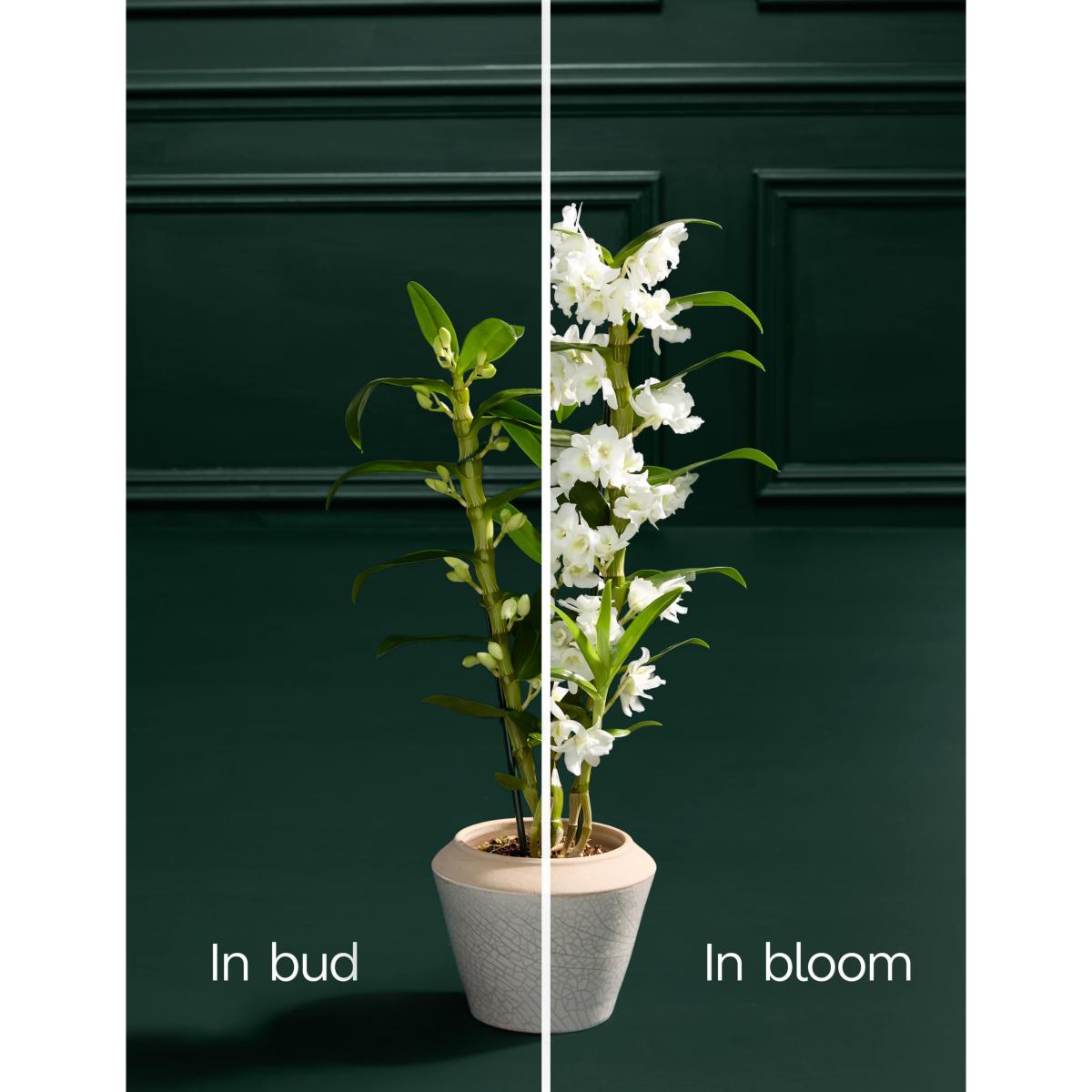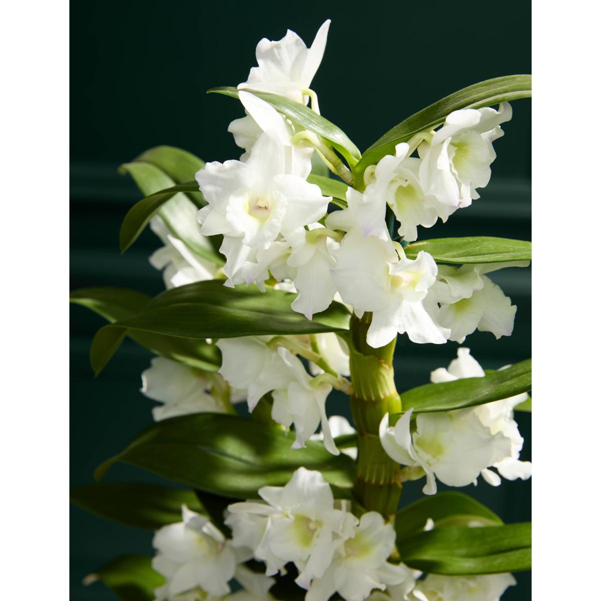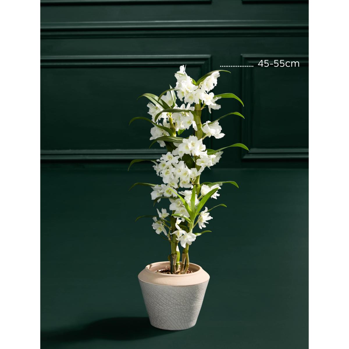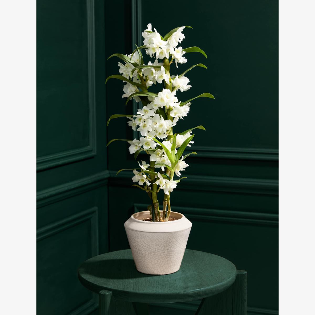 Elevate your décor with the timeless elegance of a White Dendrobium Orchid, beautifully presented in a handmade and hand finished Portuguese crackle glaze pot. This stunning combination pairs the orchid's delicate white blooms with the artisanal charm of the pot, creating a sophisticated centerpiece for any space. Colours may vary slightly throughout the season.