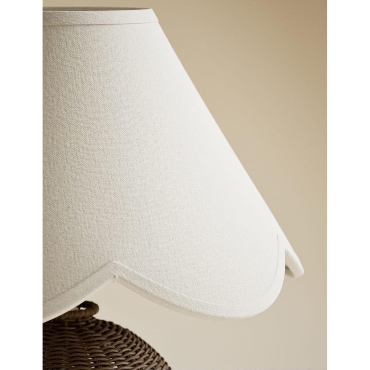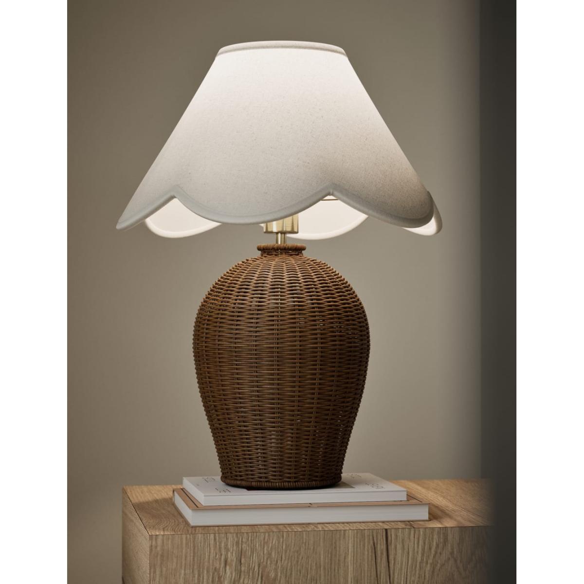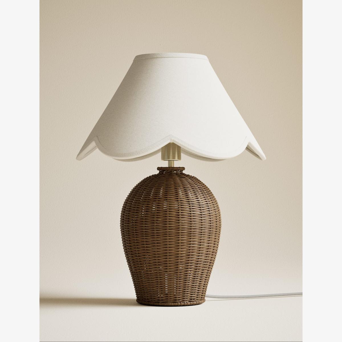 A wicker base lends textural appeal to this table lamp. For an extra touch of elegance, the scalloped edge on the fabric shade complements the curved lines of its silhouette.