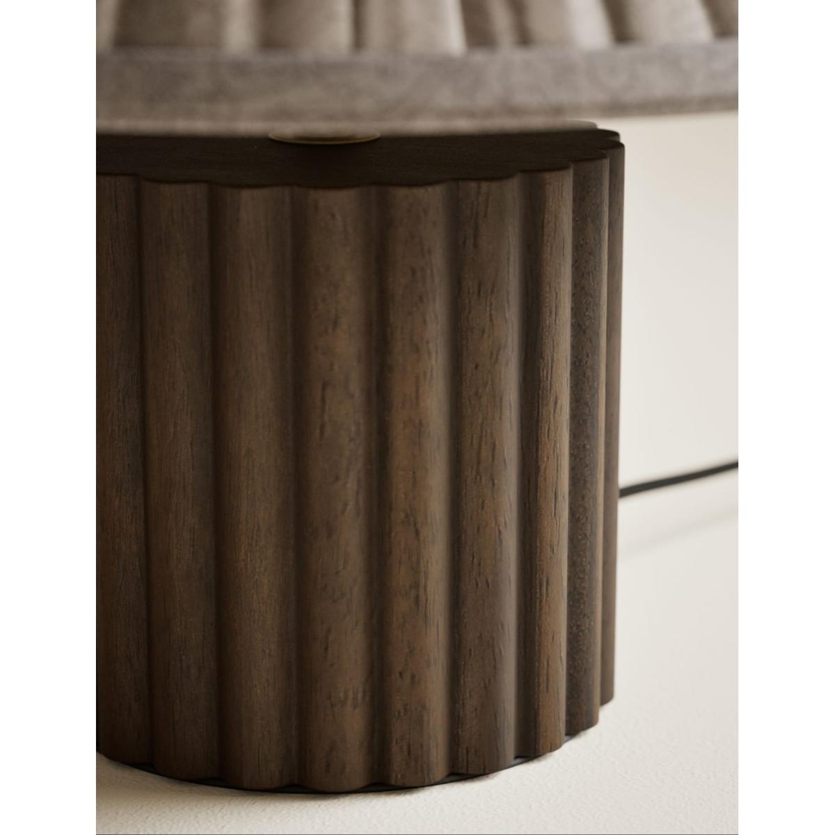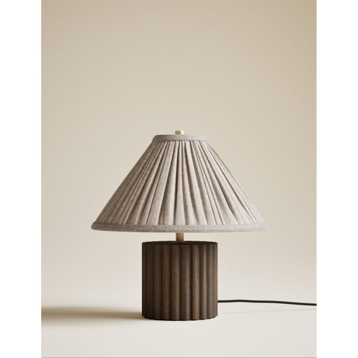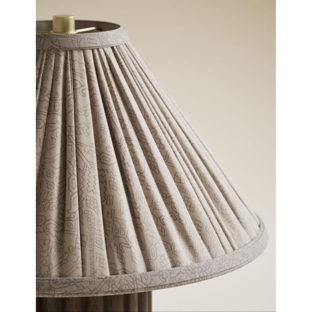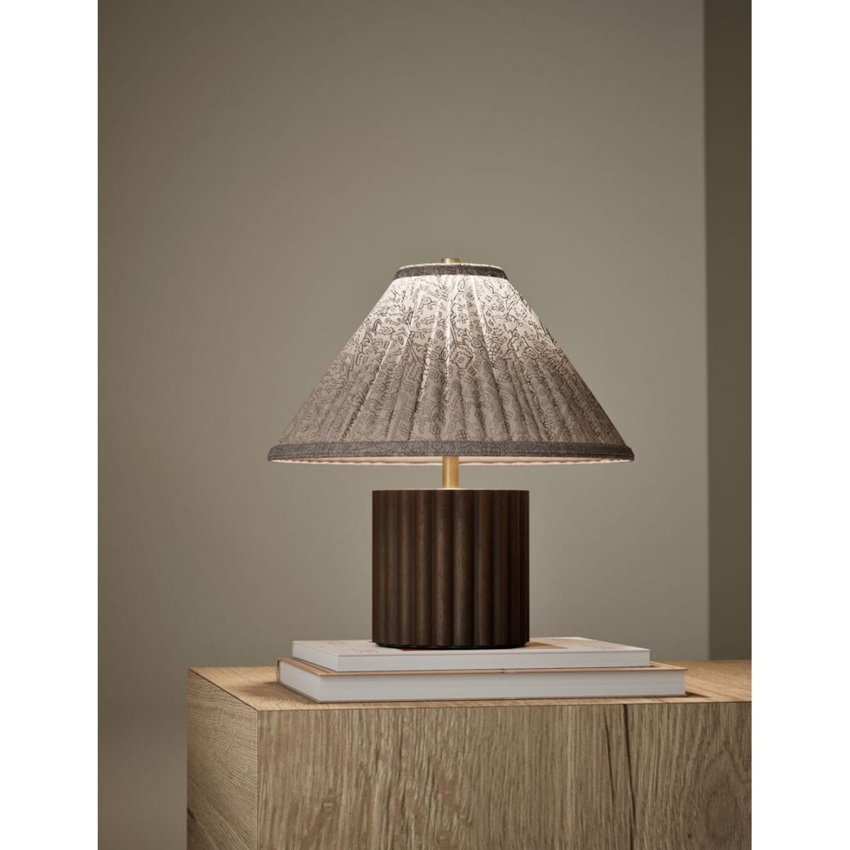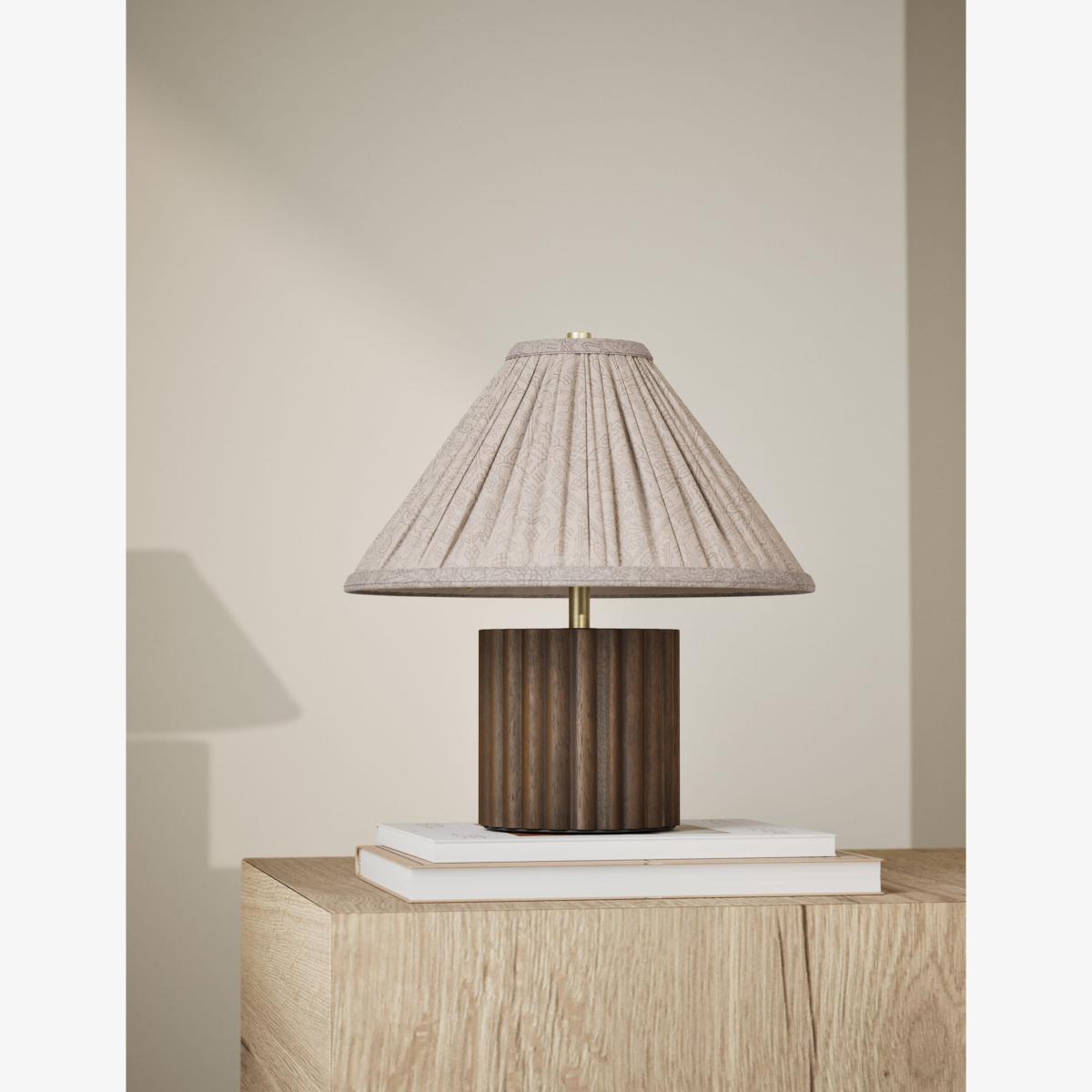 This unusual table lamp offers a striking blend of natural texture and contemporary design. Its cylindrical base is crafted from chunky, ribbed wood. The pleated fabric shade features a tonal geometric pattern, adding a layer of visual interest.