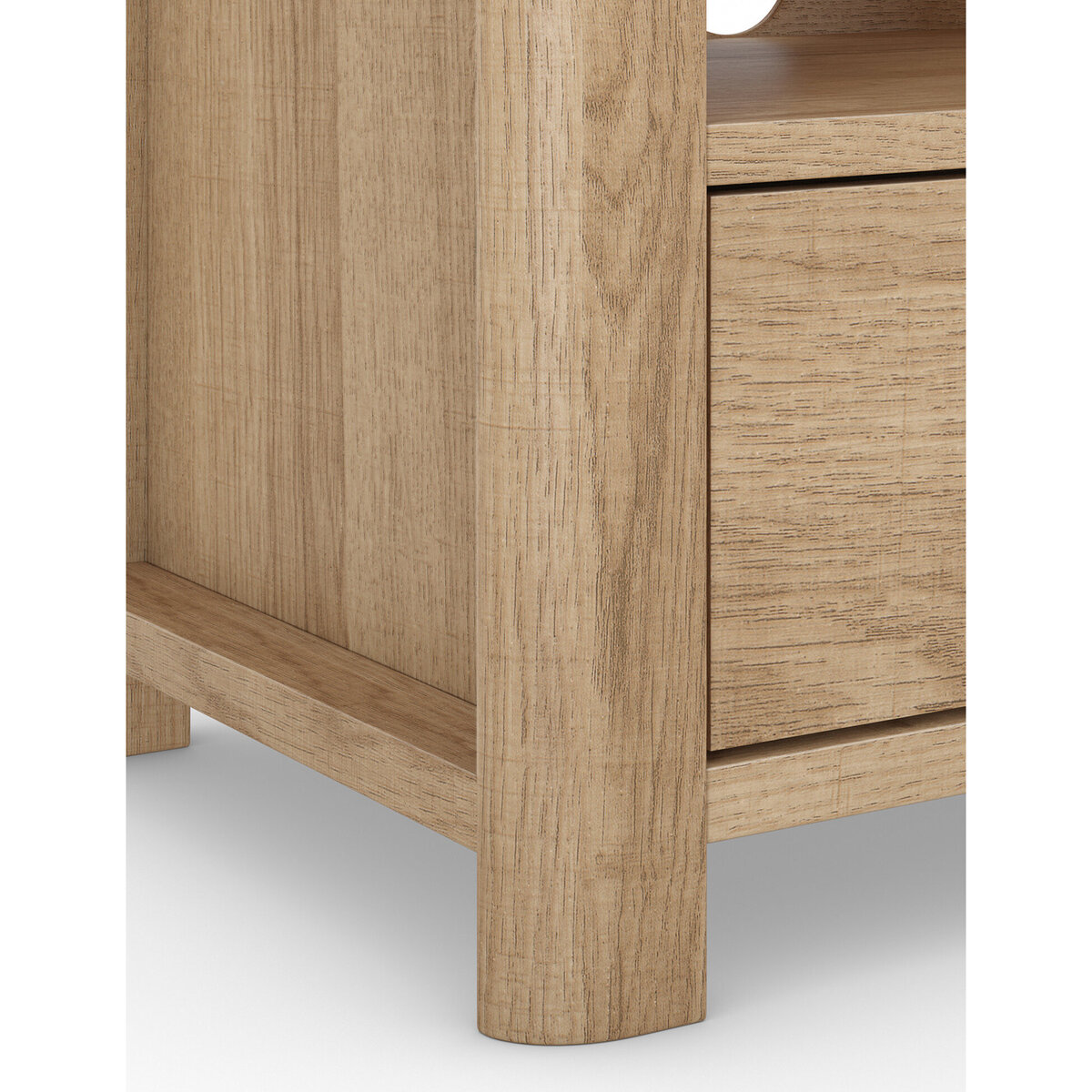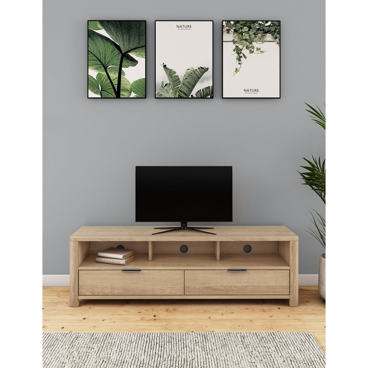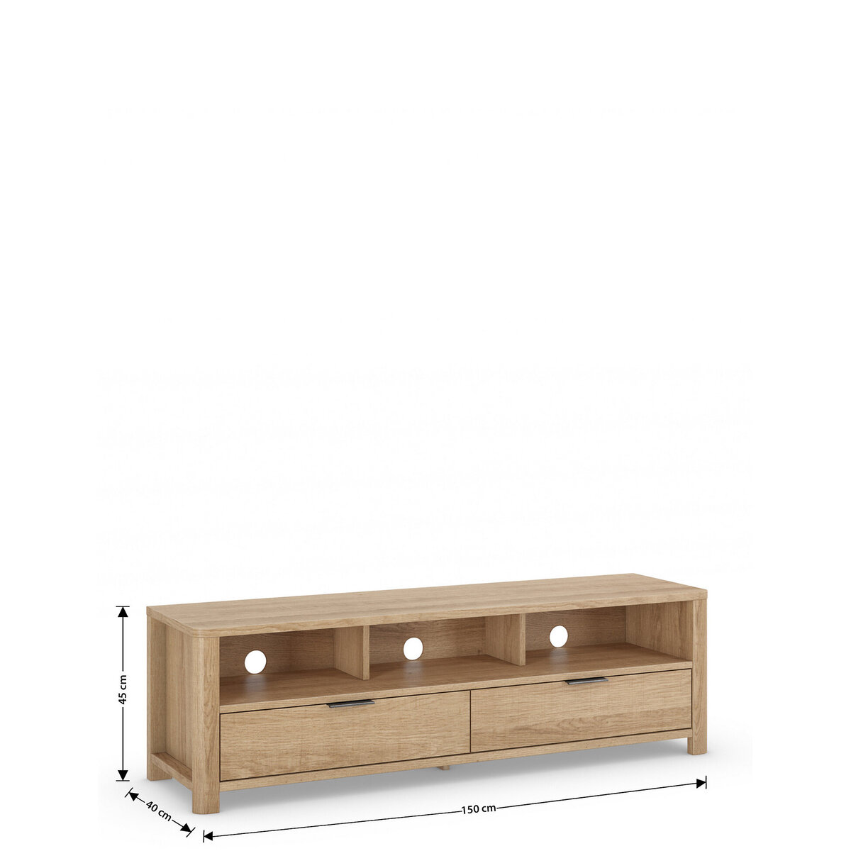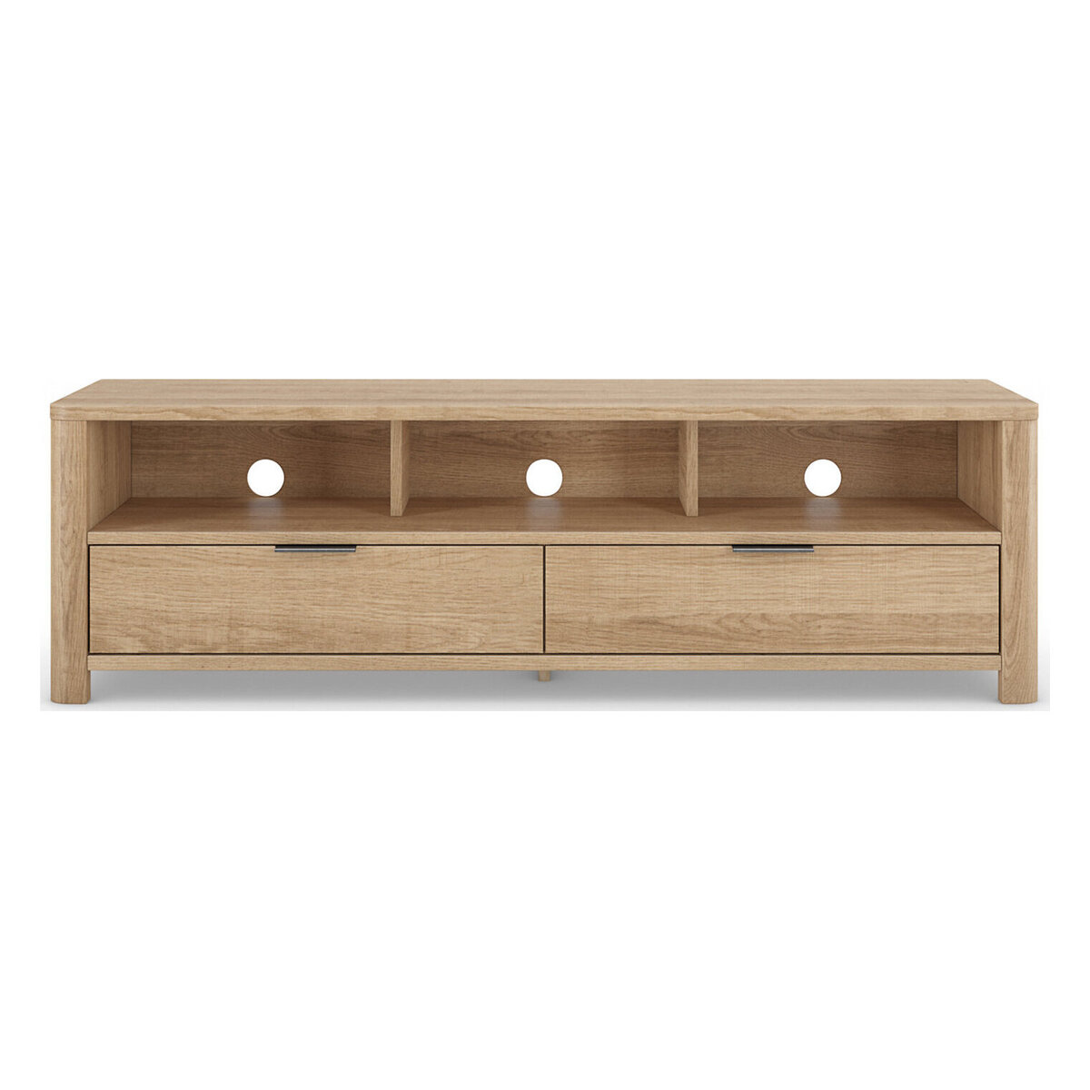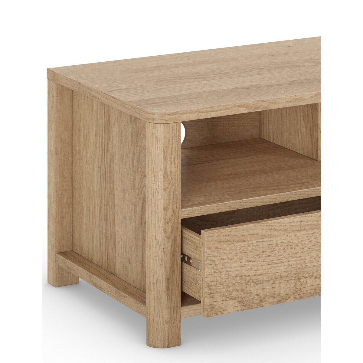 With its clean lines and contemporary styling, the Cora TV unit is ideal for modern interiors. This oak-effect piece includes three shelves with cable outlets for effortless installation. Below, the two storage drawers feature minimalist handles for a sleek finish. Browse our range of coordinating Cora pieces for more inspiration.
