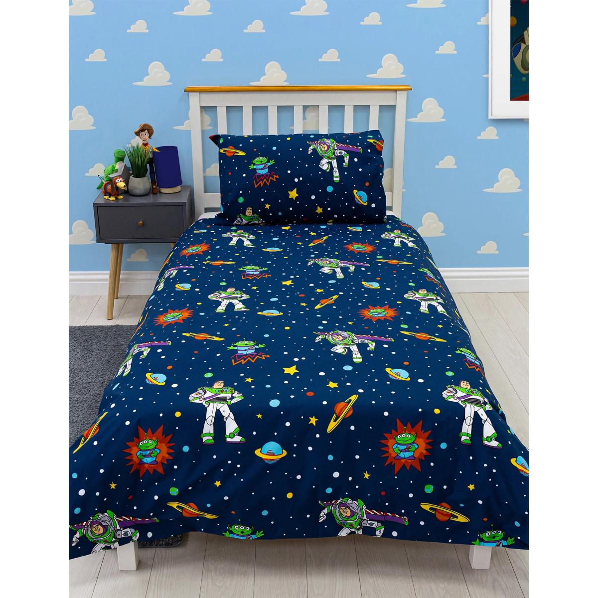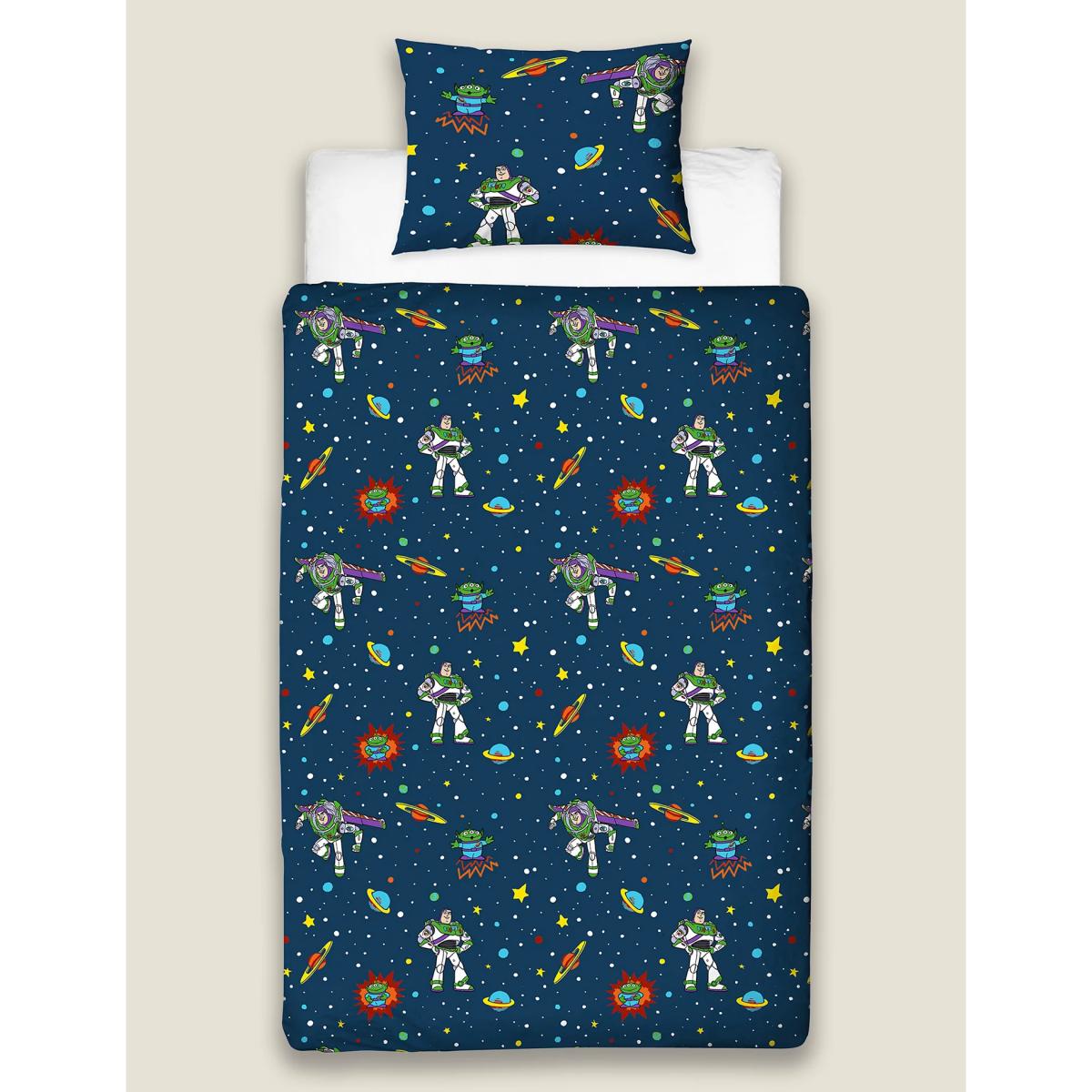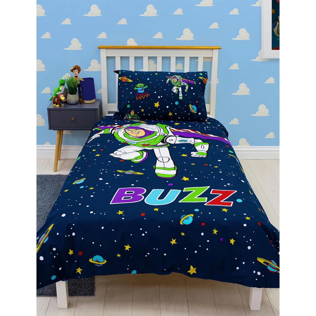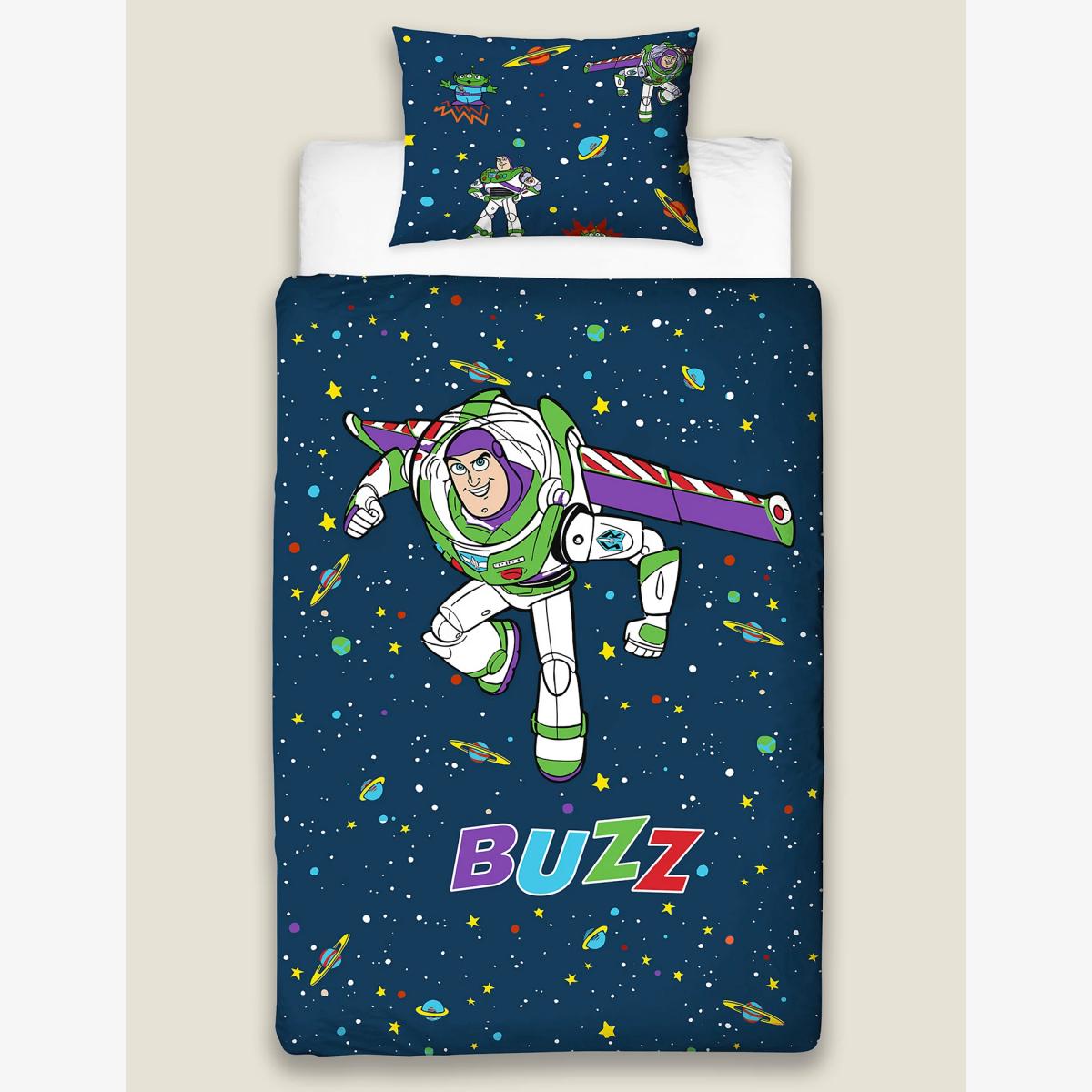 To infinity and the land of nod! This cotton-blend bedding will set Toy Story™ fans up for a dreamy night's sleep. The single set comprises one duvet and a matching pillowcase. Both are reversible, with the cover featuring a bold Buzz graphic with his name printed in colourful letters.