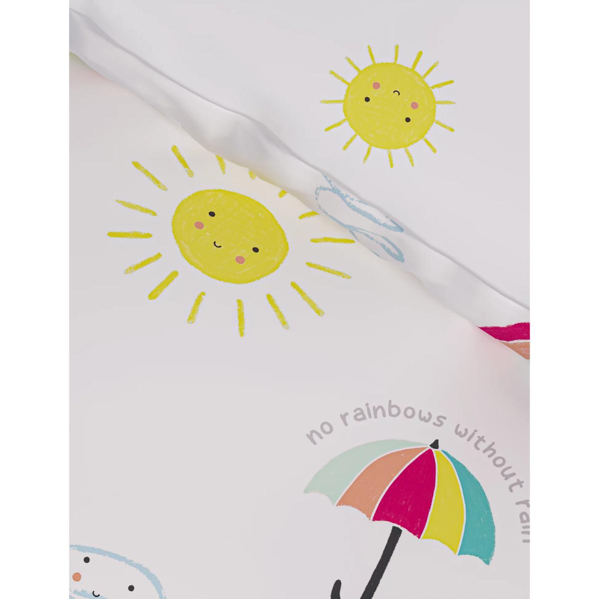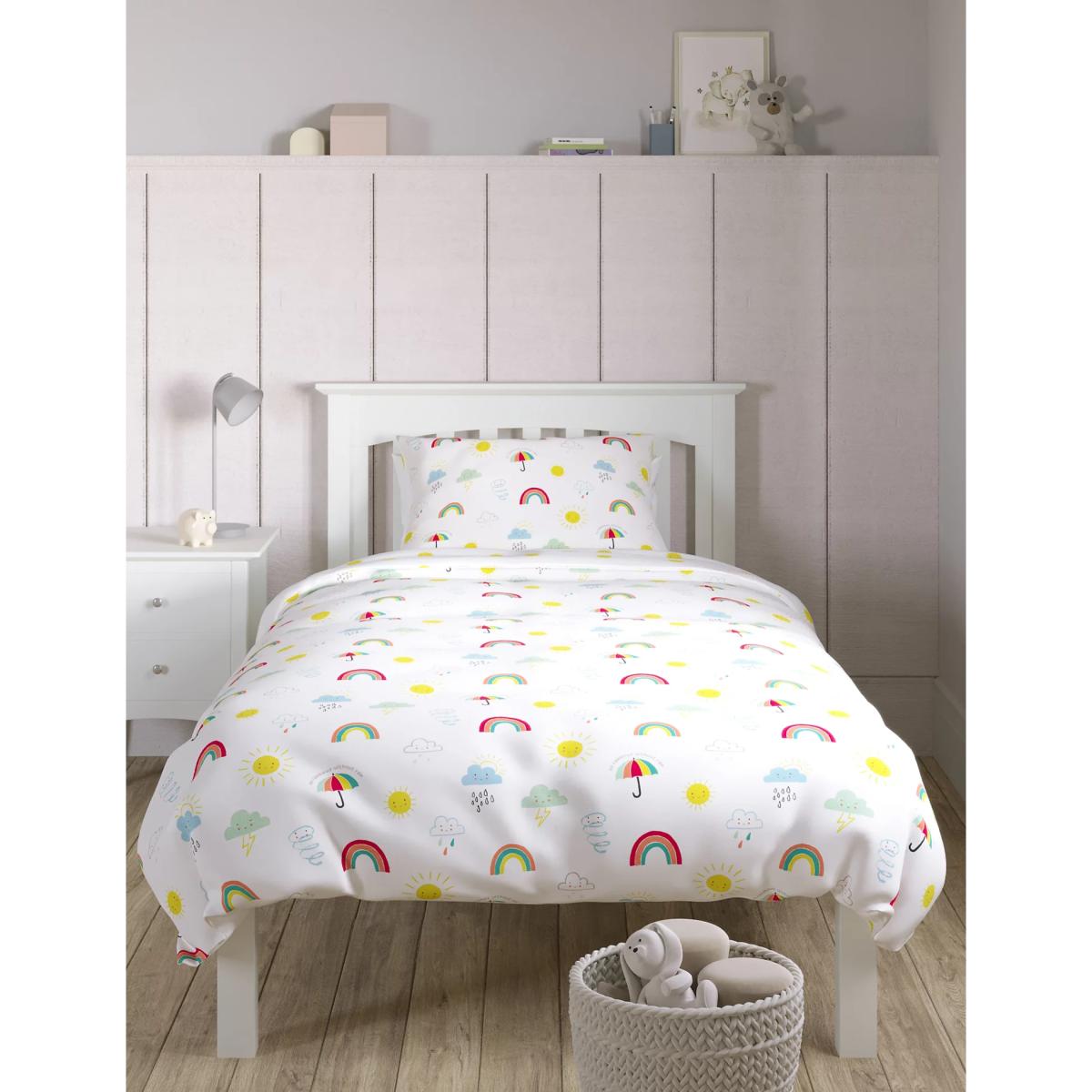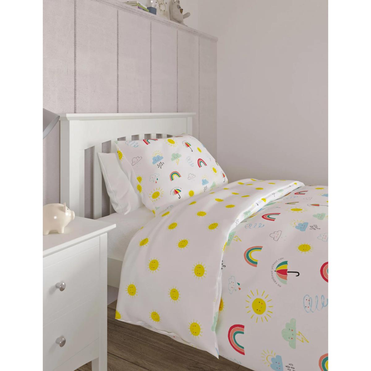 Kids will sleep well, whatever the weather, with this cotton-blend bedding set. Practical zip fastenings make changing your bedclothes easy, while the non-iron fabric allows for quick laundering. The colourful weather-themed print includes sun, rain, rainbows and clouds, and the reverse has a fun sunshine pattern so you can instantly refresh the look of their bedroom. Our StayNew™ technology keeps the colour and finish looking fresh, wash after wash.