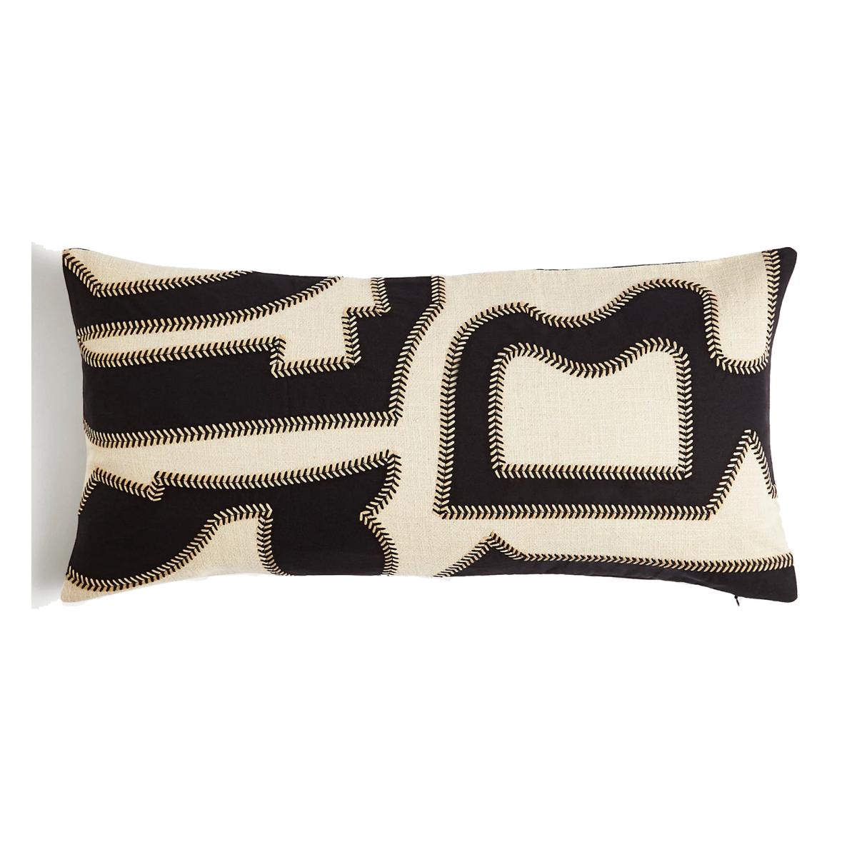 I love this bolster cushion for adding a contemporary touch to both modern and eclectic interiors. Its black mix design offers versatility, working well against neutral sofas or beds, while the embroidered detailing adds a subtle layer of texture and visual interest. It’s perfect for styling on a sofa, armchair, or even layered along a bed to create a relaxed and curated look. Practical tips include pairing it with solid-coloured cushions for contrast or mixing with other textured fabrics to enhance its graphic pattern. This cushion combines style with functionality, offering a chic accent that’s easy to incorporate into a variety of settings.