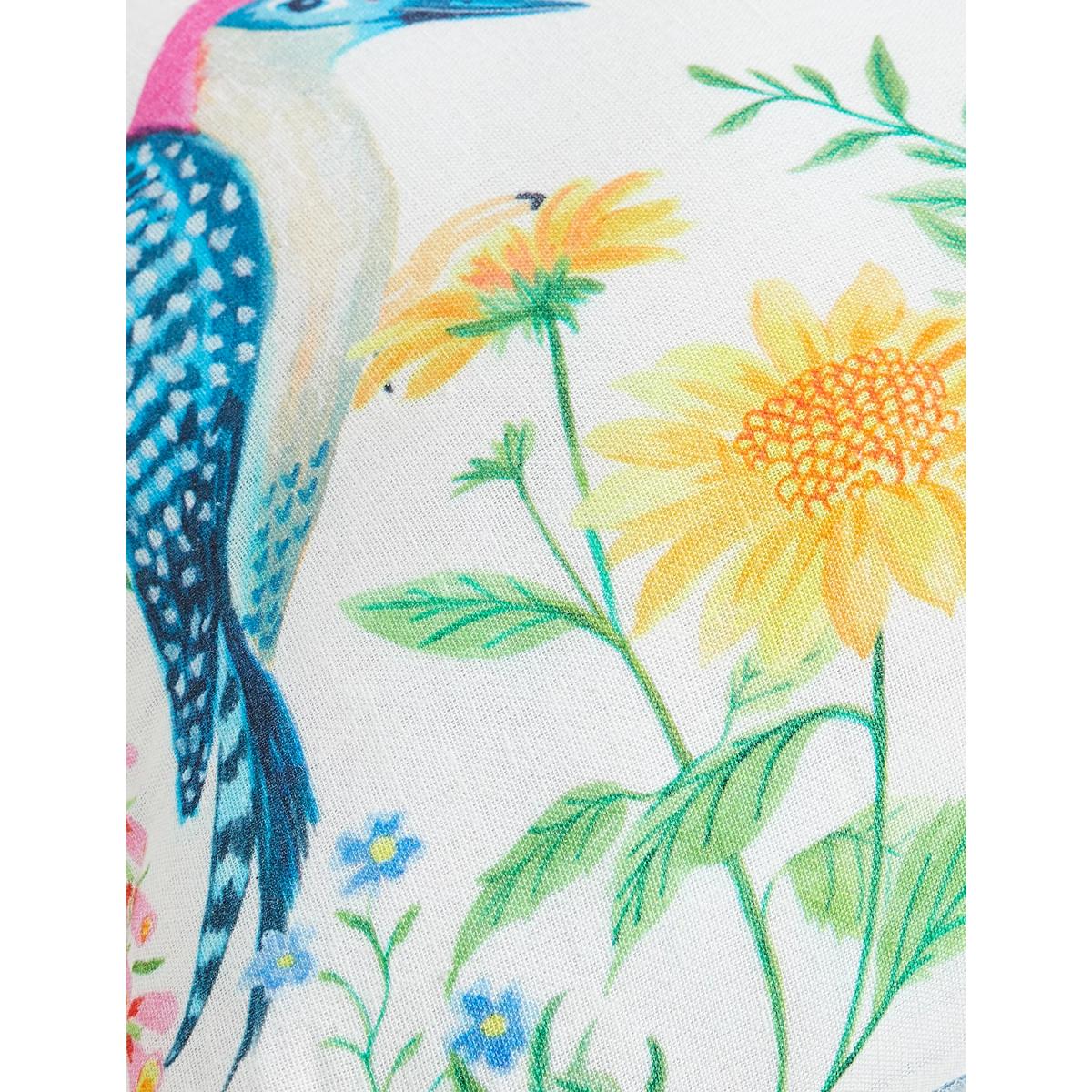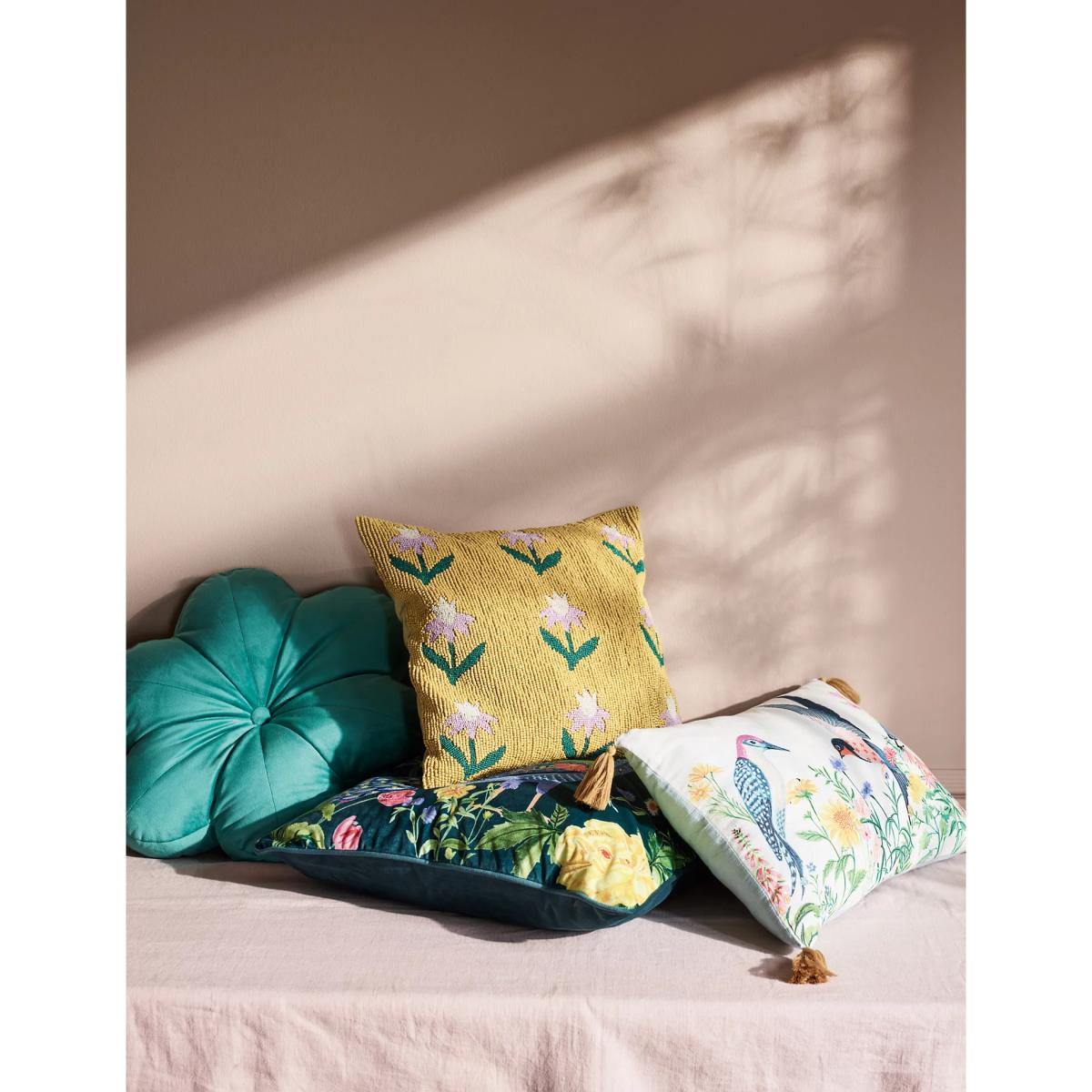 This bolster cushion is adorned with enchanting birds and flowers, and is made from a mix of cotton and linen. It comes in a medium size with a plain reverse and is finished with elegant corner tassels.