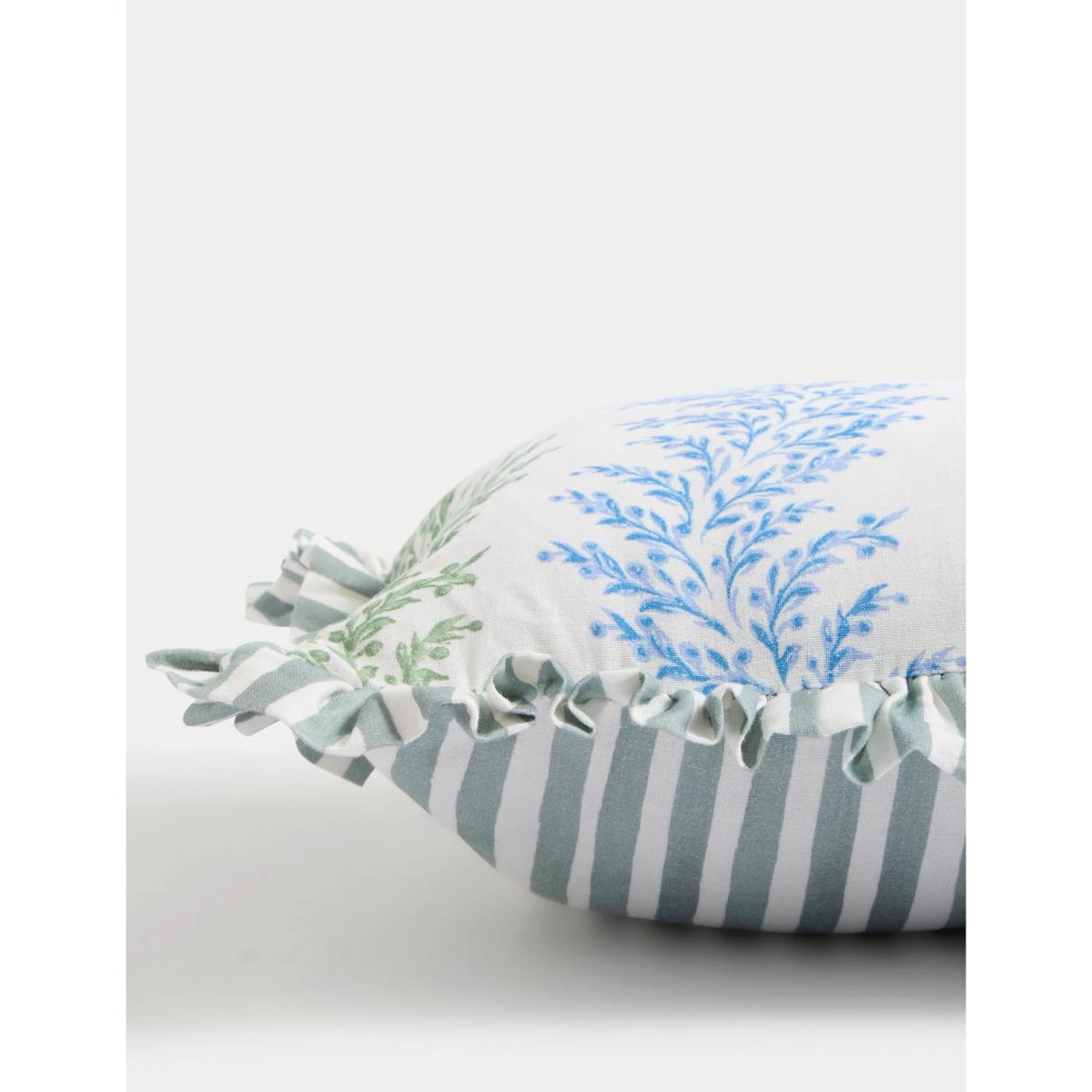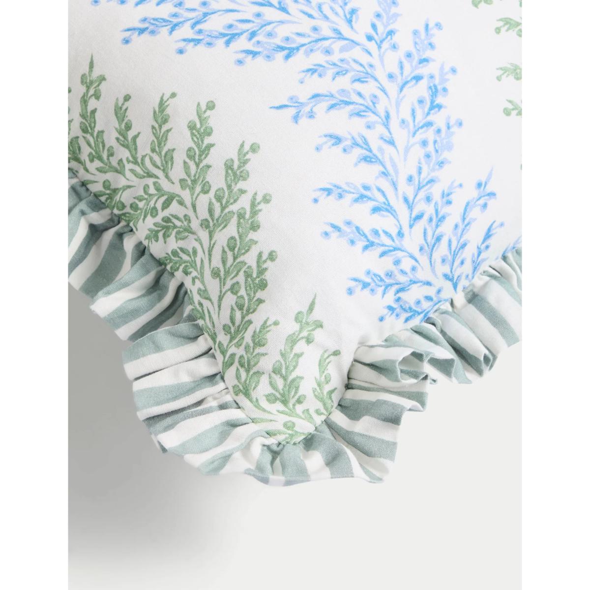 I love this cushion for adding a fresh, natural feel to a variety of interiors. Its mix of leaf and stripe patterns in calming green tones makes it versatile, working well in both relaxed coastal and countryside schemes, as well as more contemporary modern spaces. The cotton-rich fabric offers durability and comfort, making it ideal for lounges or bedrooms. To style it effectively, consider pairing with neutral or complementary green tones, and layer with textured throws or other cushions in linen or woven fabrics for a curated, inviting look. Its playful fringed edge also adds a subtle touch of detail without overpowering the overall aesthetic.