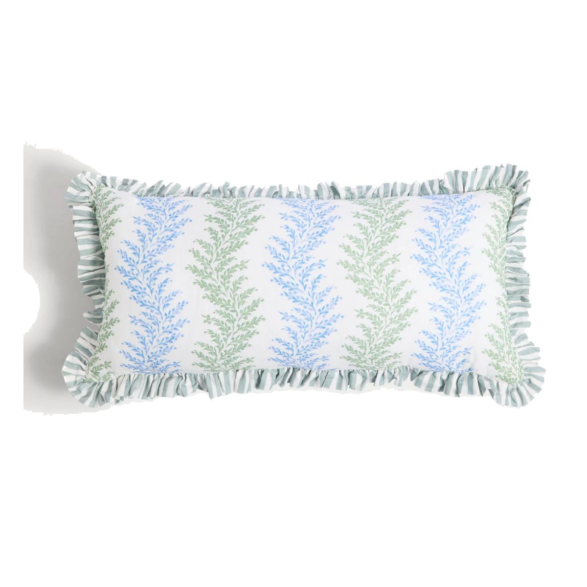 The fabric for this bolster cushion is rich in cotton, blended with a touch of linen for a sumptuous look. It's made in a timeless rectangular shape with a frilled trim at the edge. The reversible design has a delicate leaf motif on one side and a crisp striped pattern on the other.