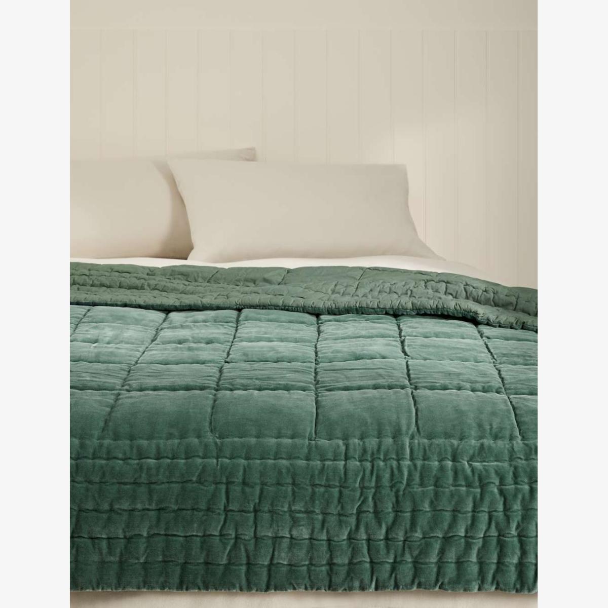 M&S Cotton Velvet Quilted Bedspread Green