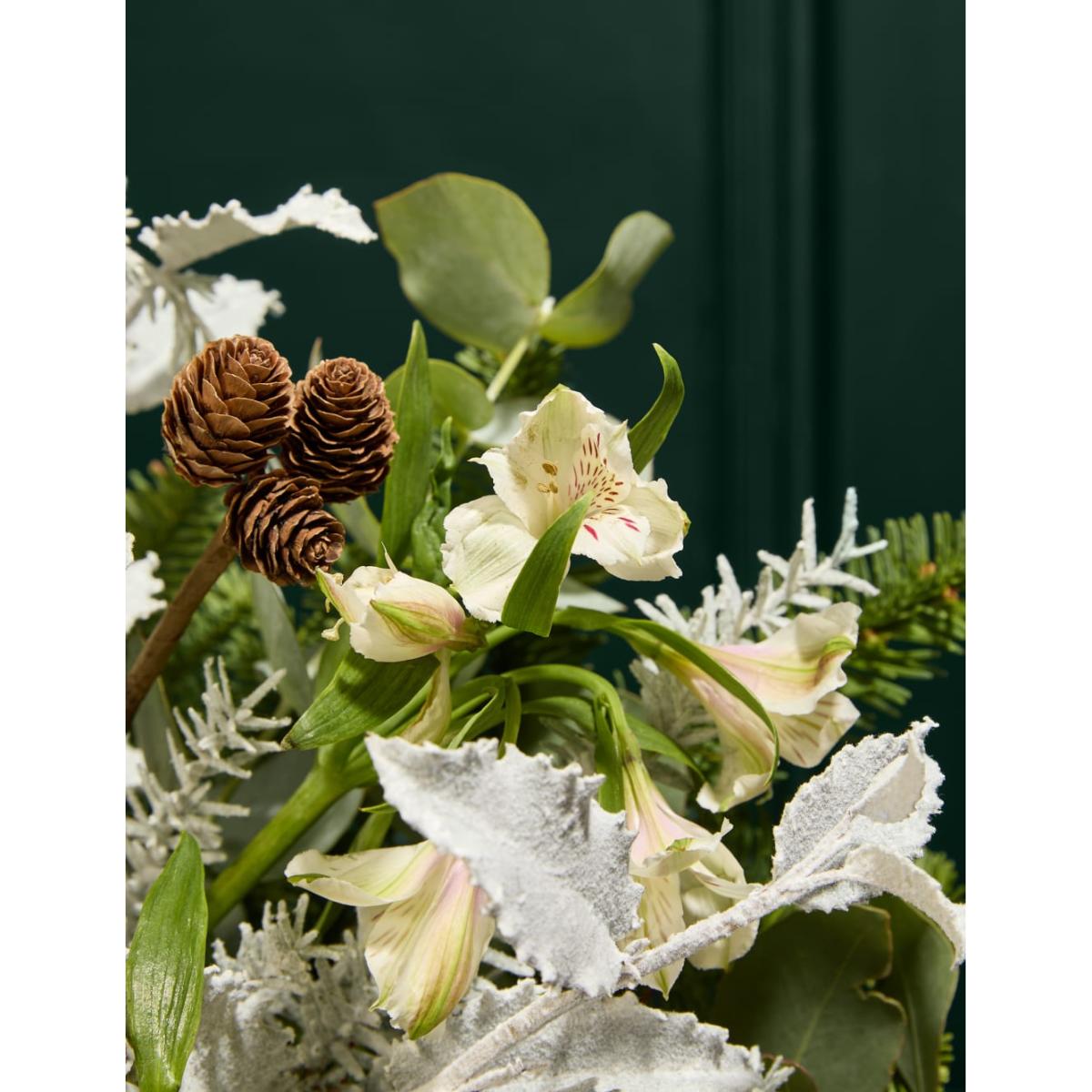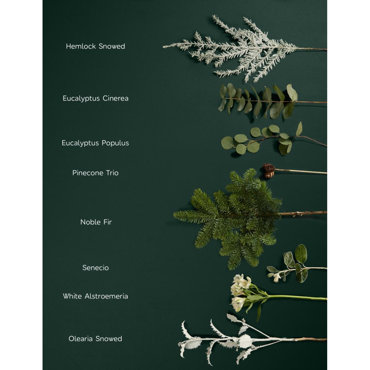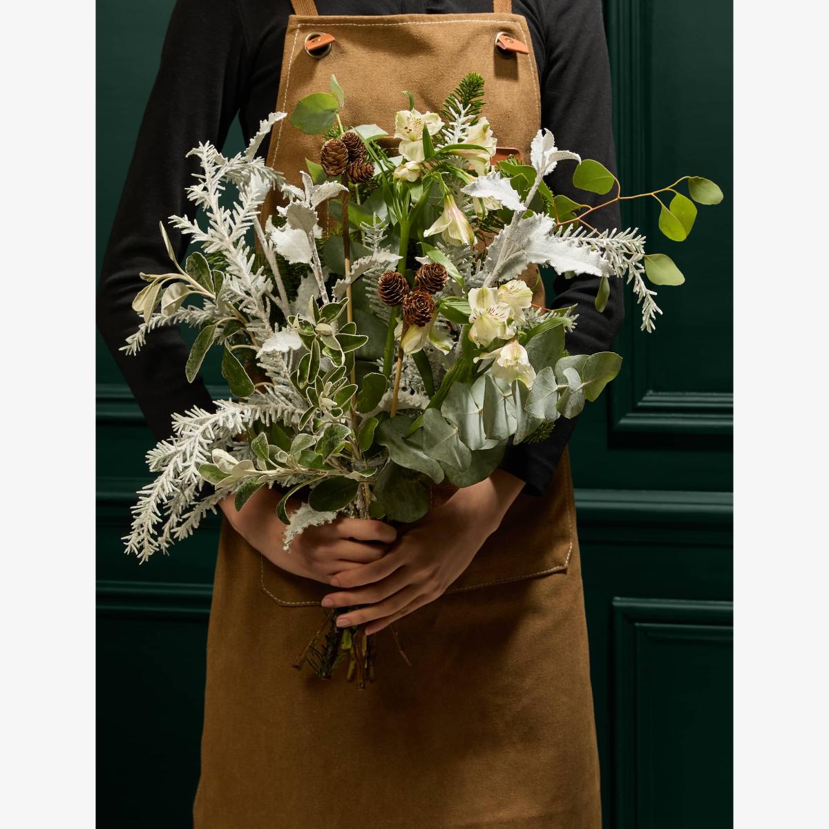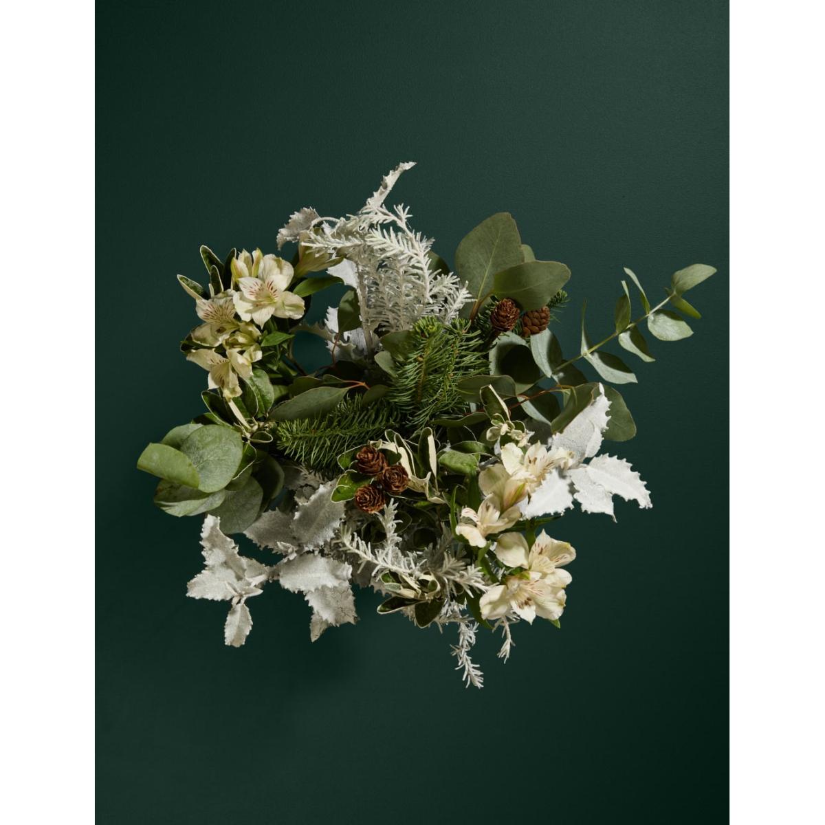 Treat yourself or someone you love this winter with this DIY festive table arrangement. The 16-stem selection includes alstroemeria, hemlocks and olearia daisies in soft, seasonal tones of white. Structure and greenery come from two types of eucalyptus and a frond of Nordman fir. Two mini trios of cones add a fun finishing touch. Colours may vary slightly throughout the season.