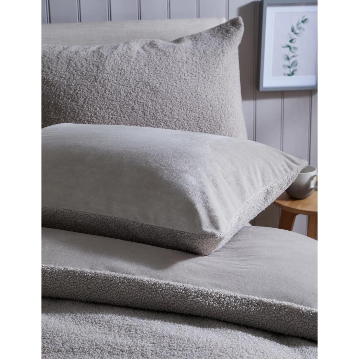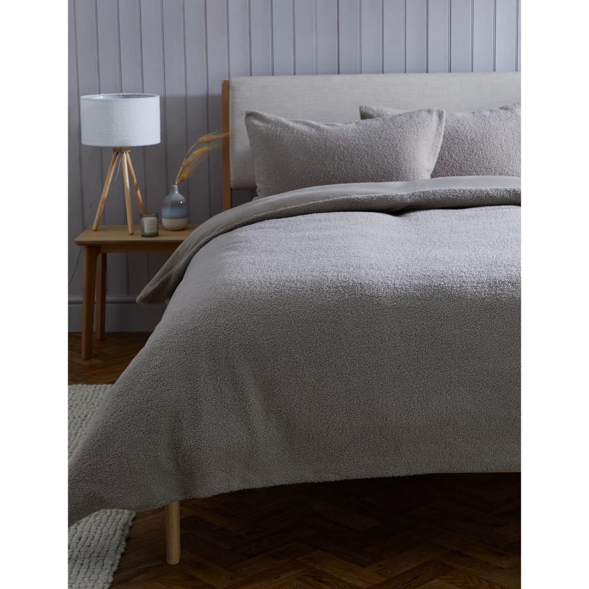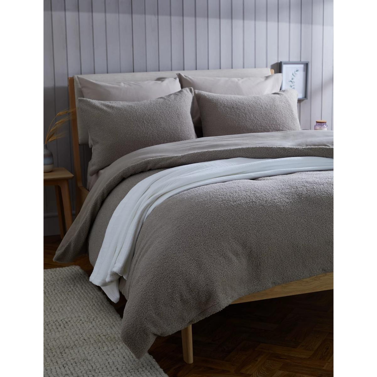 In supersoft teddy fleece, this plain bedding set will keep you cosy on chilly nights. Both the duvet cover and pillowcase have a bouclé texture on the reverse for an extra cosy feel. The single set comes with one standard pillowcase and the larger sets come with two.