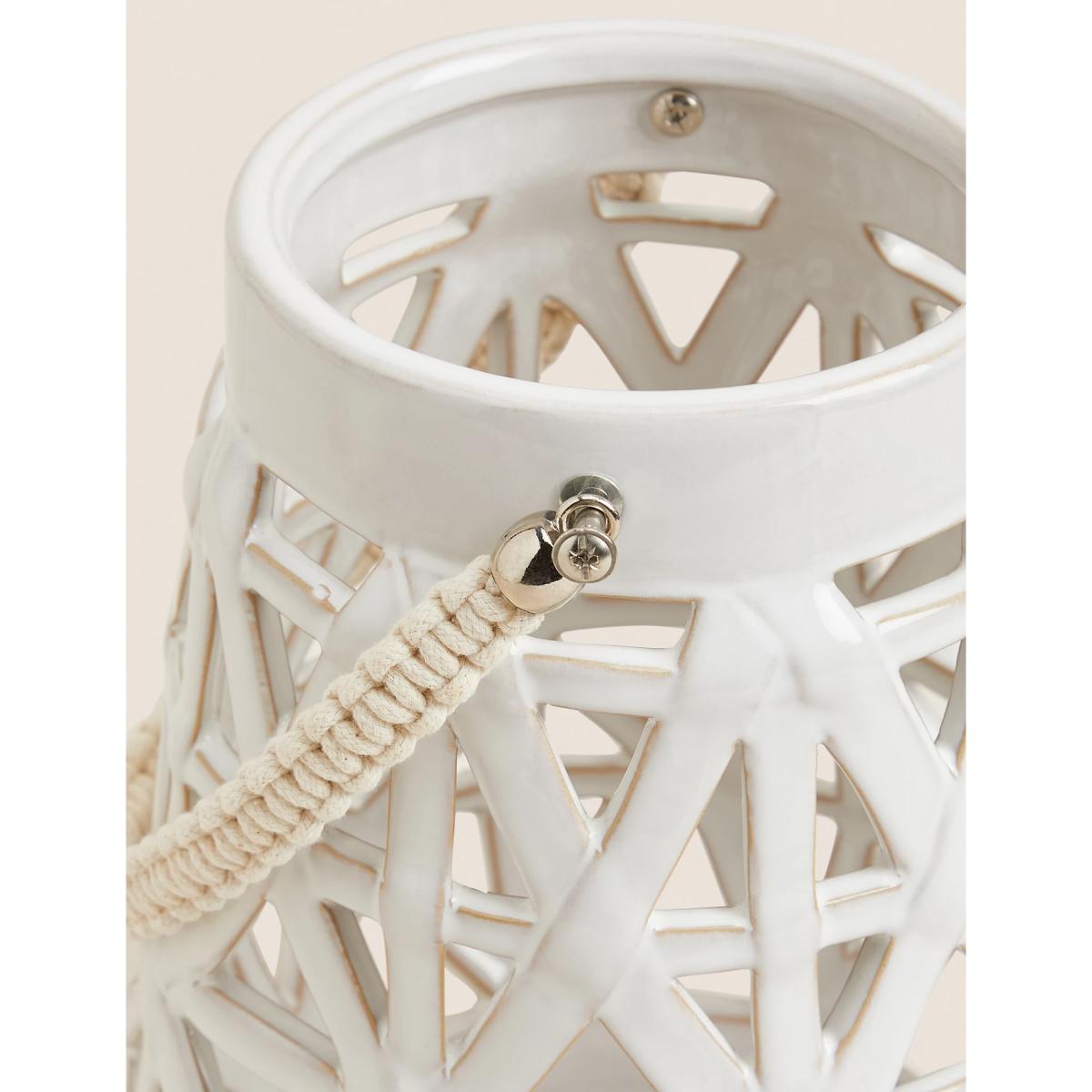 This ceramic lantern is made in a large size that's ideal for pillar candles. The cutaway design features a soft glaze that gives a subtle sheen. A braided rope handle adds an elegant finishing touch.