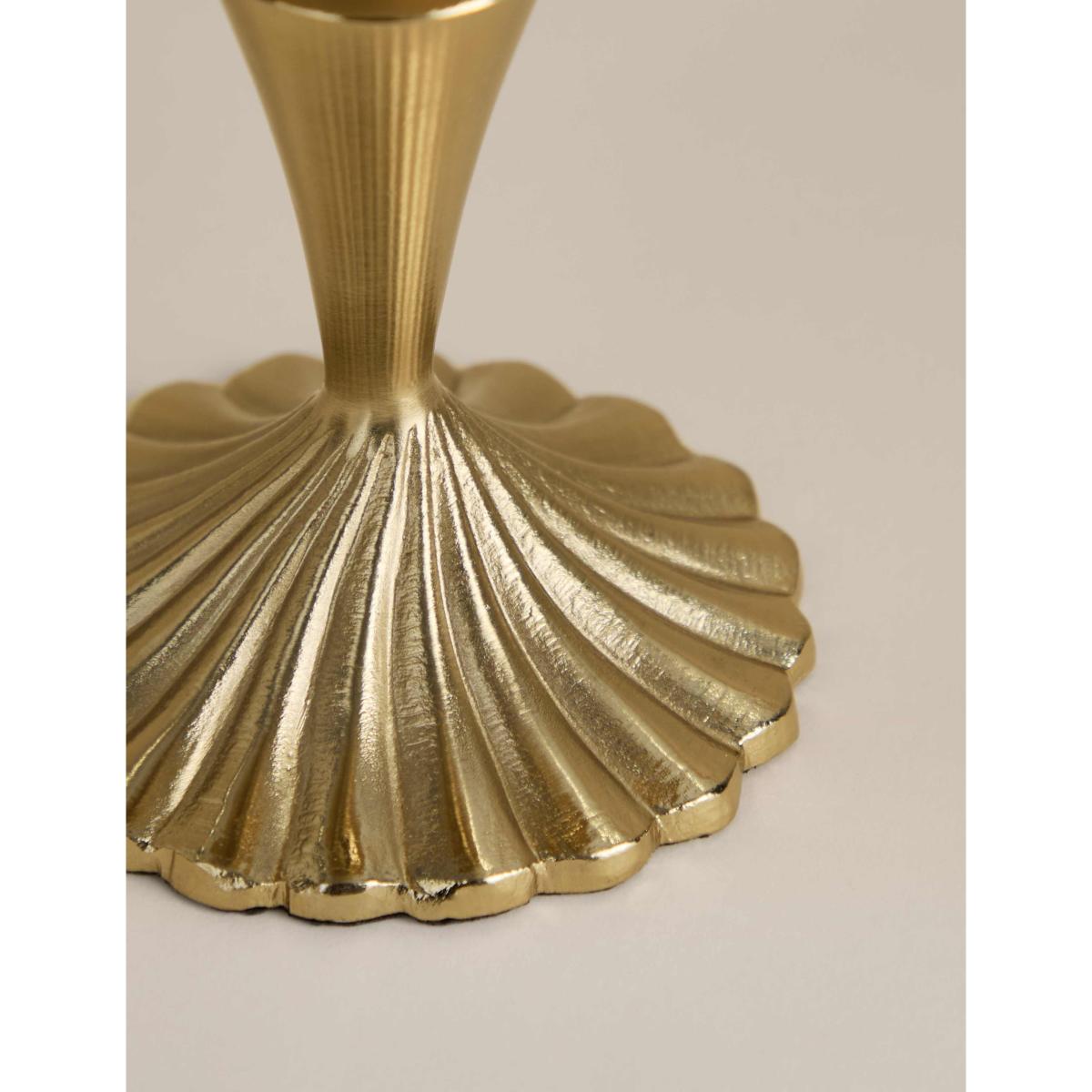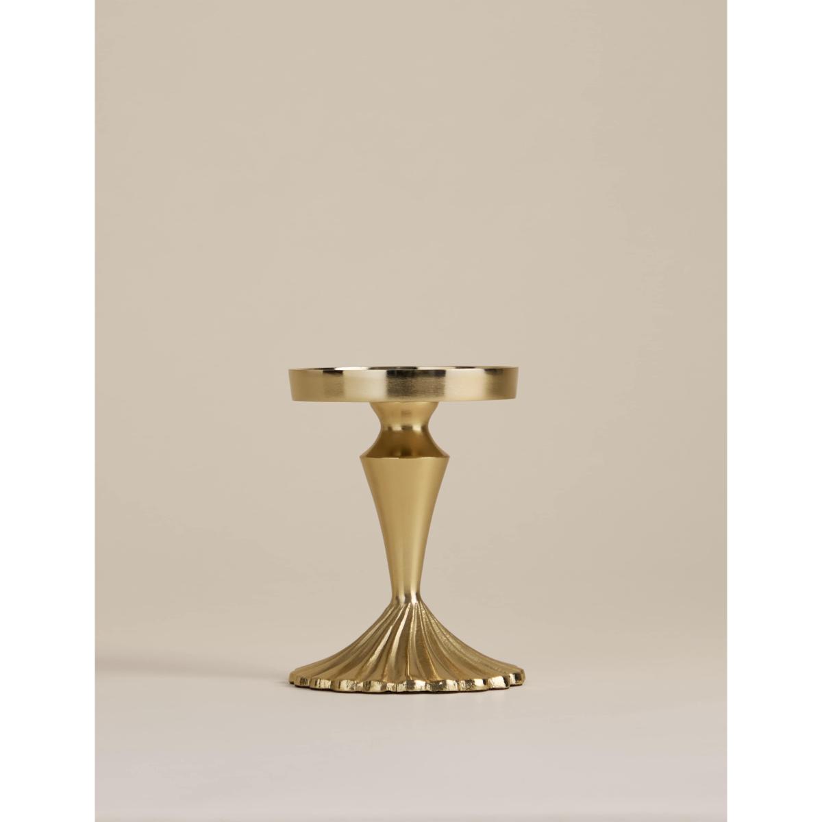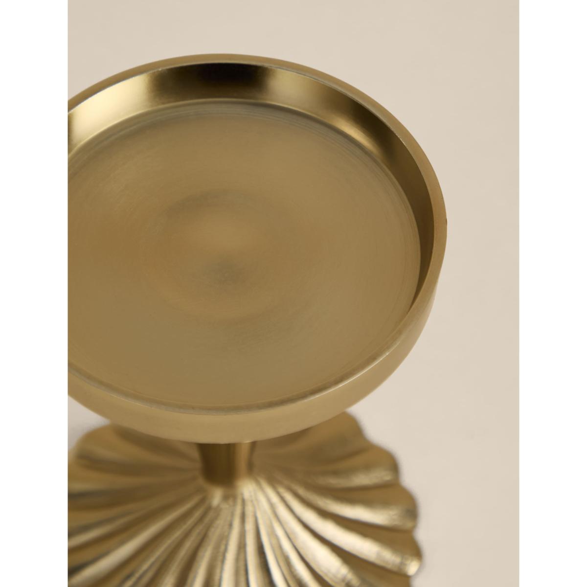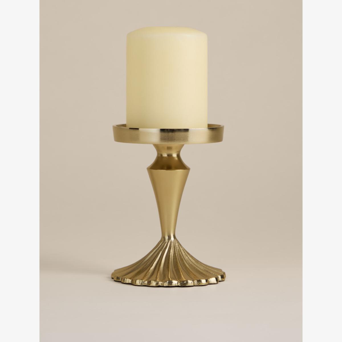 A textured, fluted base and sleek stem lend a sophisticated look to this pillar candle holder. It's made from gleaming metal and will make a stylish addition to a sideboard or as a table centrepiece. The wide top has dish-style sides to help contain melted wax.