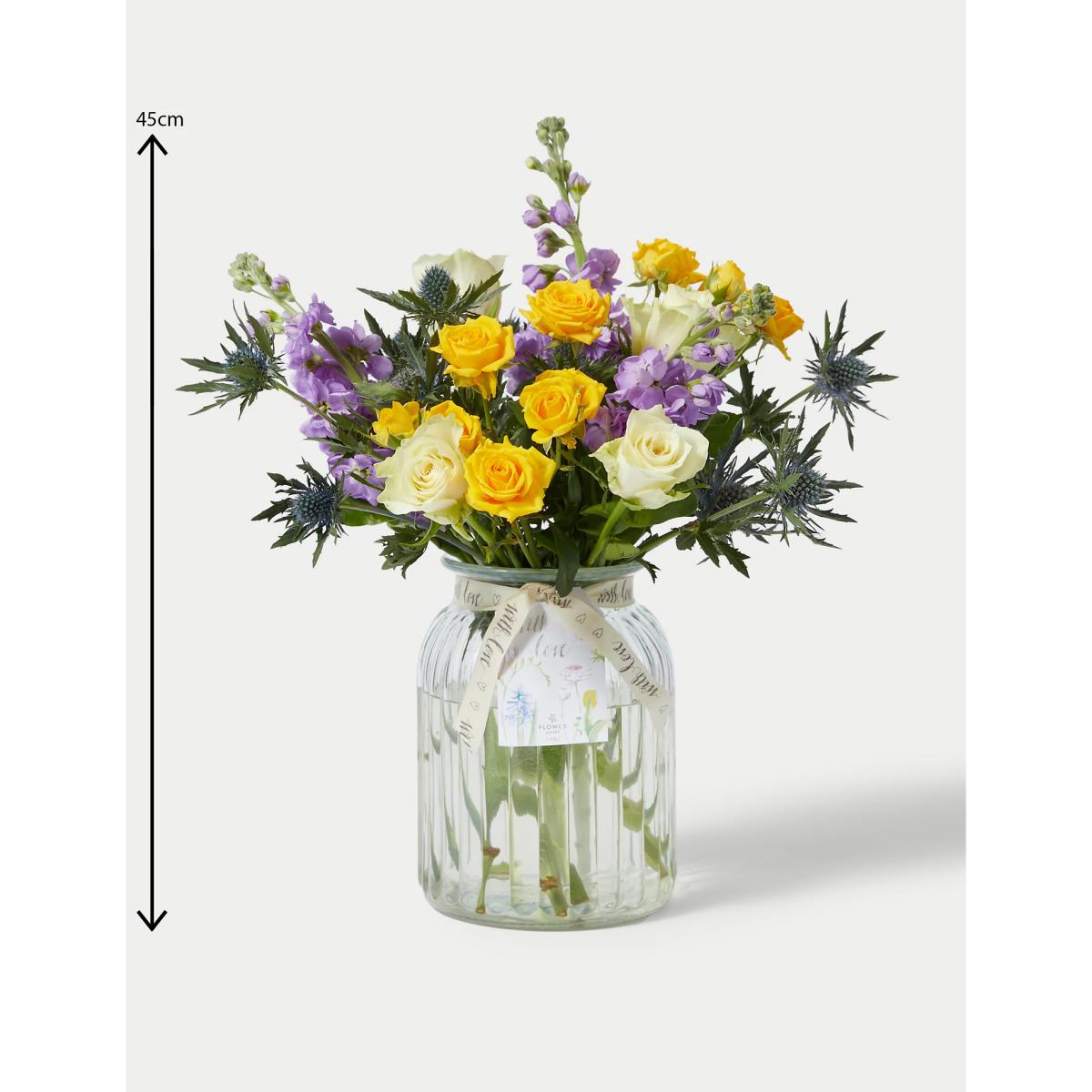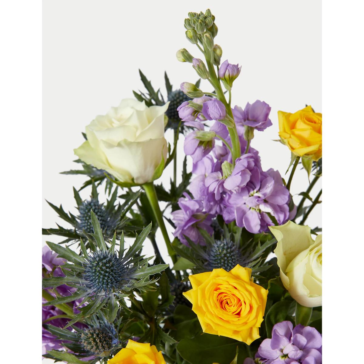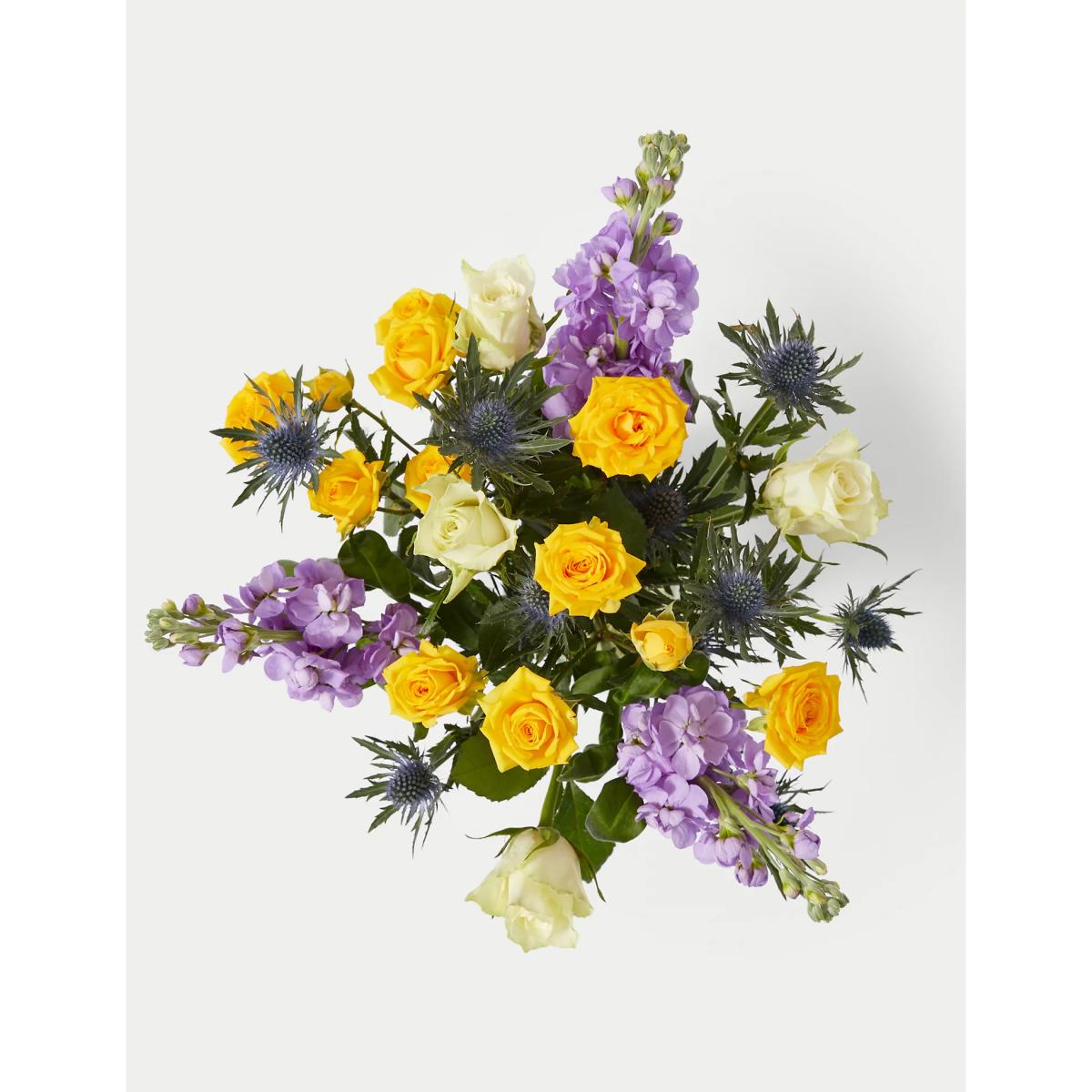 Spread the joy of Easter with this seasonal bouquet. This vibrant arrangement features a stunning combination of fragrant lilac stocks, elegant white roses, striking blue eryngium and statement yellow spray rose. Our bouquets are sent straight to the recipient's door, with an optional personalised message added to your gift. Colours may vary slightly throughout the season.